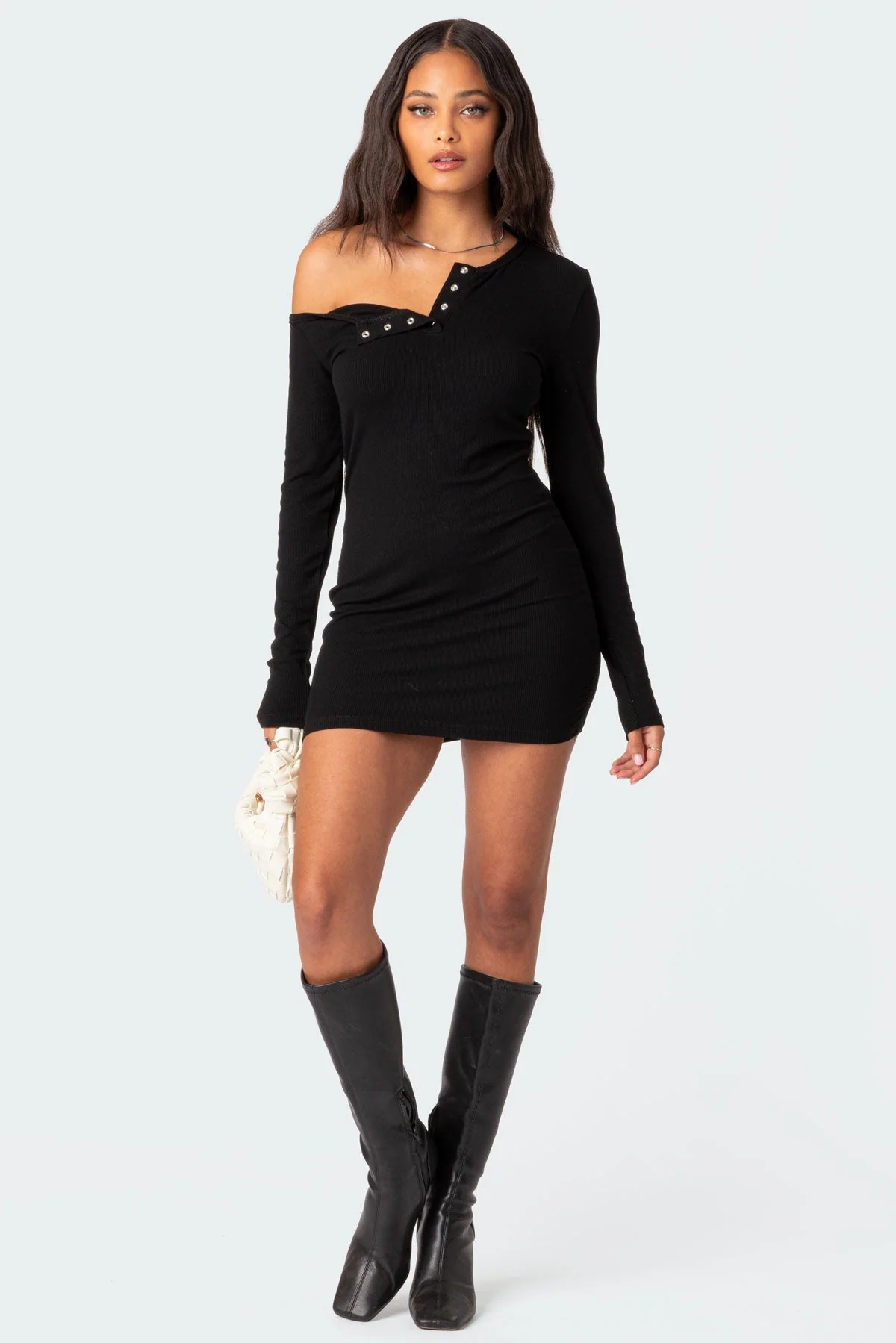 Indulge in chic sophistication with our Black Ribbed Asymmetric Mini Dress for women. Crafted from a blend of Rayon and Spandex, featuring front snap button closure, an asymmetric neckline, and long sleeves. This trendy dress is a versatile piece suitable for various occasions. Elevate your style effortlessly with this must-have wardrobe staple. Make a fashionable statement that sets you apart from the crowd. Care Instructions: Machine wash cold with like colors.