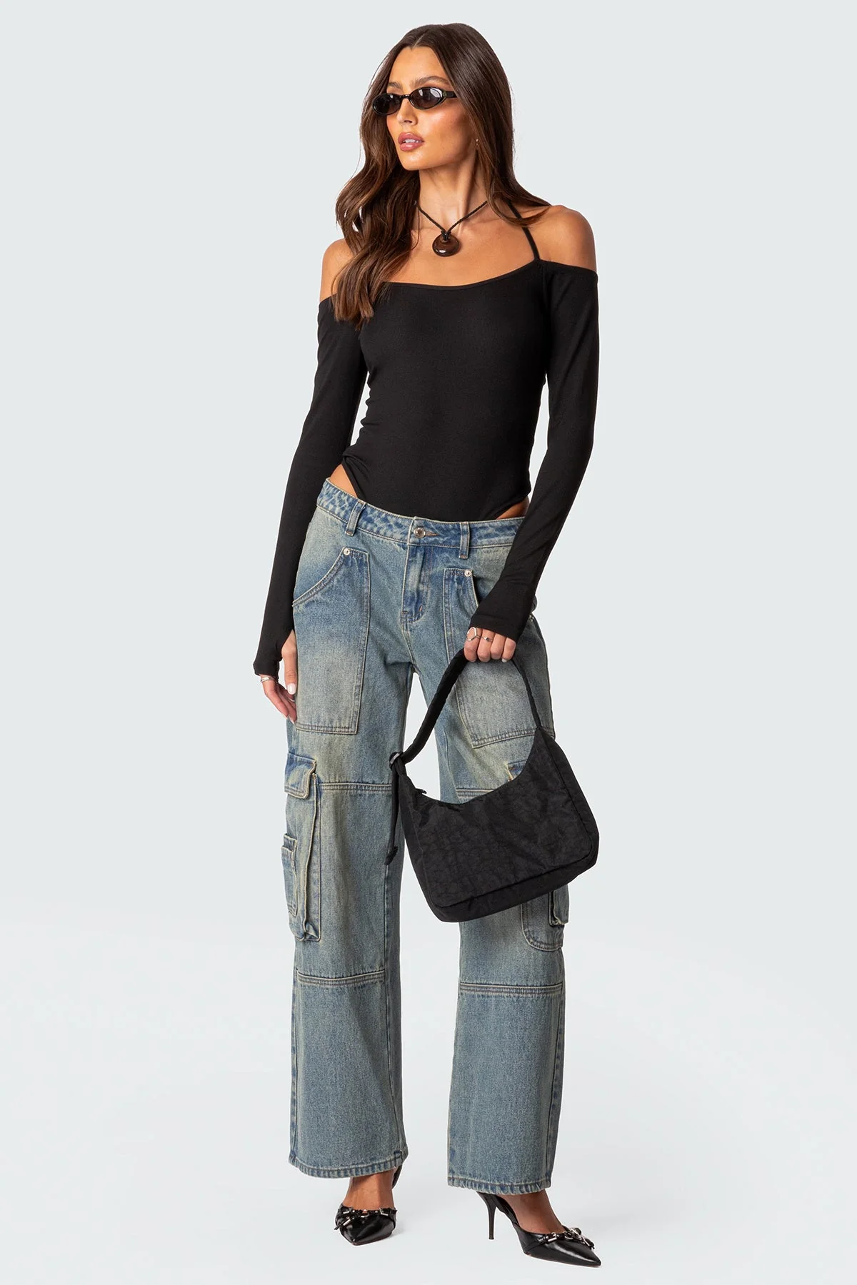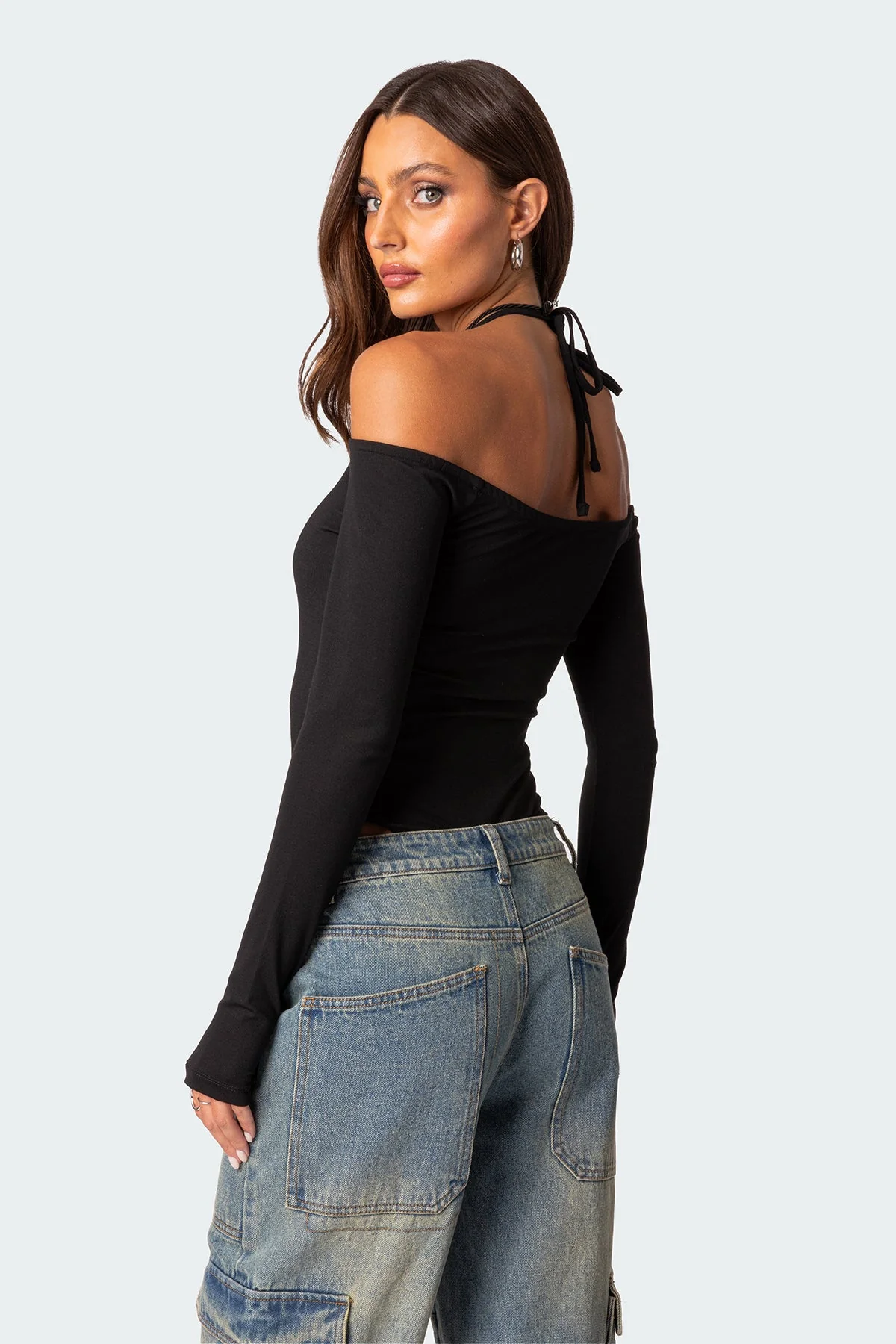 Discover the versatility and style of our Black Ribbed Halter Neck Bodysuit. This bodysuit features long sleeves, thumb holes, and an off-shoulder design for a trendy look. Made with a blend of Polyester and Spandex, it offers comfort and a flattering fit. Perfect for various occasions, this bodysuit is a must-have staple in your wardrobe. Available in multiple sizes.