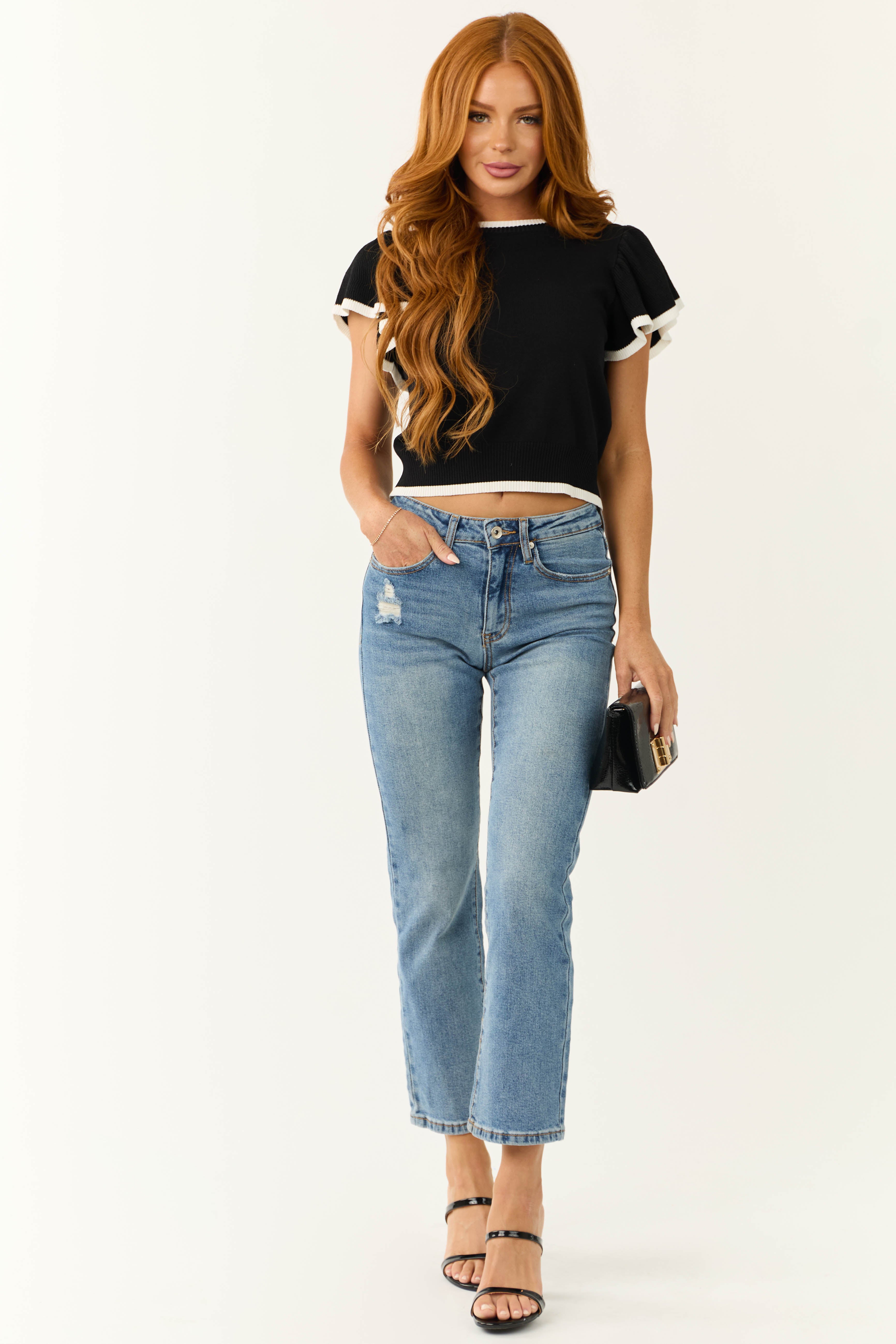 Stay stylish and cozy in this Black Ribbed Knit Ruffle Sleeve Sweater . Crafted from a stretchy ribbed knit fabric, this sweater features trendy ruffle sleeves and contrast Off White trim for a chic look. The banded hem adds a touch of sophistication. Available in sizes S, M, and L with dimensions that ensure a perfect fit. Made of 64% Viscose, 28% Polyester, and 8% Nylon. This versatile sweater is suitable for various occasions. Hand wash cold, line dry, and iron warm if necessary. Model is wearing a size Small.
