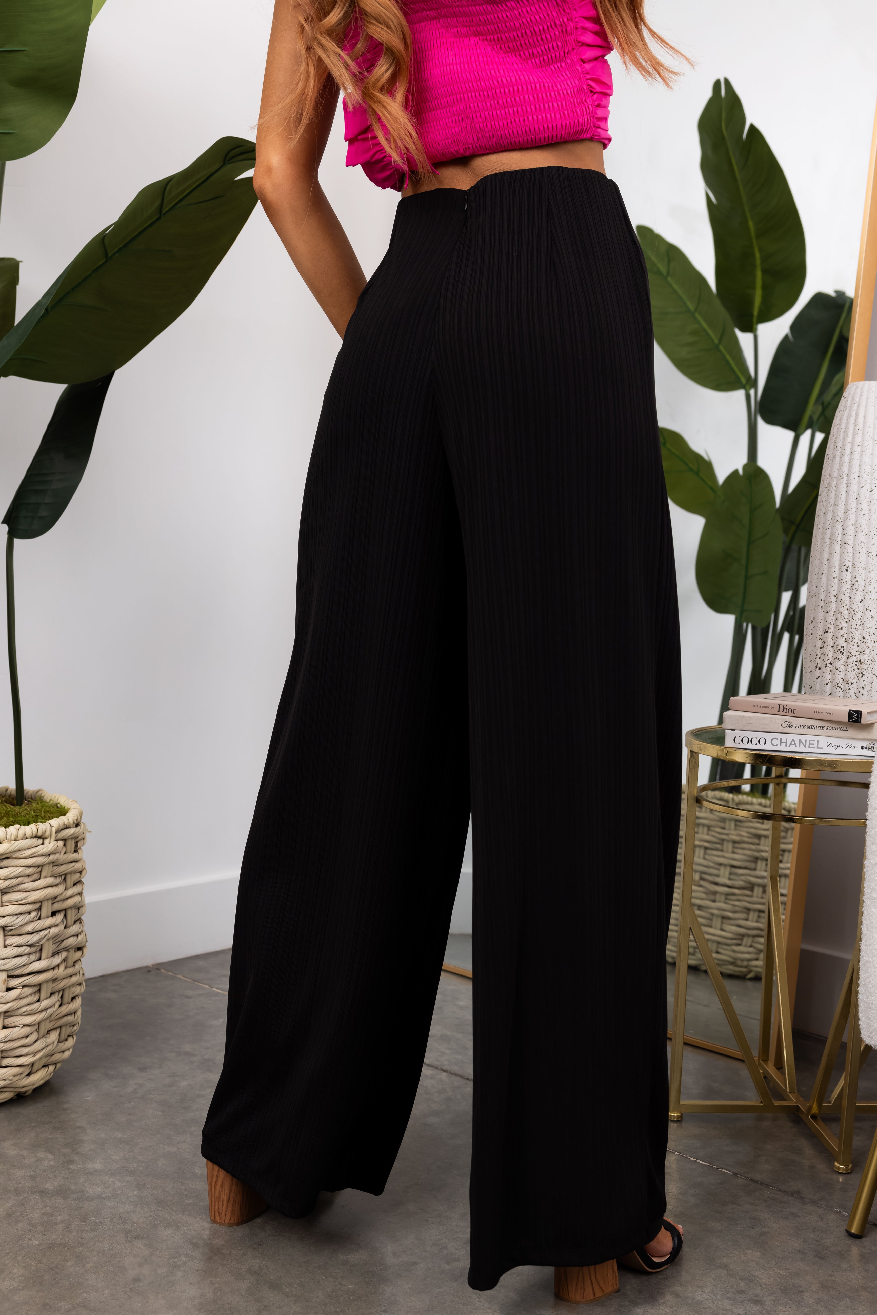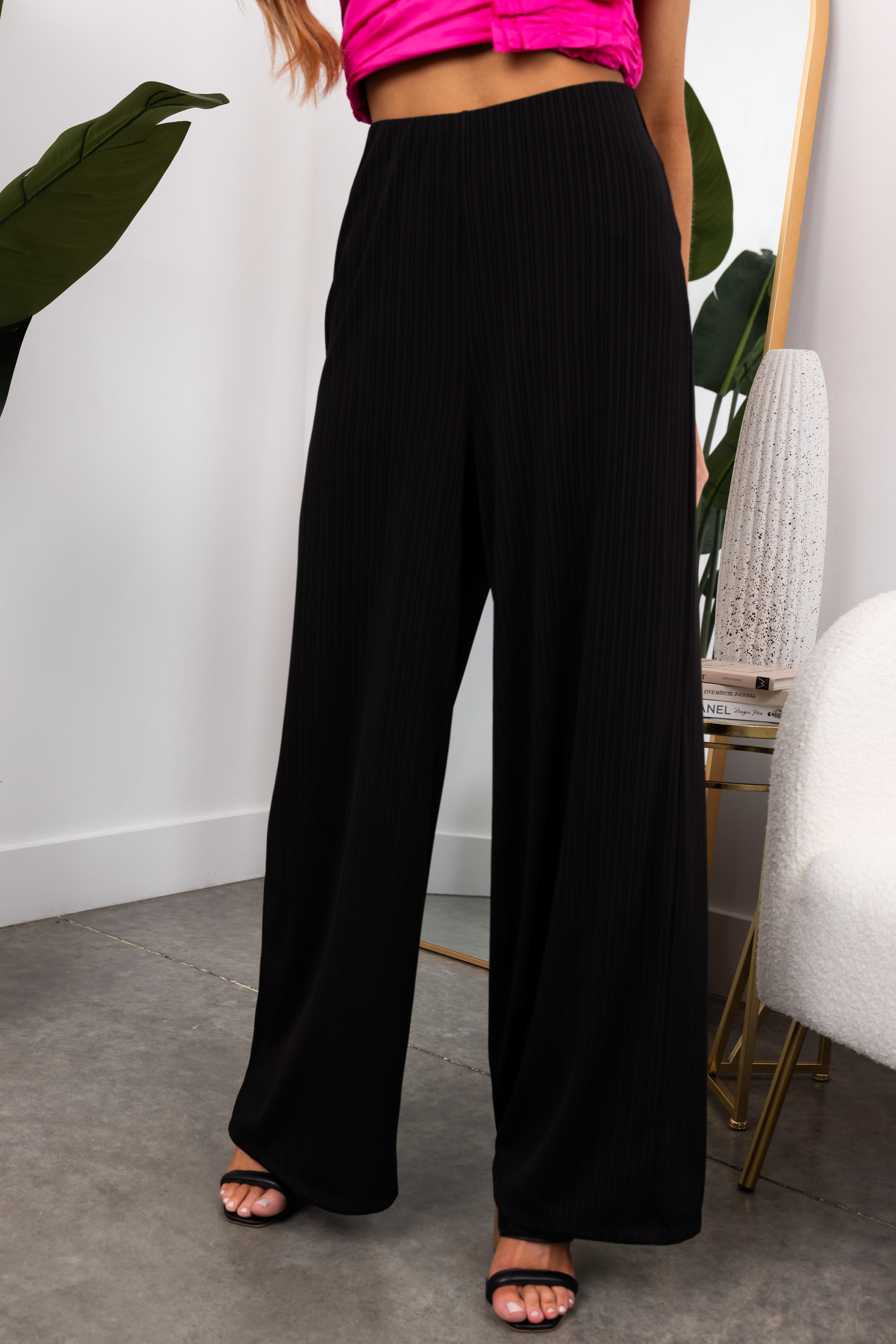 Stay chic and comfortable in these Black Ribbed Knit Wide Leg Pants + Sky. Crafted from a stretchy ribbed knit with an elastic waistband, these super high-waisted pants feature a back zipper for easy wear. Imported and made with 95% Polyester and 5% Spandex. Make a statement in these versatile pants suitable for casual, daytime, or work occasions. Care instructions: Hand wash cold, wash separately, hang to dry. Model is wearing a size Small.