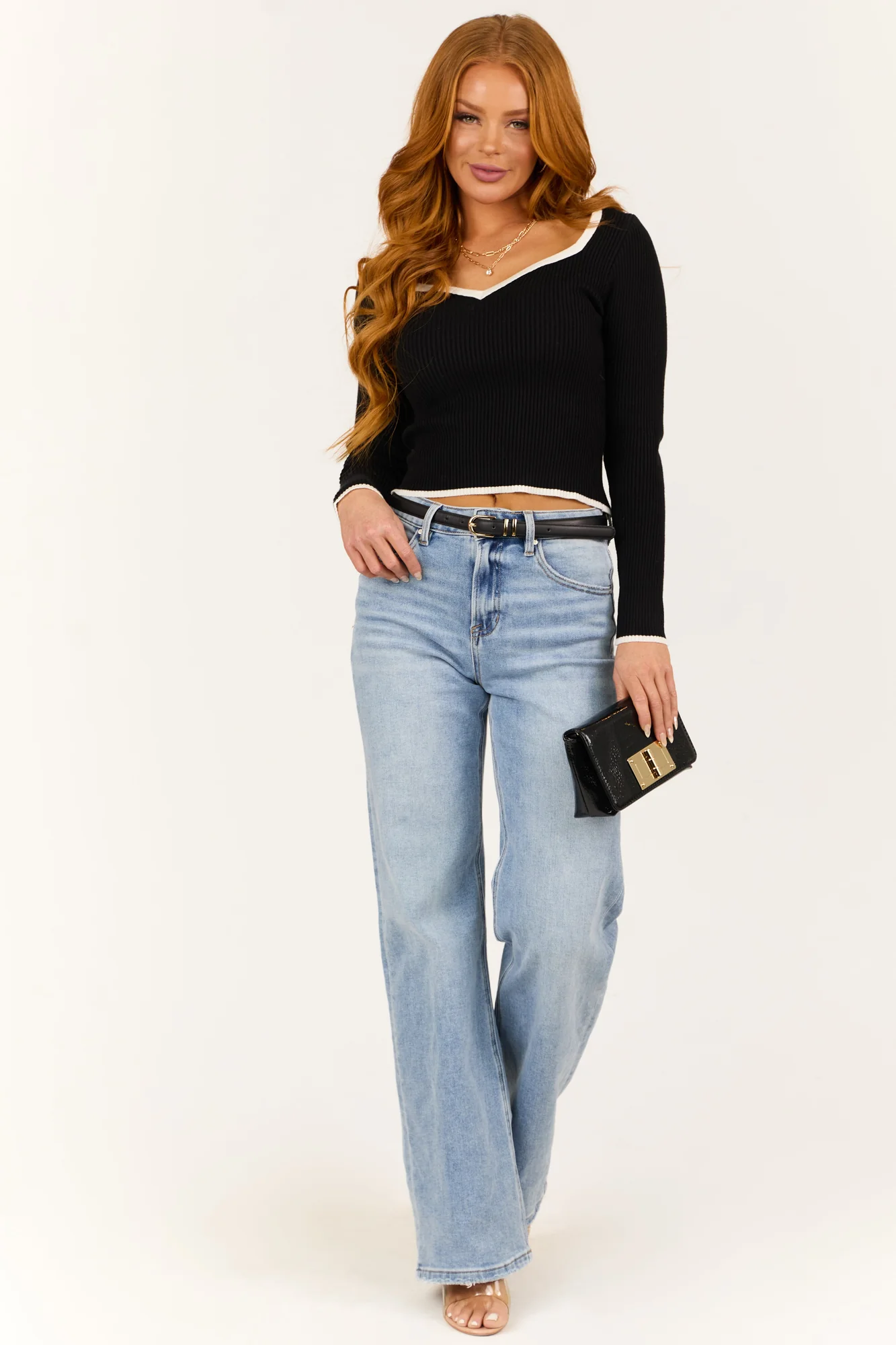 This stylish black sweater features a sweetheart neckline and white contrast trim for a chic look. Made of 50% viscose, 30% polyamide, and 20% polyester, it offers a stretch ribbed design for comfort. The mid-length sweater is unlined and comes in sizes S, M, L, and XL. Sleeve length ranges from 23.5″ to 23.5″, bust from 24″ to 30″, and length from 19″ to 20.5″. Easy to care for with machine wash instructions included. Model is 55″ tall, size Small, with a 33″ bust and 24″ waist.