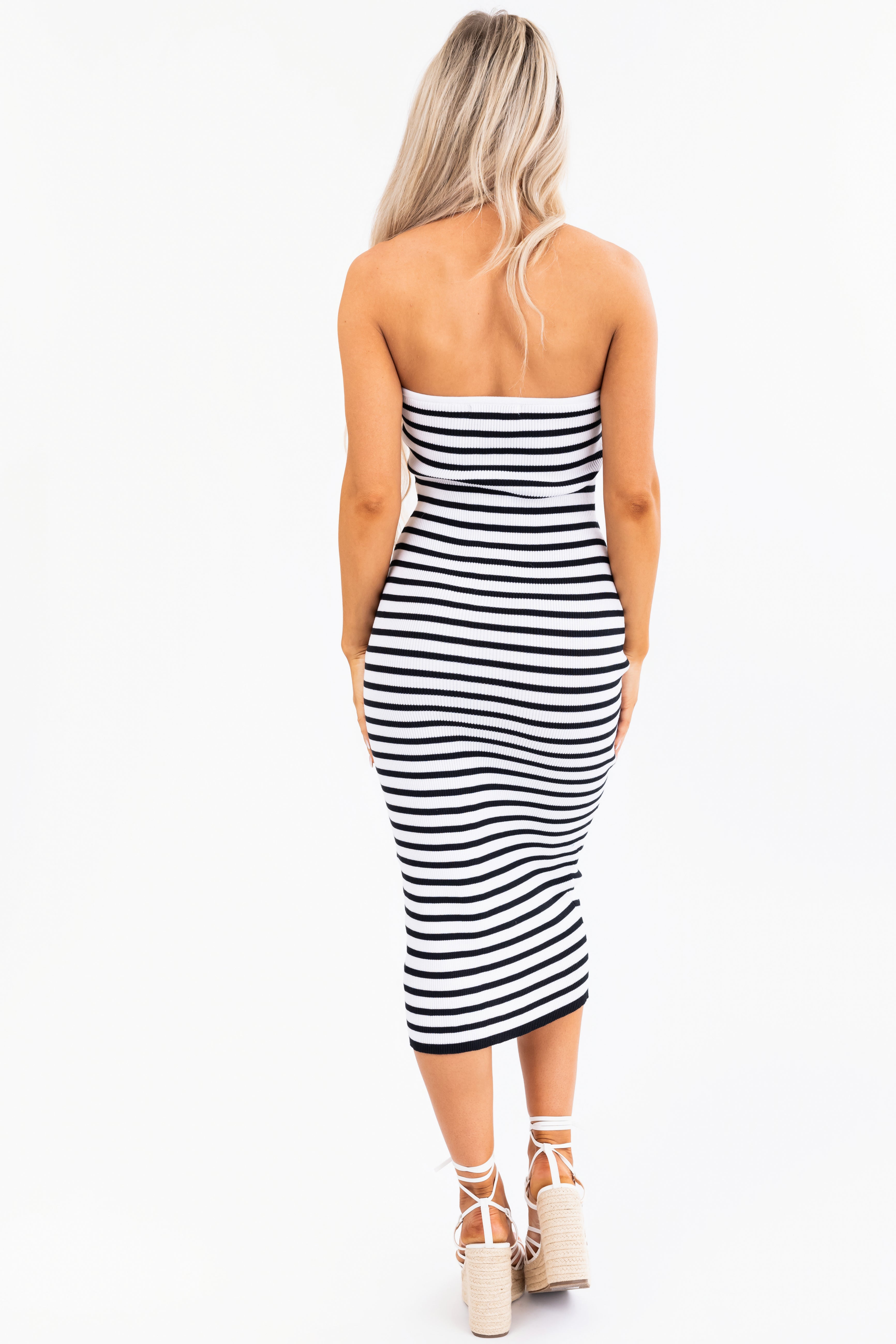 This stunning black ribbed midi dress is a must-have for your wardrobe. Available in sizes S, M, and L, with a length of 39 inches and bust sizes ranging from 23 to 27 inches, it fits true to size and features a fitted bodycon design. Made from 100% polyester, this dress is not only stylish but also comfortable with its stretchy ribbed knit fabric. The strapless design with a twisted bust and sweetheart neckline adds a touch of elegance. Perfect for casual or daytime occasions, this imported dress exudes sophistication and charm. Please note to hand wash cold, wash separately, do not bleach, lay flat to dry, do not iron, and do not dry clean. Due to the cutting and sewing process, slight variations may occur in print and stripesalignment. Model is wearing a size Small.