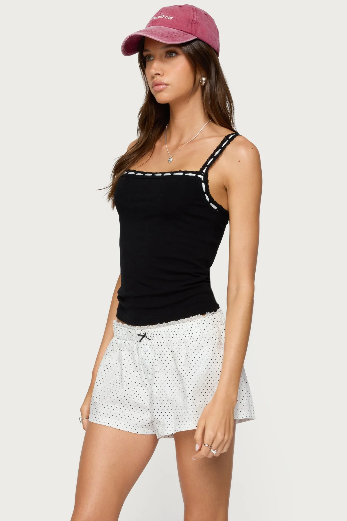 This elegant black tank top features adjustable straps, a square neckline, and delicate ribbon & lace trim for a sophisticated look. Made from a blend of Rayon, Polyester, and Spandex, it offers both style and comfort. Perfect for various occasions, this tank top is a must-have in your wardrobe. The model is wearing size S and is 57 tall. Care instructions: Machine wash at max 30ºC, wash with similar colors, do not bleach, do not tumble dry, iron at max 110ºC, do not dry clean.