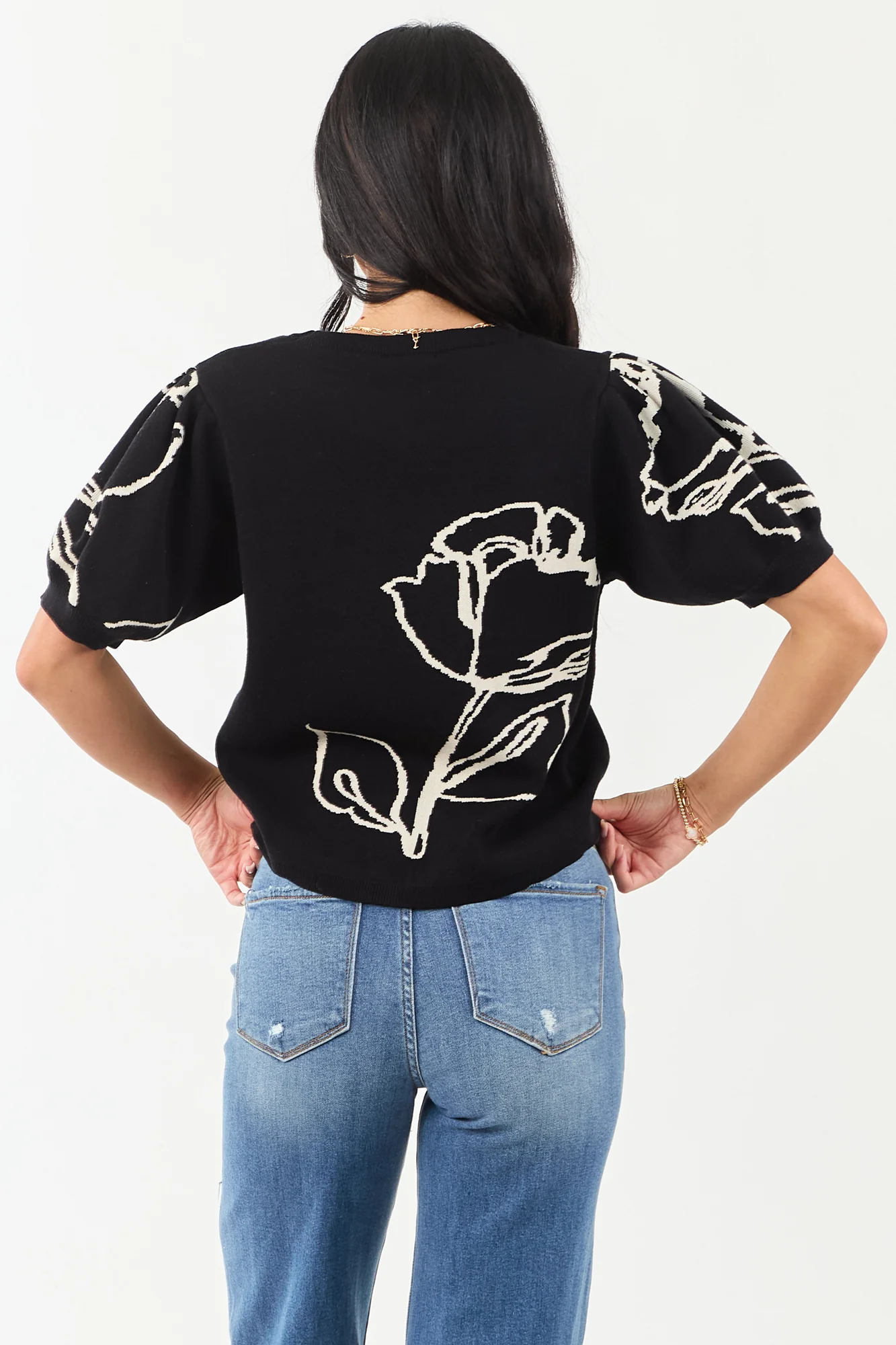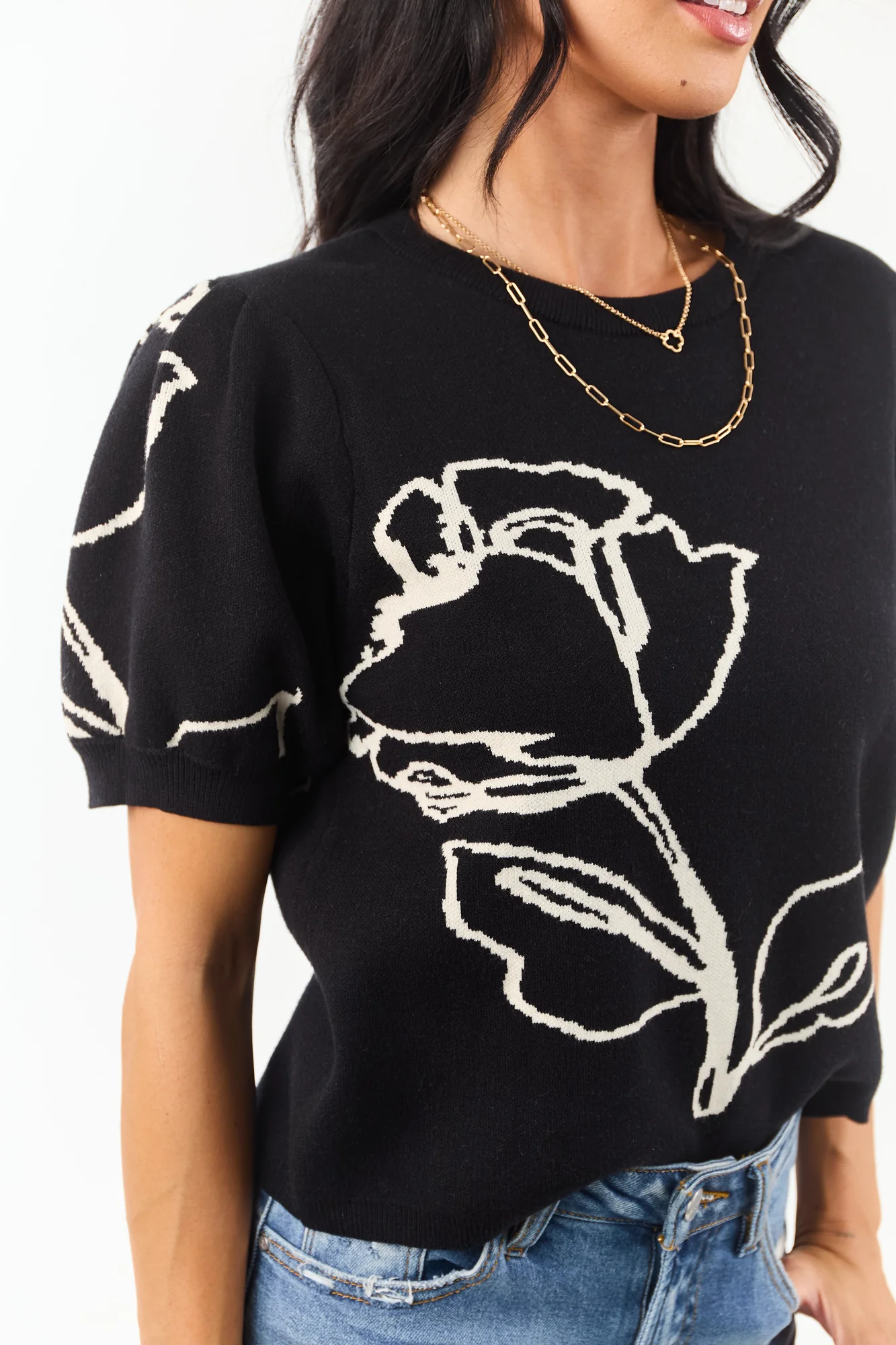 Indulge in romantic elegance with this black rose graphic puff sleeve sweater top. Crafted from a stretchy knit blend of viscose, polyester, and nylon, this soft silhouette features bold ivory roses and banded trim. Pair it effortlessly with high-rise denim for a chic look or layer it under a moto jacket for added charm. This top is available in sizes to L with bust sizes ranging from 36 inches to 48 inches and lengths from 21 inches to 21.5 inches. The sleeve length measures between 10 to 10.5 inches. Imported. Model in the picture is wearing a size Small. Model’s measurements: Height 59”, Bust 34”, Waist 26”.