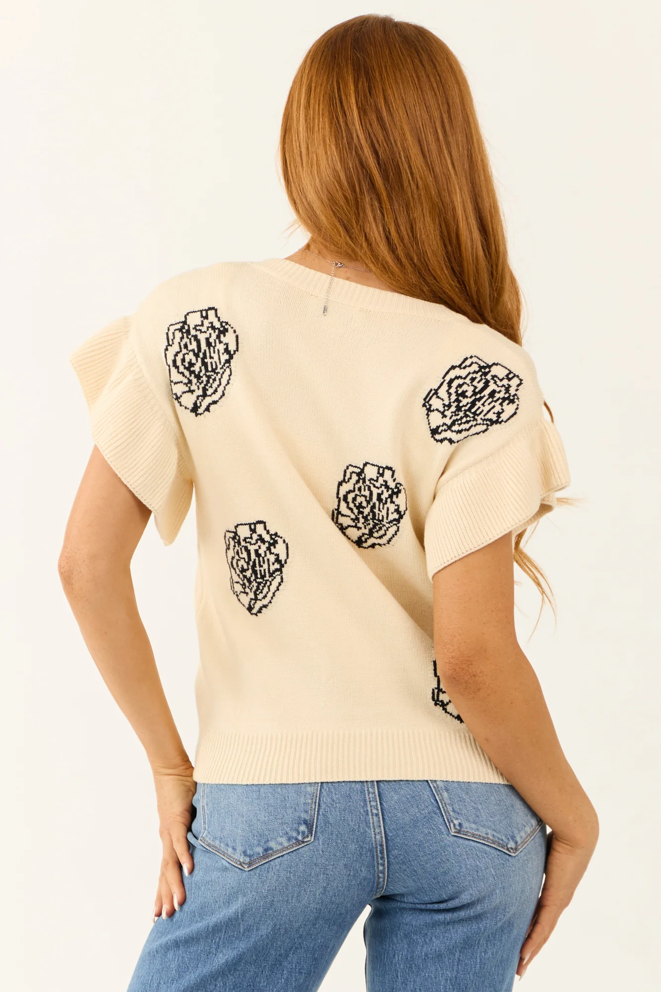 Stay cozy and stylish in this Black Rose Print Ruffle Sleeve Knit Sweater . Made from a stretchy soft ribbed knit with a charming rose print, this sweater features a crew neckline, ruffle cuffs, and ribbed banded trim. Perfect for casual outings or evenings out, this sweater adds a touch of floral elegance to your wardrobe. Hand wash cold and lay flat to dry for best care.