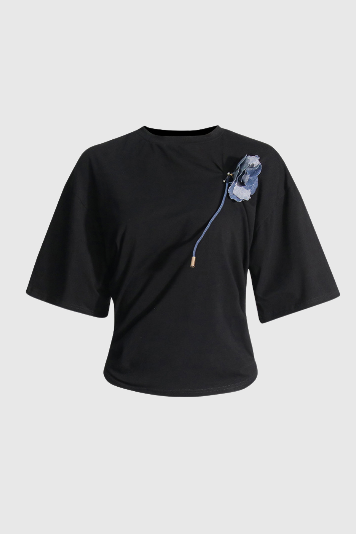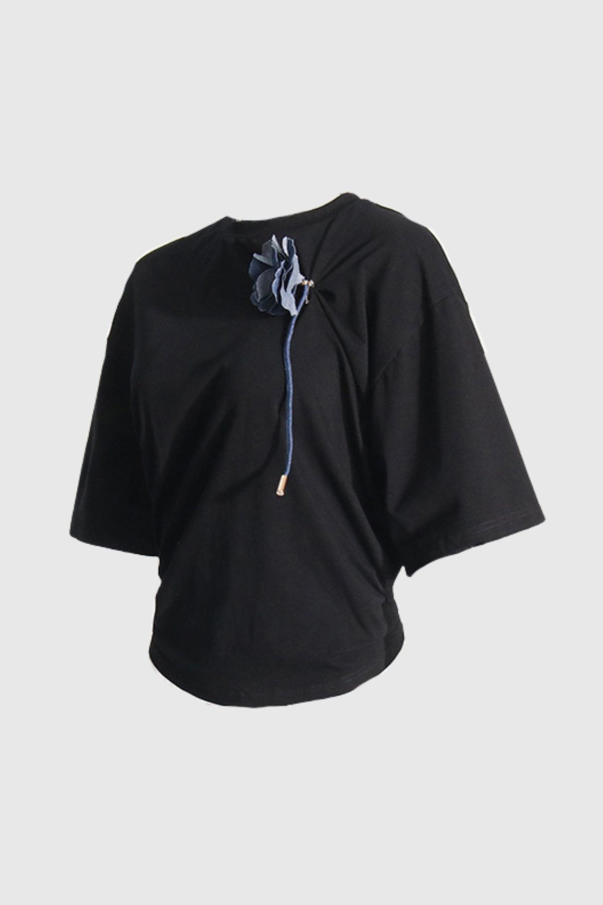 Upgrade your wardrobe with the elegant and stylish Black Ruched Flower T-Shirt . This versatile top features ruched detailing for a flattering fit and a delicate flower design for a touch of femininity. Made with high-quality 100% Polyester fabric, this shirt offers both comfort and style. The slight stretch adds to its comfort factor. Whether for a casual day out or a special occasion, this black t-shirt is a must-have piece for any fashion-forward woman. Color may vary due to image lighting. Discover Effortless Ease with this top today.
