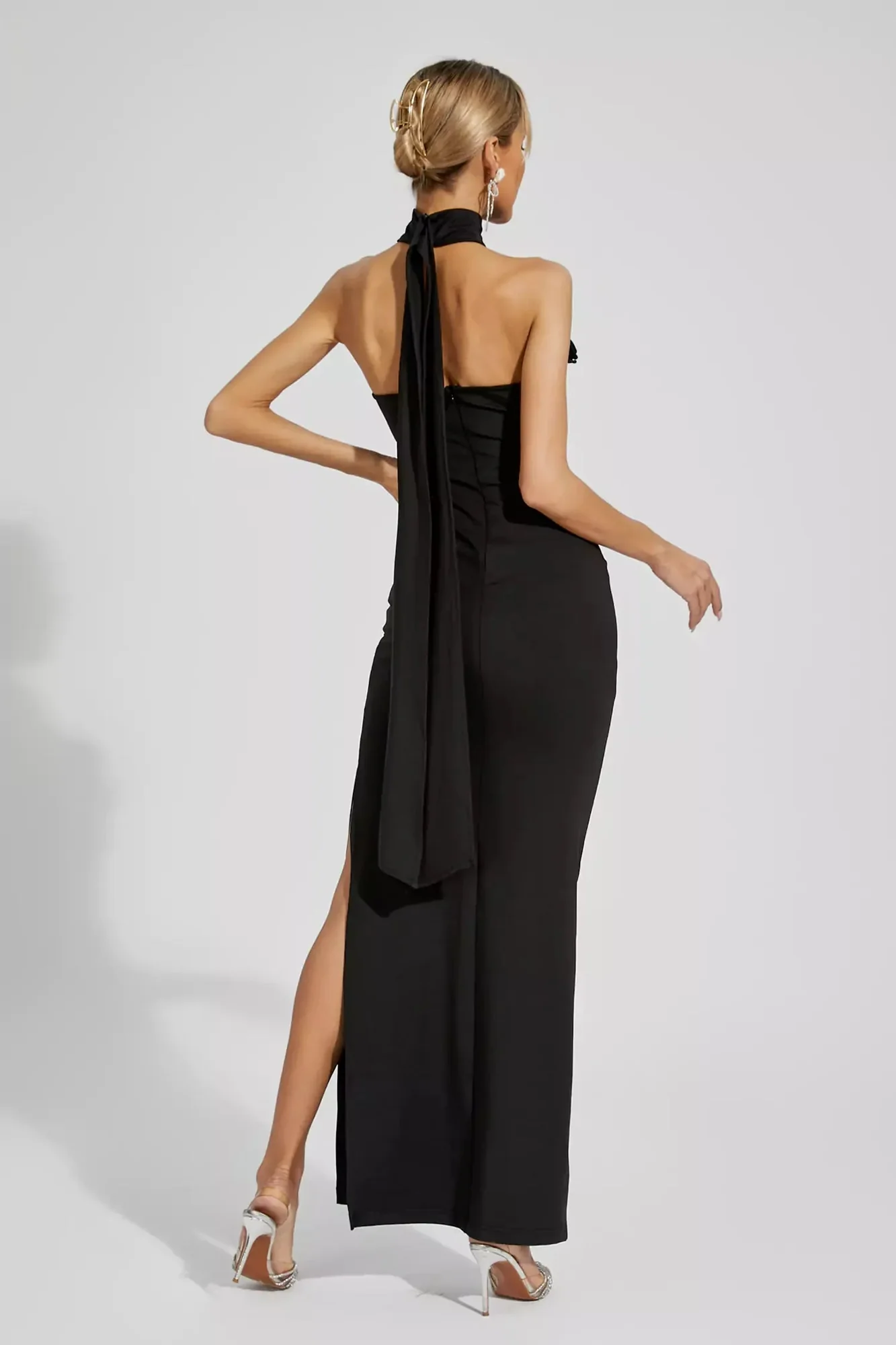 Indulge in the sophistication of the Black Ruched Halter Maxi Dress, featuring exquisite 3D floral details. Enjoy freedom of movement with a slit skirt that exudes sensuality. Highlight your collarbones and shoulders with the off-the-shoulder design. Perfect for weddings or banquets, this dress at approximately 149cm length elevates any occasion. Crafted from Spandex, this dress is best dry cleaned to maintain its quality. Embrace the true color under varying lighting conditions, as model images are for reference. Available in various sizes that align with our size chart. For a flattering fit, consult our size chart recommendations.