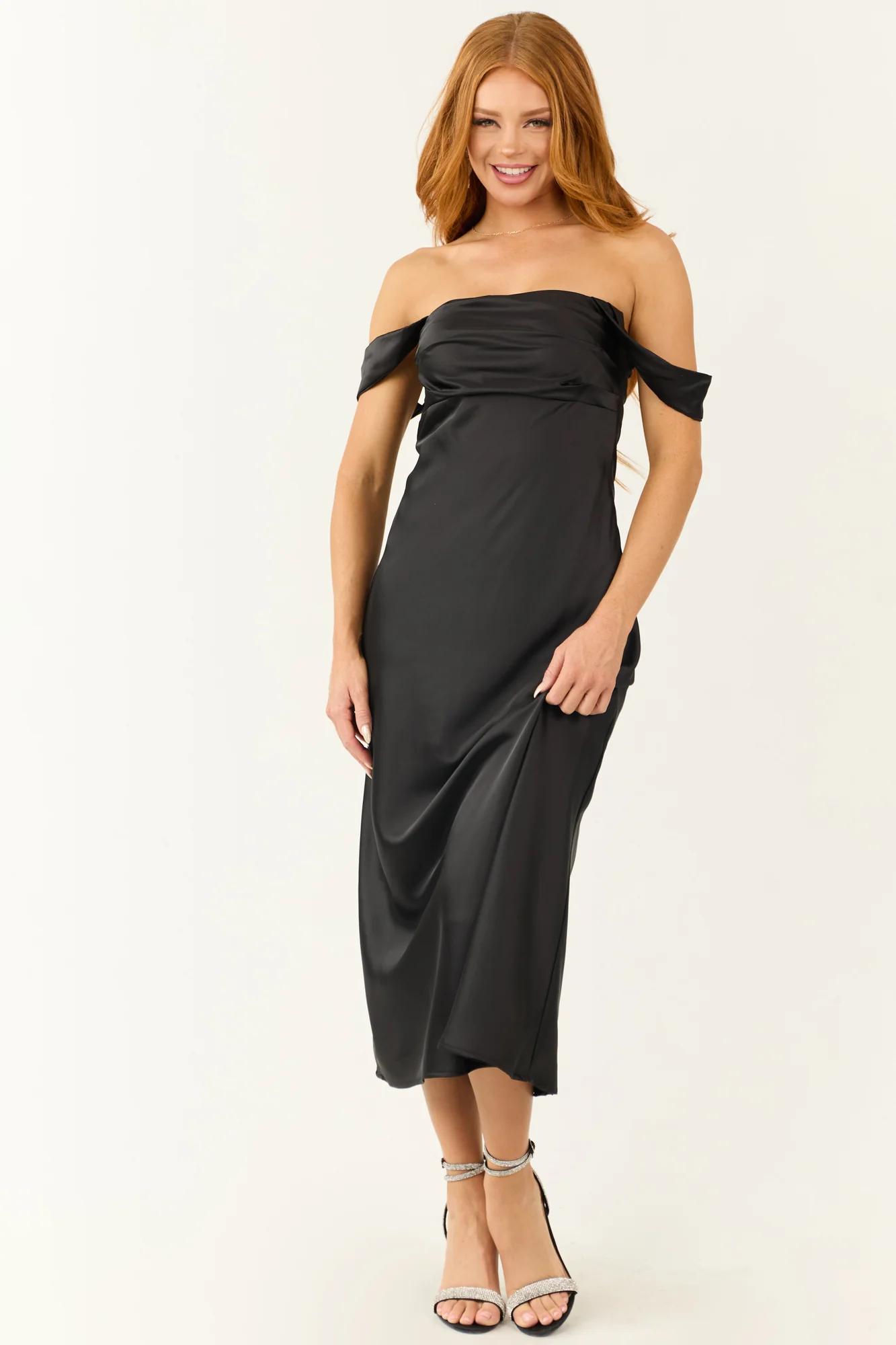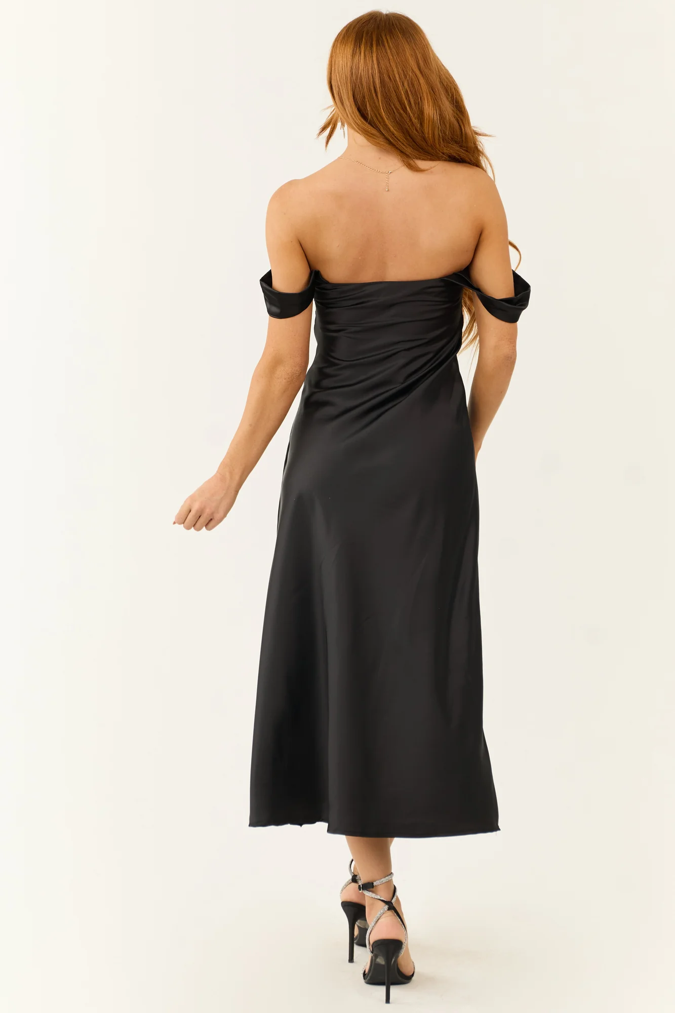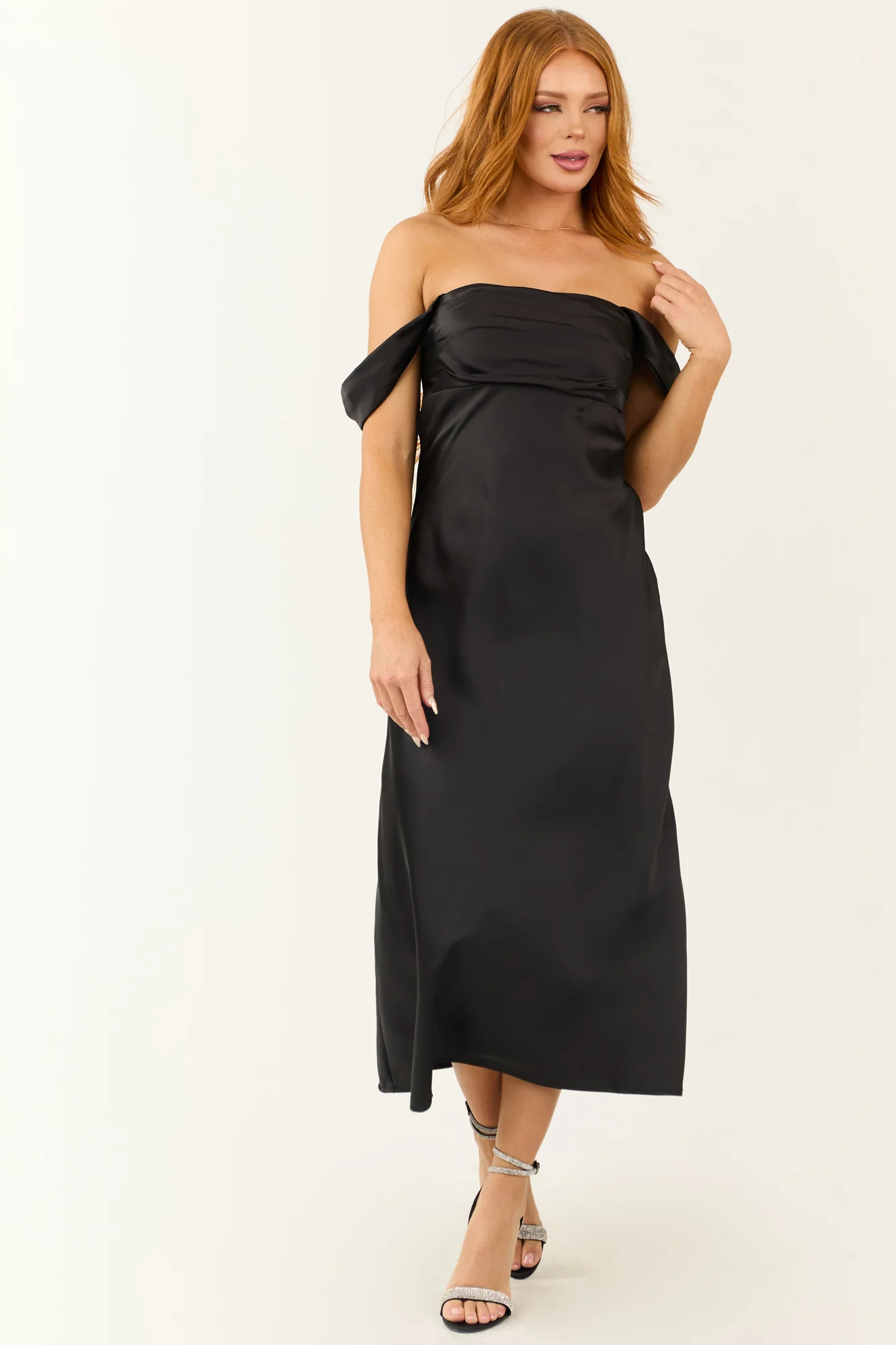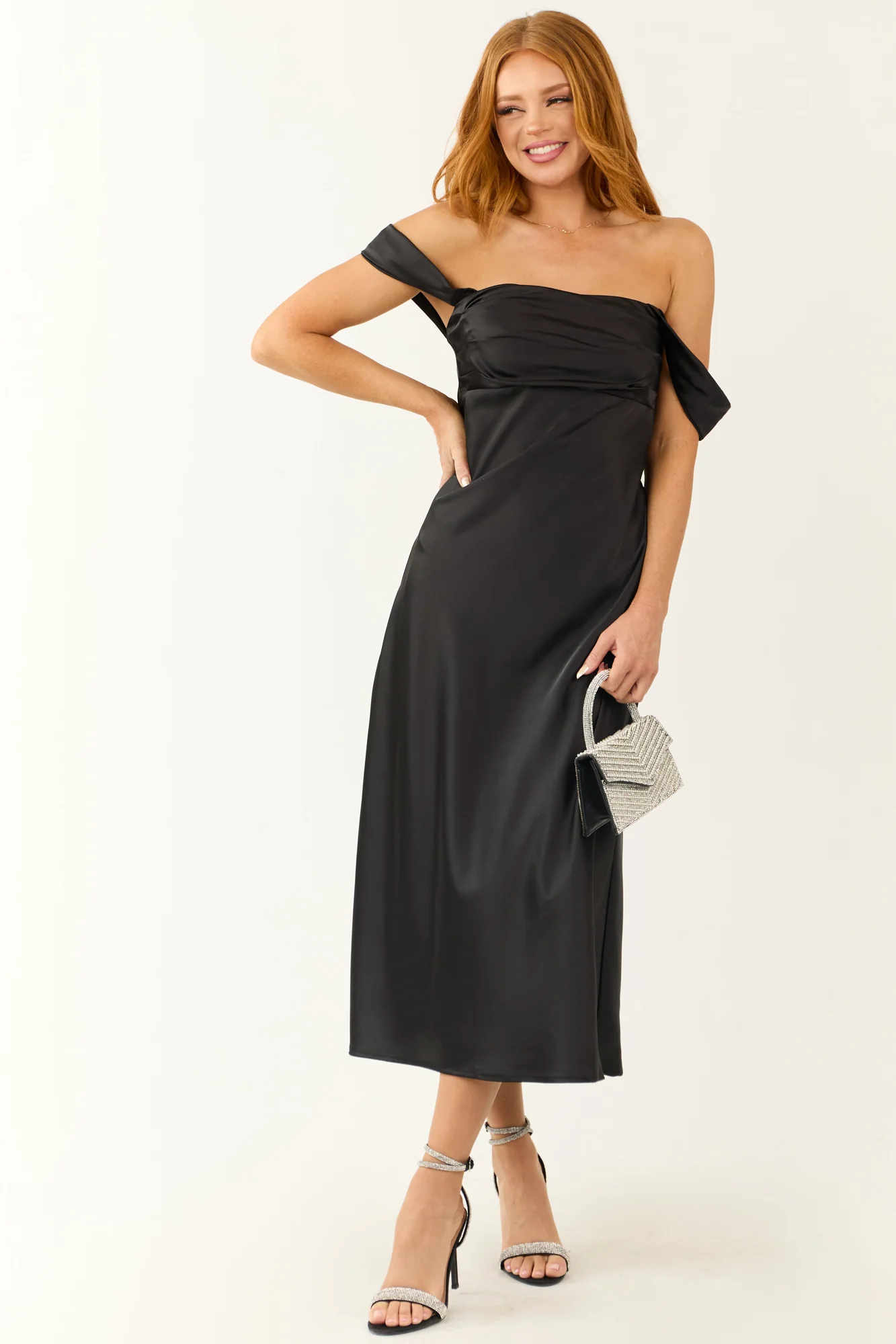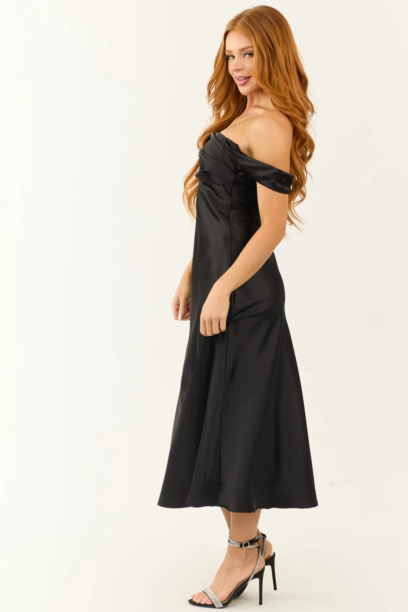 Indulge in elegance with our Black Ruched Satin Off-Shoulder Midi Dress, perfect for any special occasion. This stunning dress features a side zipper, non-slip adhesive strip at the bust, and is lined for comfort. Hand wash cold and lay flat to dry for long-lasting wear. Available in XS, S, M, and L sizes.