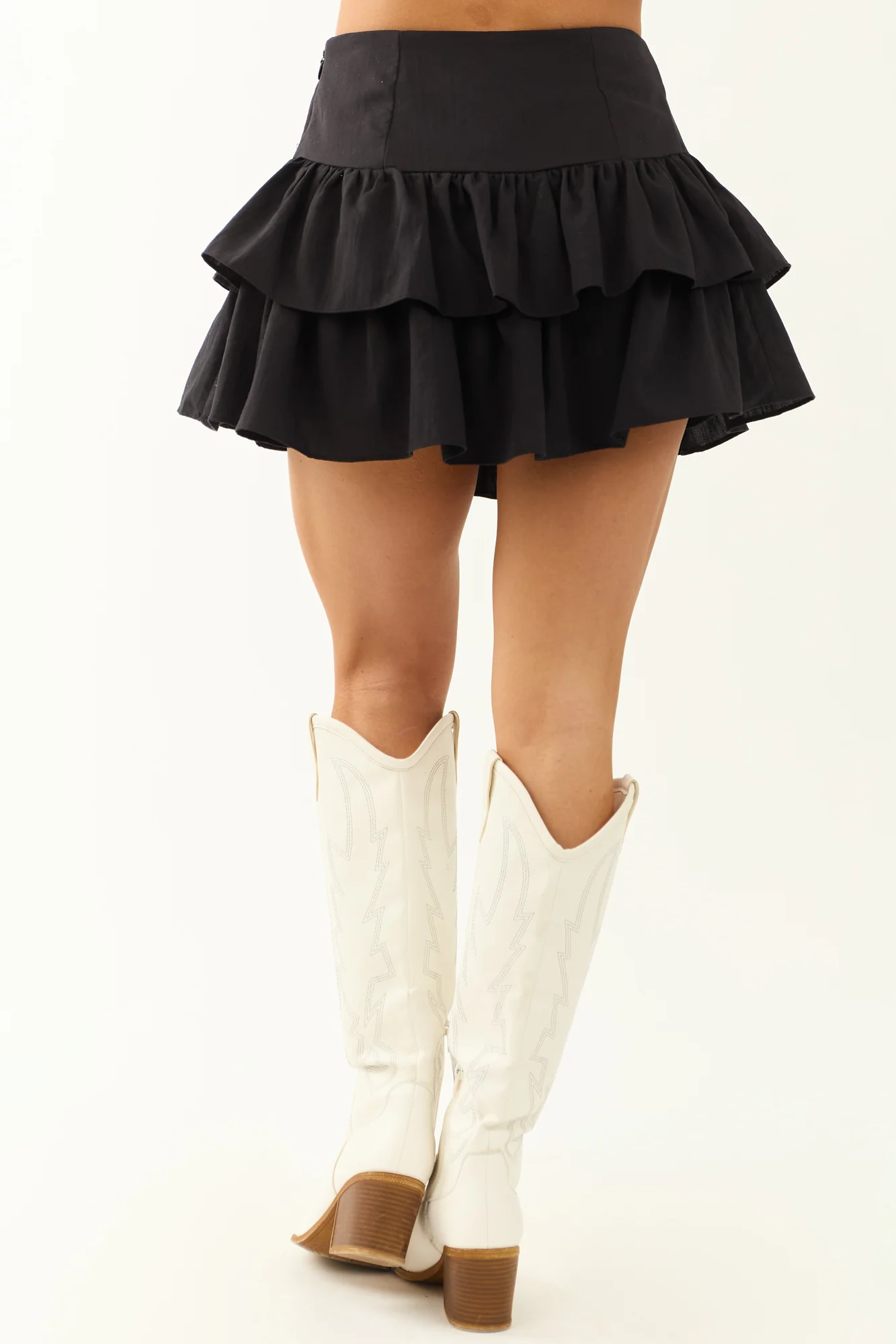 Embrace elegance and style with our Black Ruffle Skort featuring a tiered ruffle skirt overlay, hidden side zipper, and loose waistband fit. Made from a blend of Rayon, Polyester, and Nylon, this skort is perfect for any occasion. Pair it with our Black Square Neck Ruffle Sleeve Cropped Top for a complete look. Hand wash recommended. Model is wearing a size Small. Discover sophistication and comfort today!