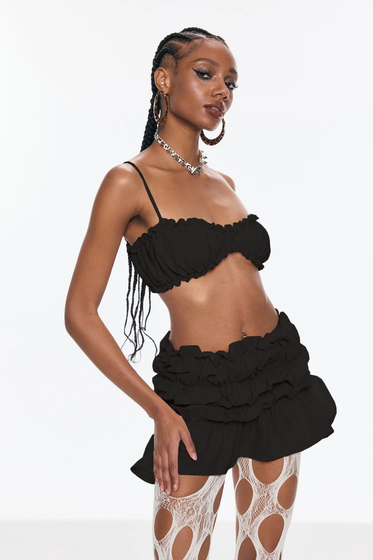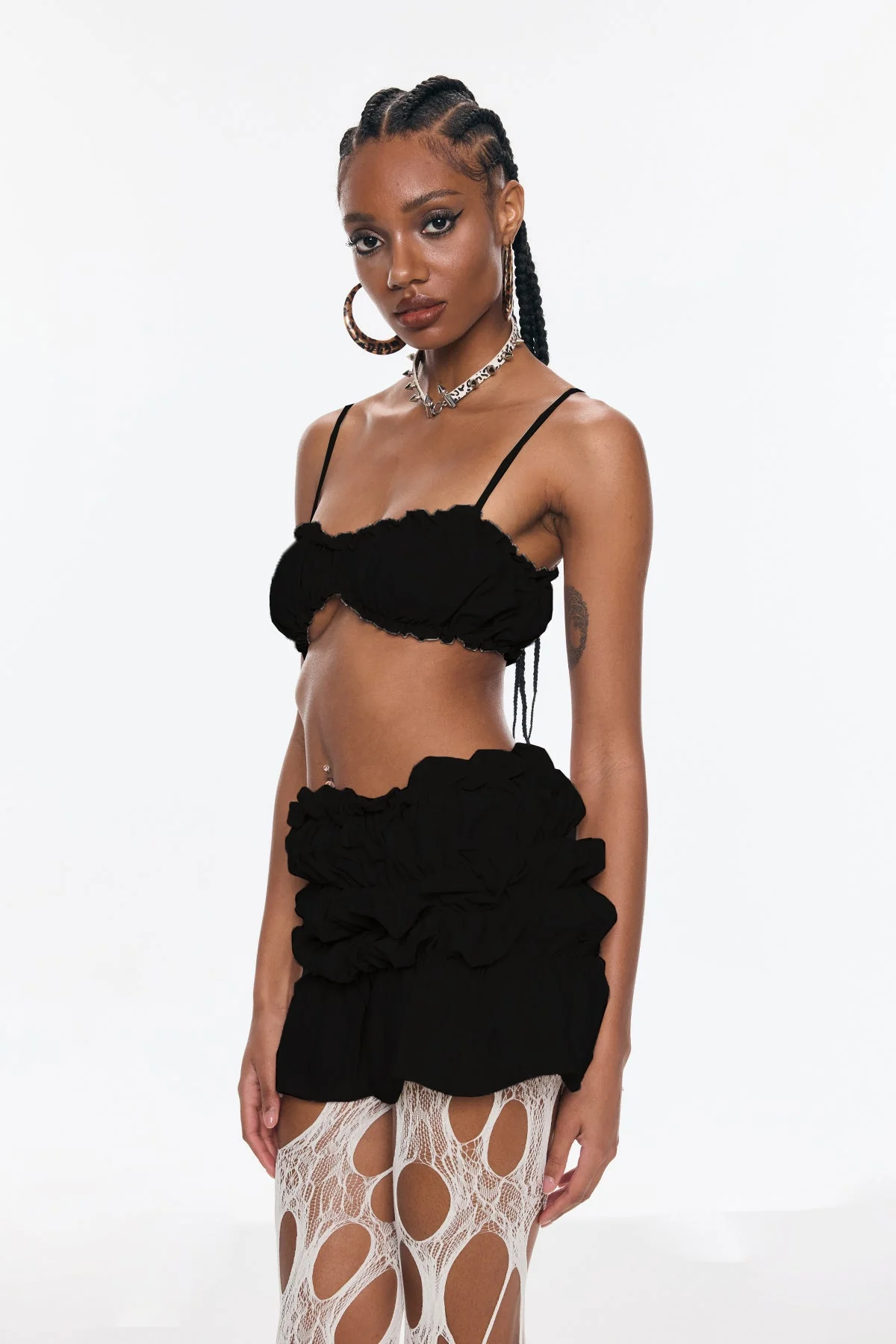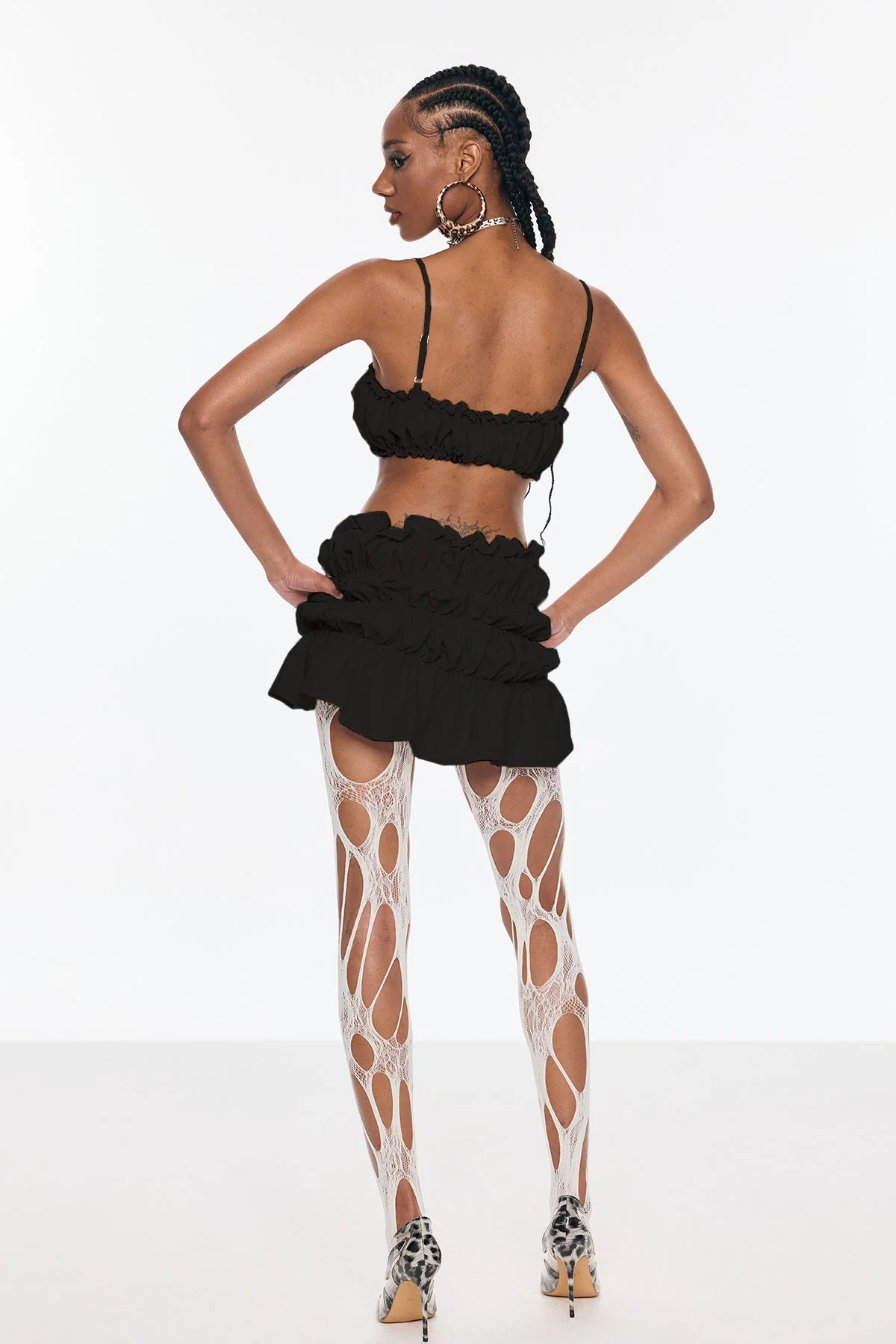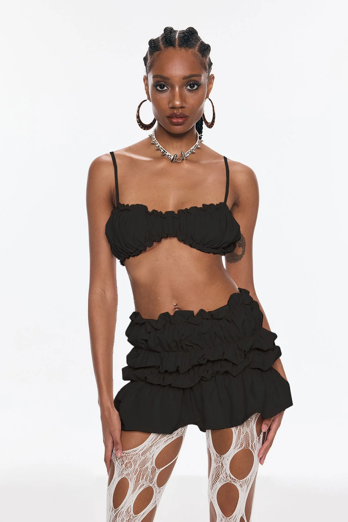 Elevate your style with our Black Ruffle Spaghetti Skirt Set. Featuring delicate ruffle details and adjustable spaghetti straps, this set offers a touch of femininity. Crafted from high-quality materials with a slight stretch, its versatile for any occasion. Experience the urban edge with this stylish and comfortable set. Material: 50% Polyester, 50% Cotton. Care Instructions: Gentle machine wash. Please note, actual color may vary due to lighting during photography.