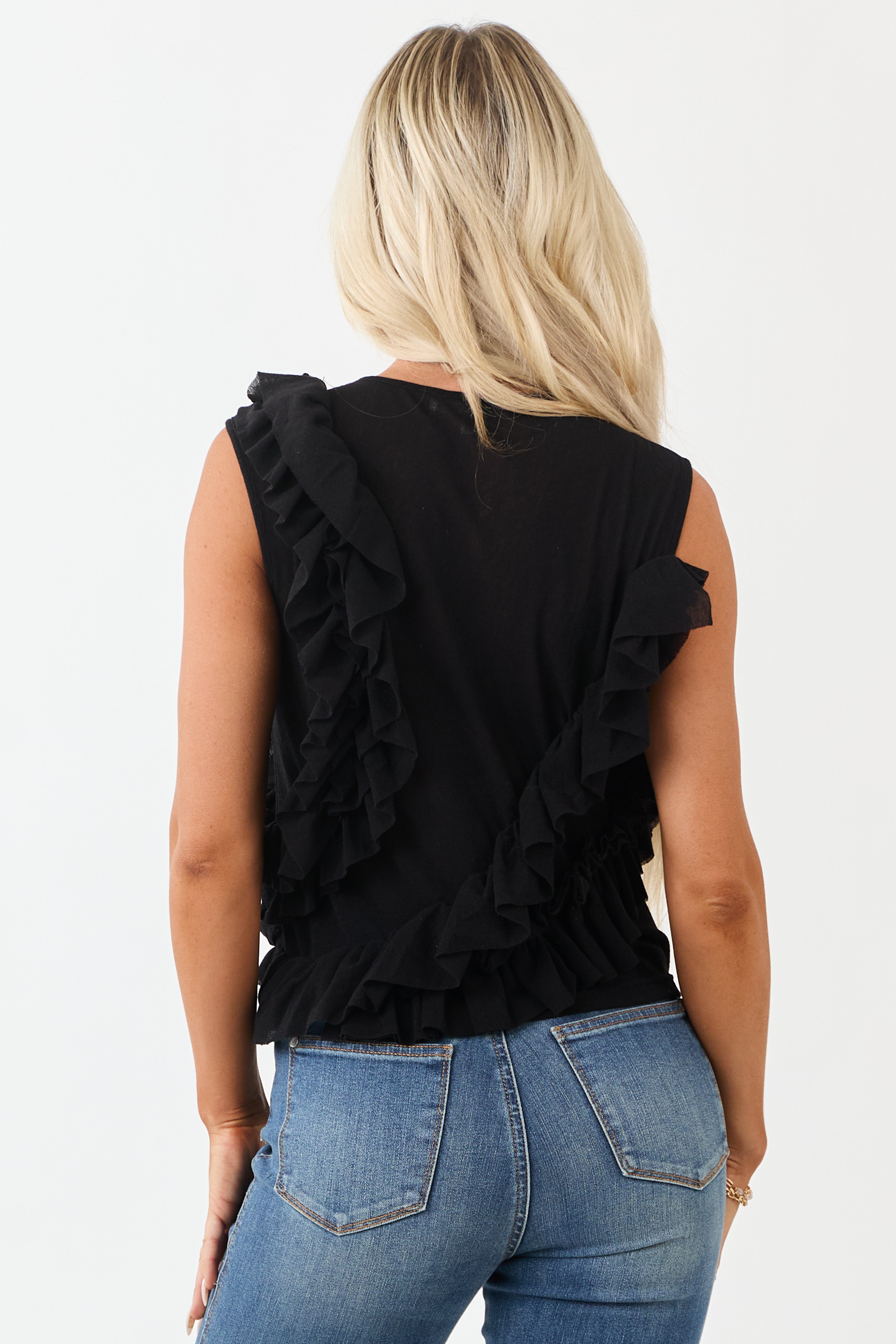 Stay stylish with this black tank top featuring asymmetrical ruffles for a modern twist. Made from a stretchy knit blend of 62% Polyester, 33% Viscose, and 5% Spandex, this trendy top has a slightly sheer finish. The round neckline adds a classic touch. Available in sizes S, M, and L. Perfect for everyday wear or dressing up for a night out. Pair it with your favorite jeans for a chic look. Model is wearing a size Small and is 57″ tall with a bust of 35″ and waist of 26″.