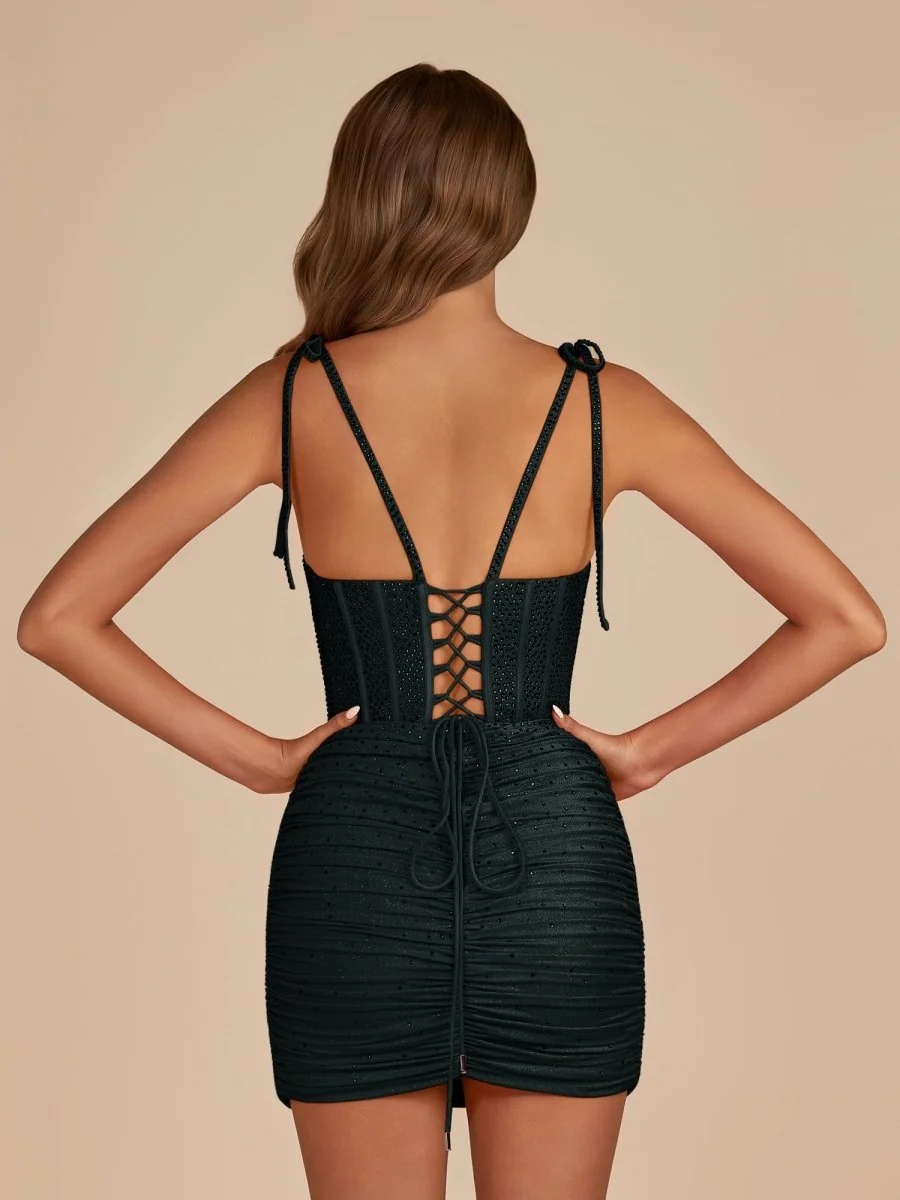 Make a statement in this stunning black satin bodycon dress, featuring a chic beaded corset design for a modern and sophisticated touch. The flattering scoop neckline and sleeveless cut accentuate your shoulders, while the lace-up back ensures a personalized fit. Adorned with elegant bow straps, delicate bead embellishments, and a playful silhouette, this short dress is the perfect choice for homecoming, parties, or nights out. Crafted from high-quality satin fabric, available in multiple colors. Create unforgettable memories with this head-turning piece! Details: Silhouette: Bodycon Fabric: Satin Colors: Black, Fuchsia, Dark Green, Navy Blue, Orange, Red, Royal Blue Length: Short Neckline: Scoop Neck Sleeves: Sleeveless Back: Lace-up Back Embellishment: Bow Straps, Beads