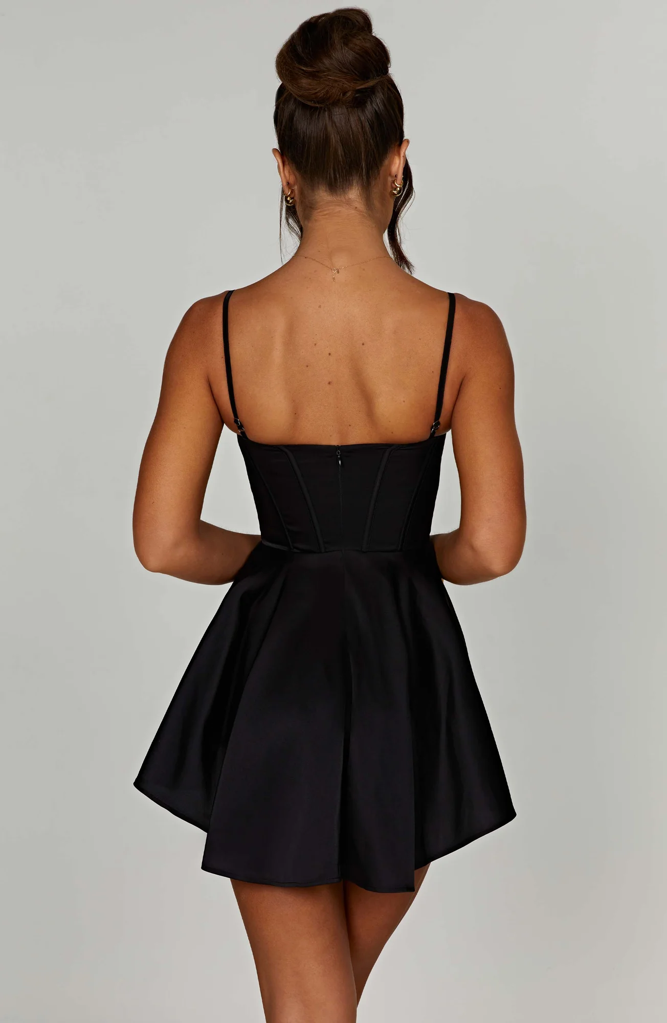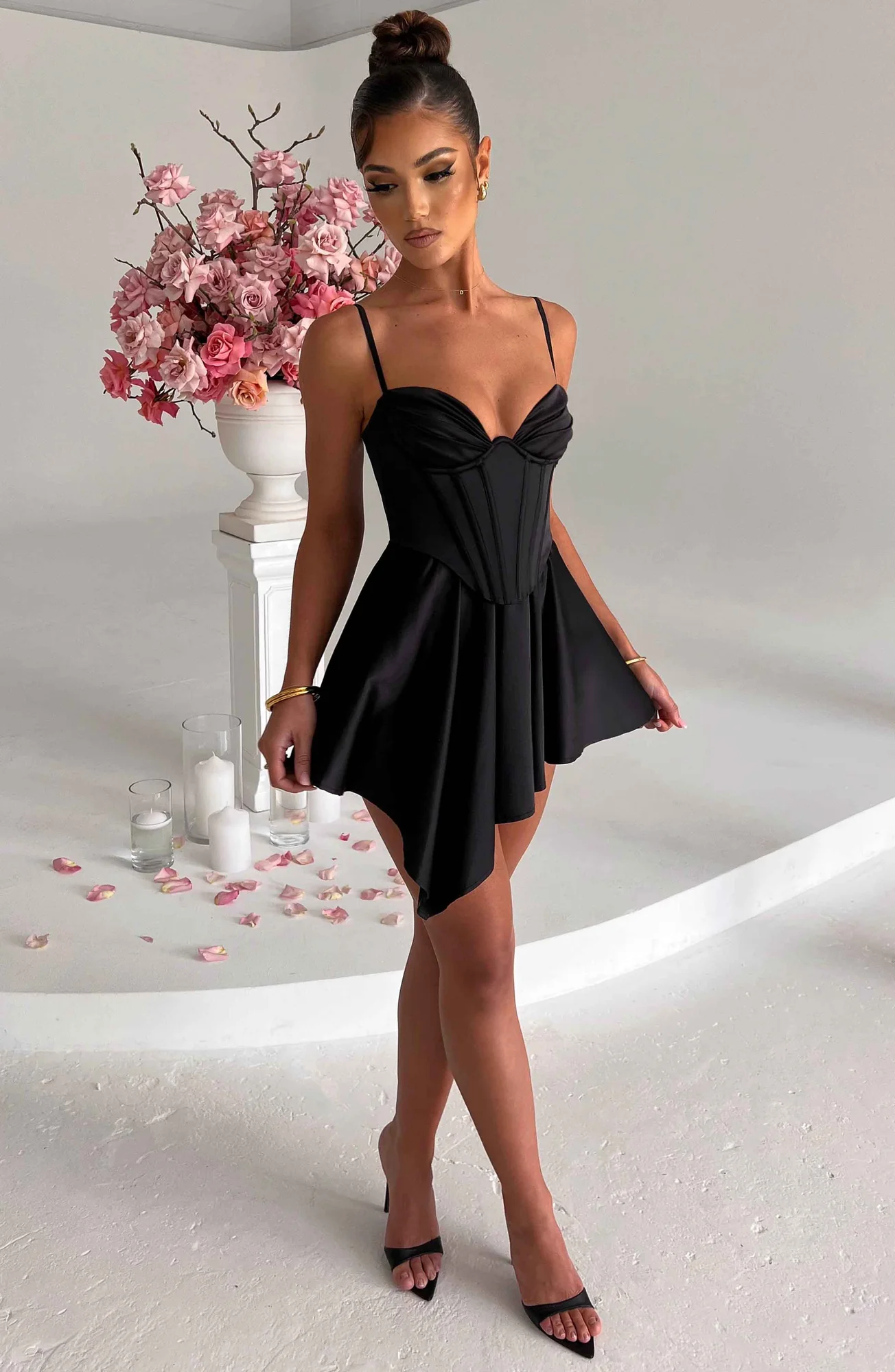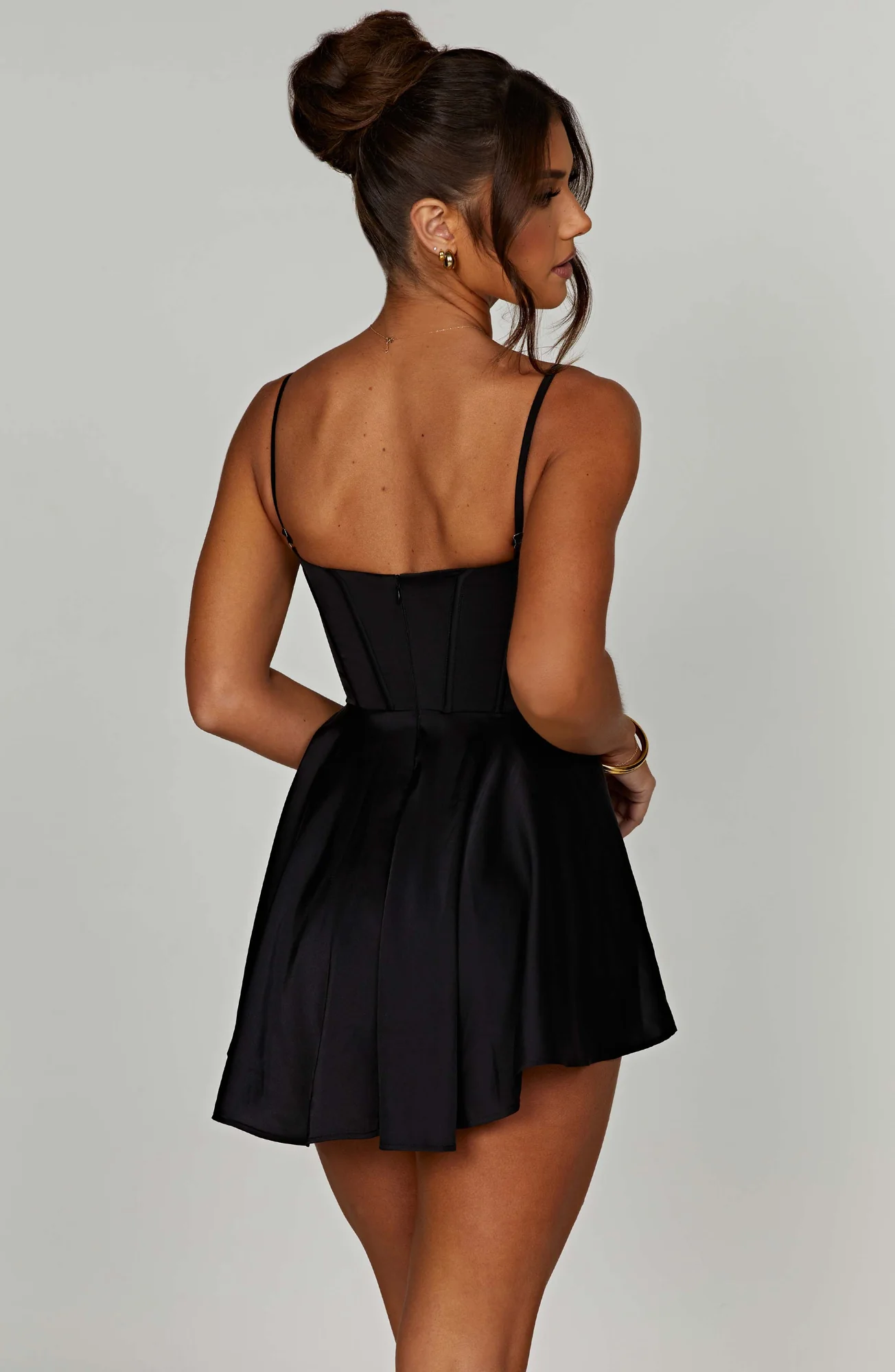 Indulge in the allure of our Black Satin Fluttery Jumpsuit, featuring a flattering corset body and underwired cups in premium stretch satin. The pleated shorts add a touch of romance perfect for date nights or outings with friends. This elegant mini playsuit exudes confidence and style, complemented by its comfortable design. Elevate your look effortlessly with heeled mules and tousled hair. Embrace sophistication with this chic, must-have wardrobe staple. Color: Black. Premium stretch satin. Corset body with underwired bust. Fluttery pleated shorts. Mini length. Available in sizes XS to XXL. Model is wearing size XS.