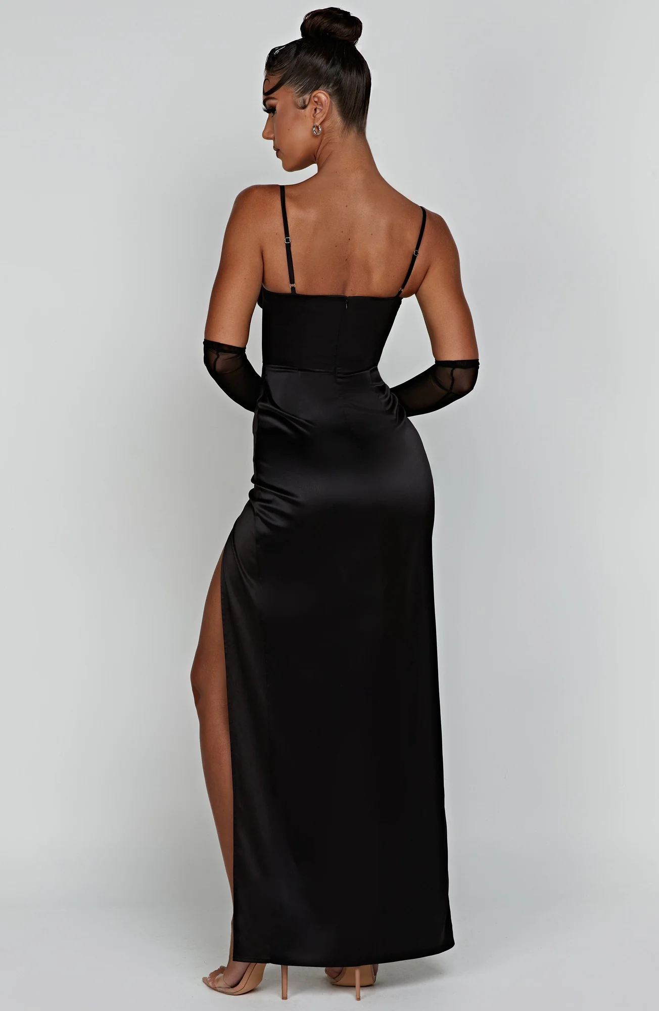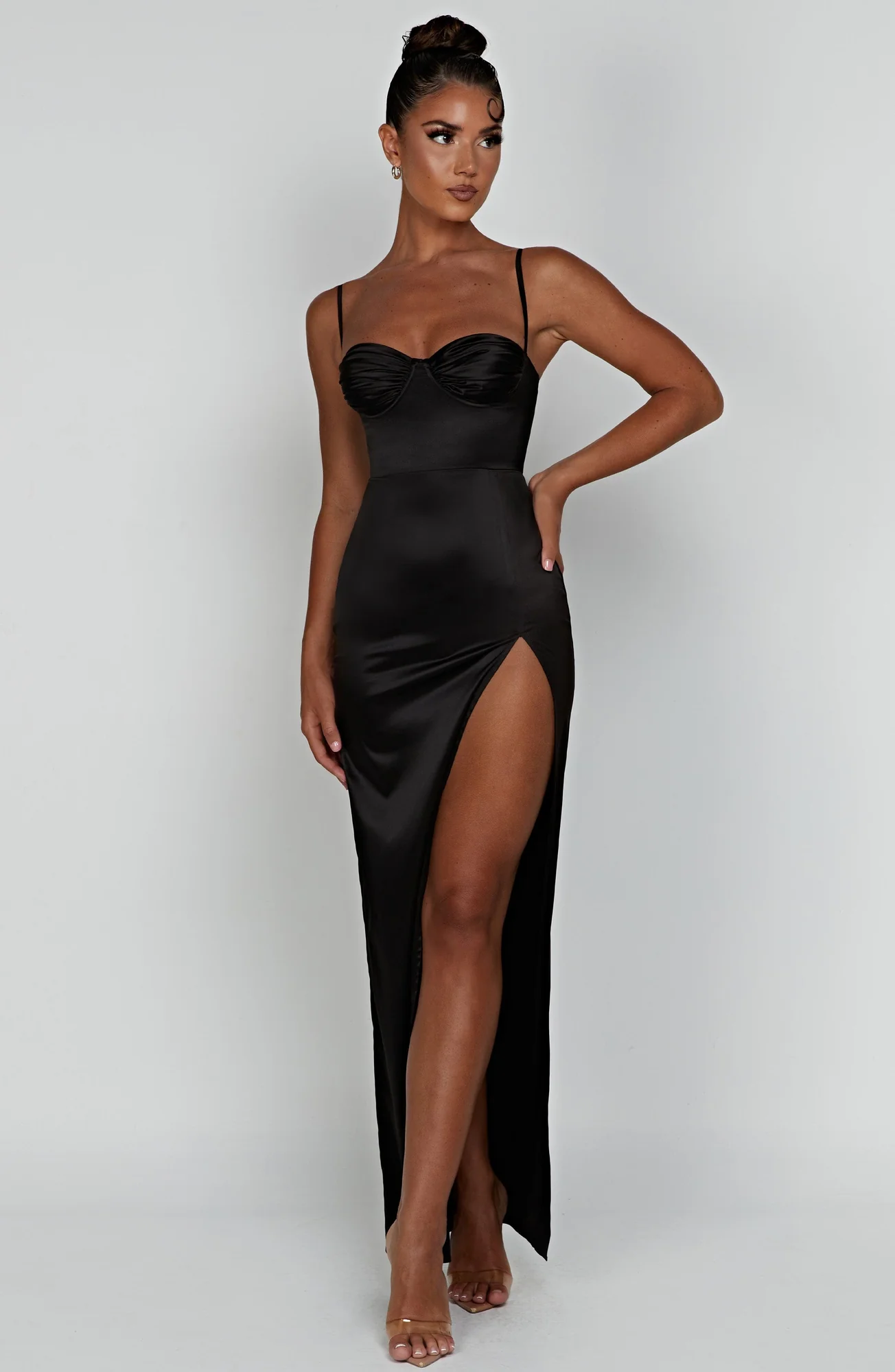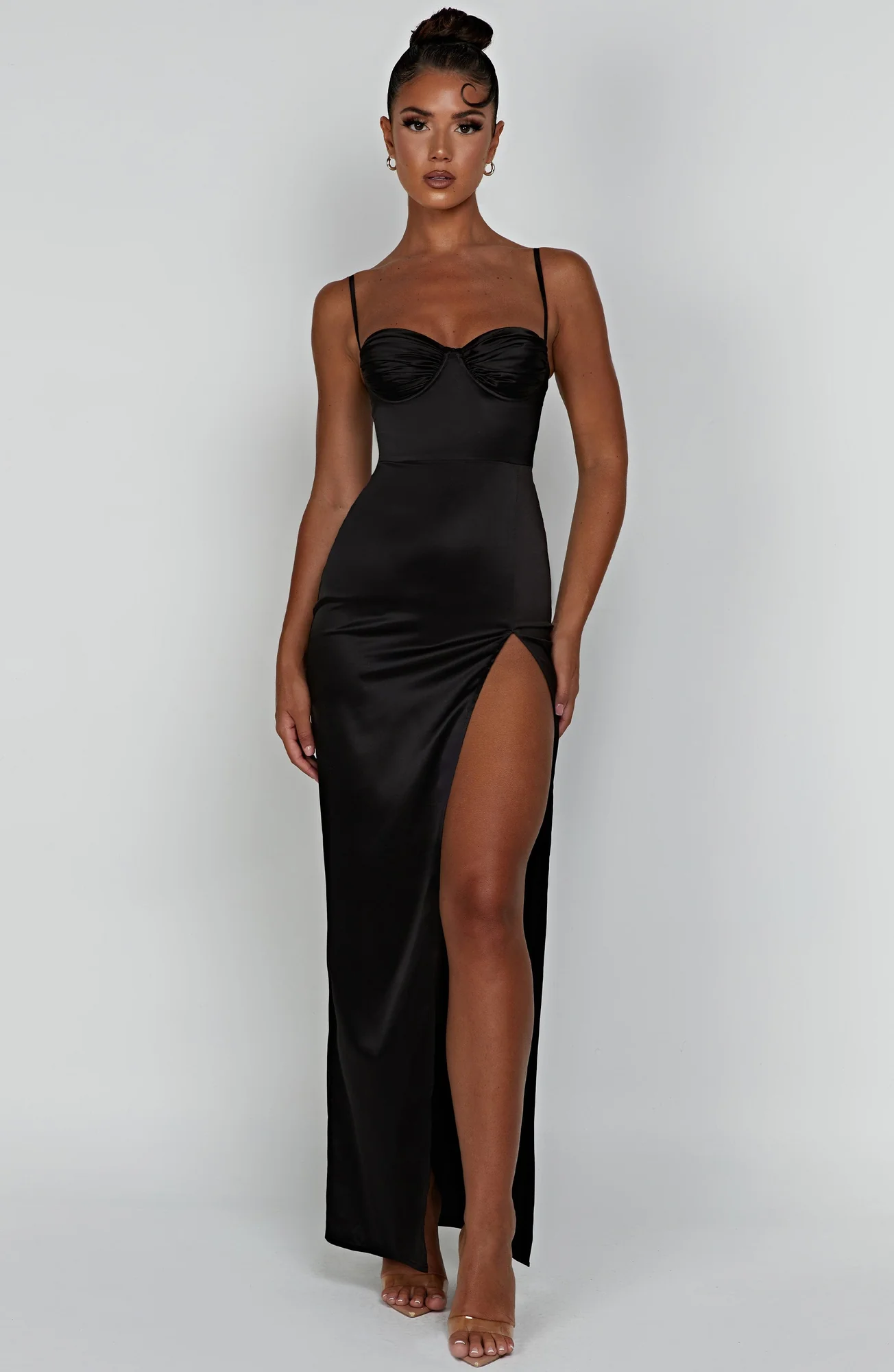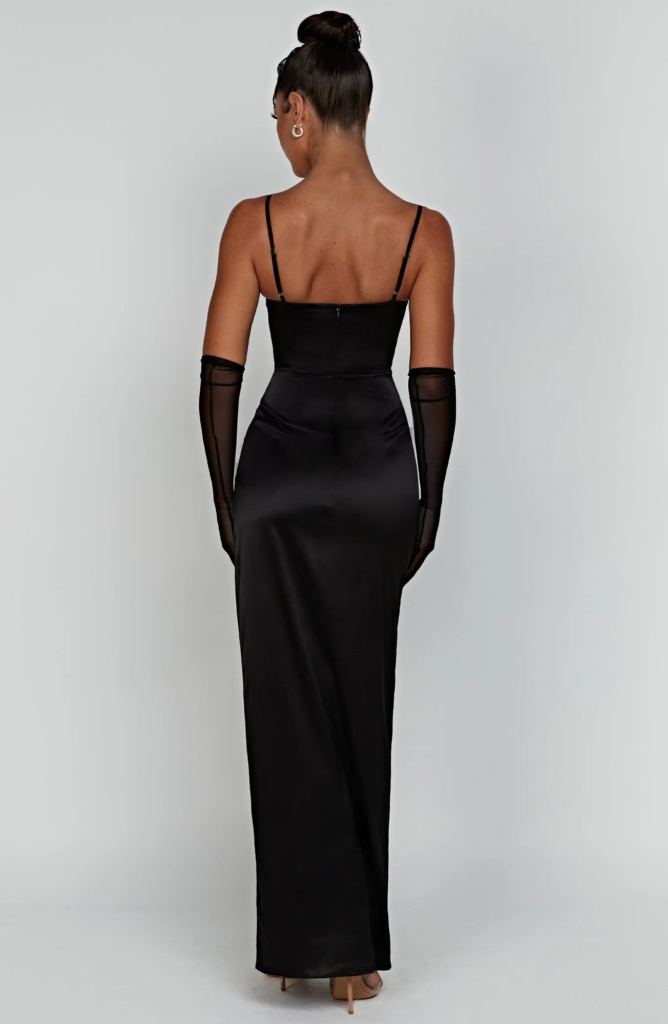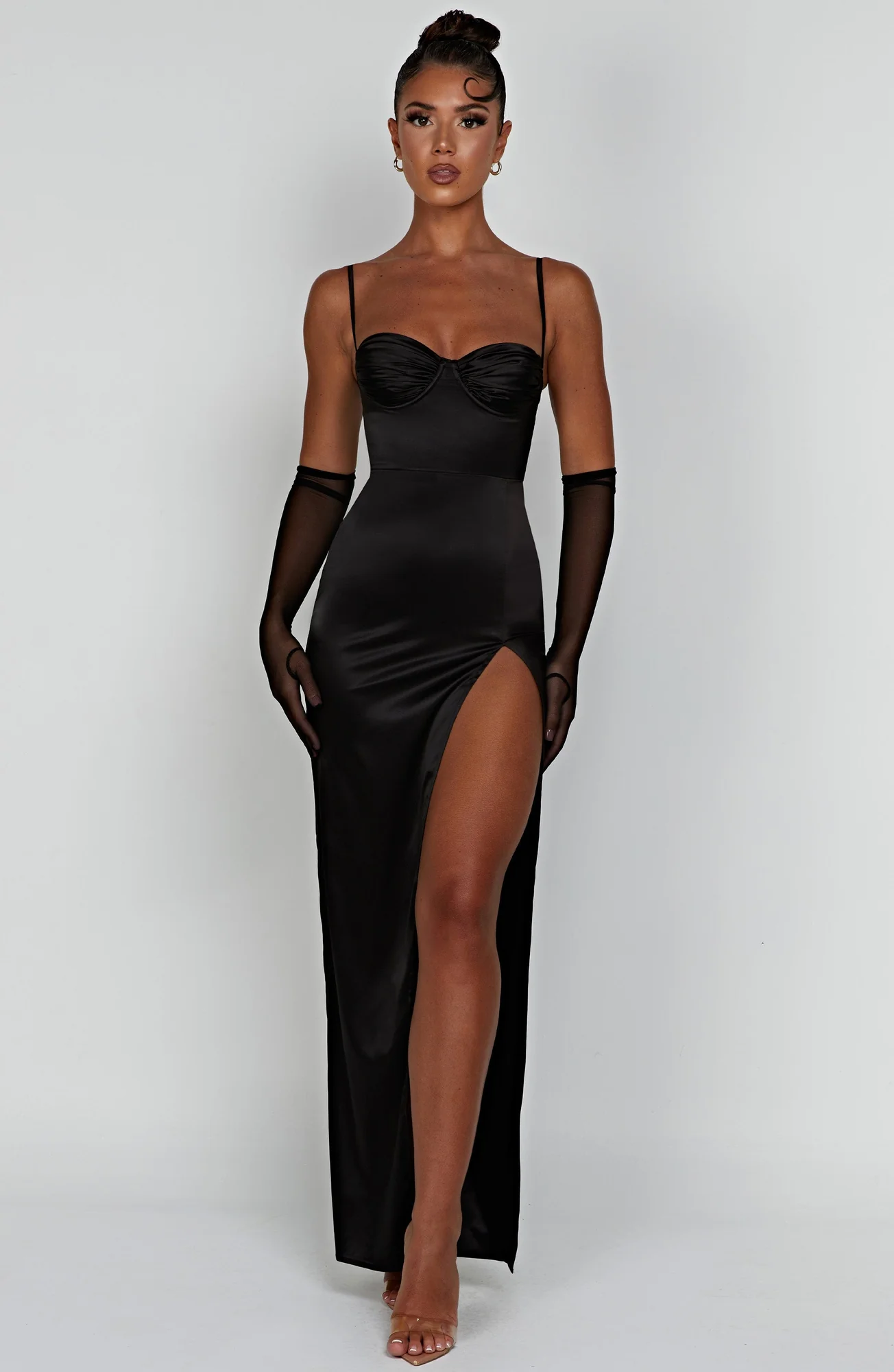 Discover the timeless elegance of the Black Satin Maxi Dress with a flattering body-hugging fit and thigh high split. This luxurious gown is designed for every special occasion with pleated cups, underwired bust, and maxi length for a sophisticated look. Add Eli Gloves to complete your ensemble.