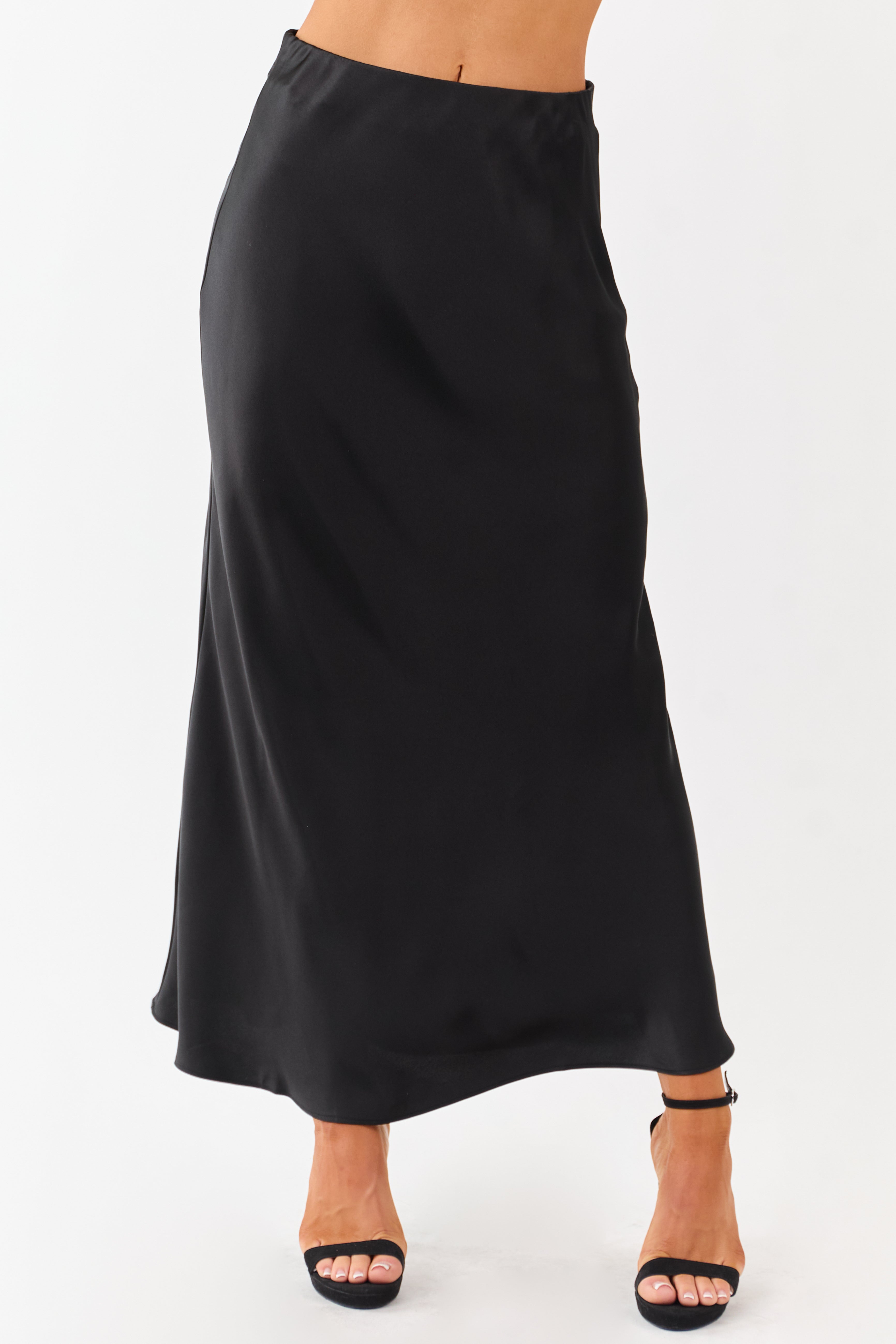 This Black Satin Maxi Skirt with Elastic Waistband comes in sizes Small, Medium, and Large. The waist sizes range from 30-36 inches, while the length is 38 inches. Dress it up with heels or keep it casual with sneakers—perfect for every season and occasion. The skirt fits loose in the waist. It is lined and made of 100% polyester, offering comfort and style. Imported. Model is wearing a size Small. Model’s Profile: Size 3, Height 57″, Bust 35″, Waist 26″.