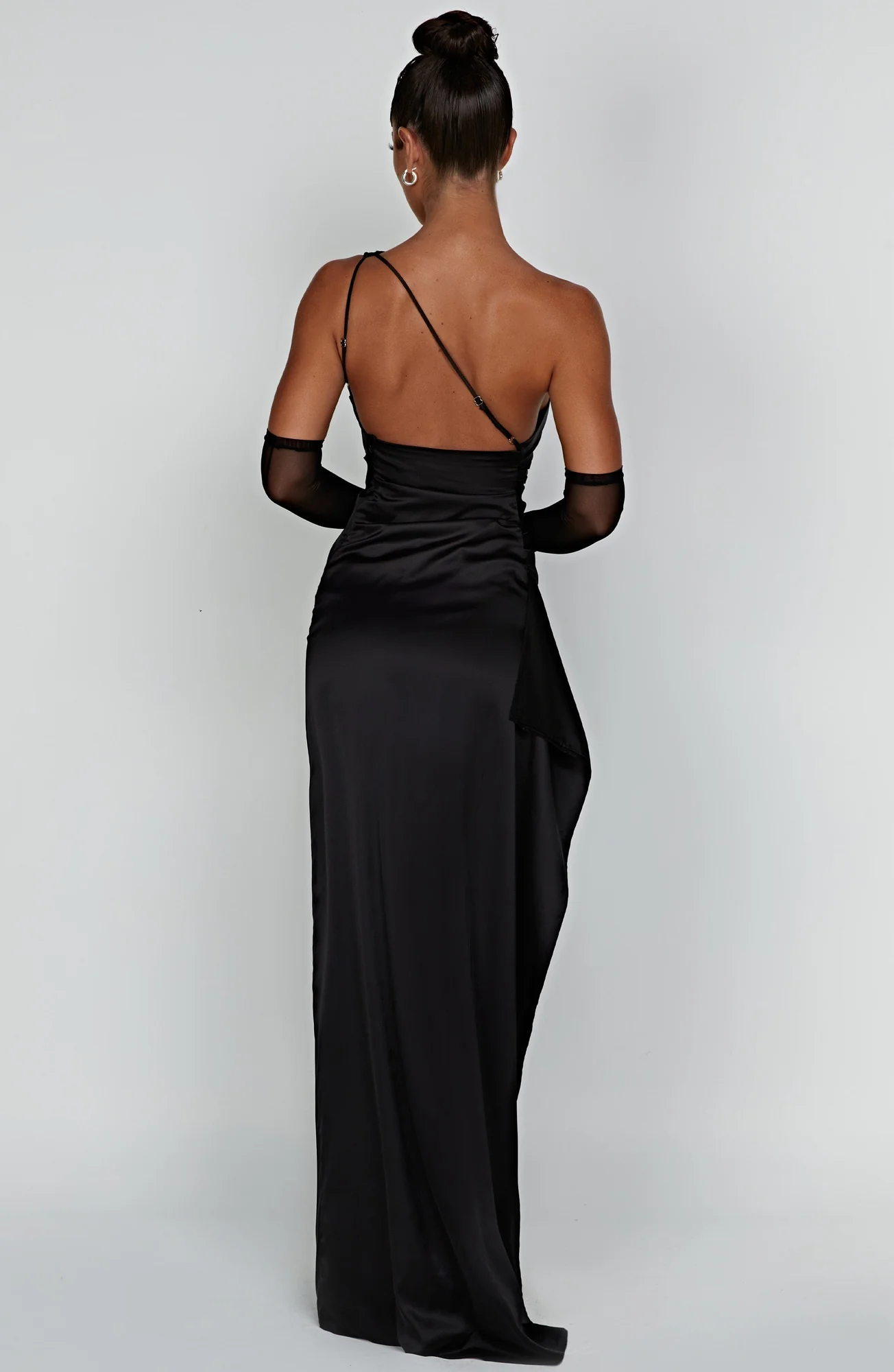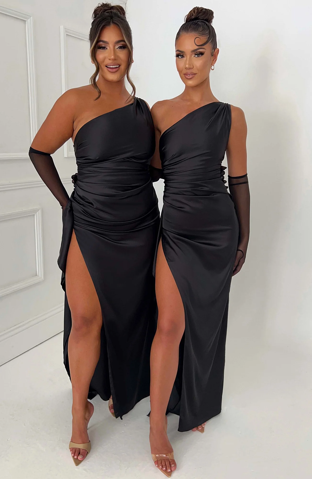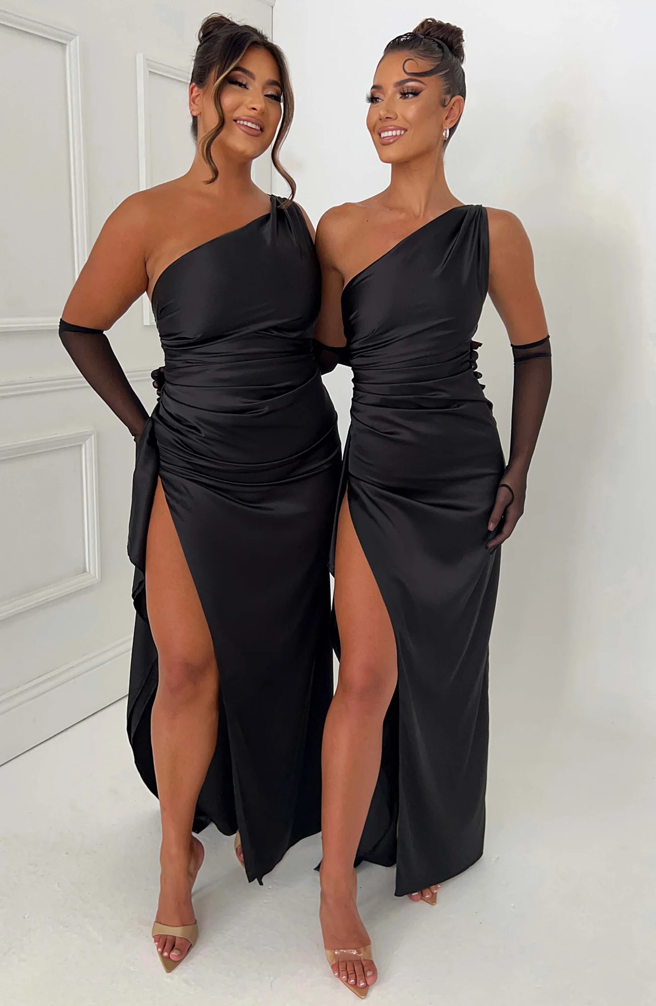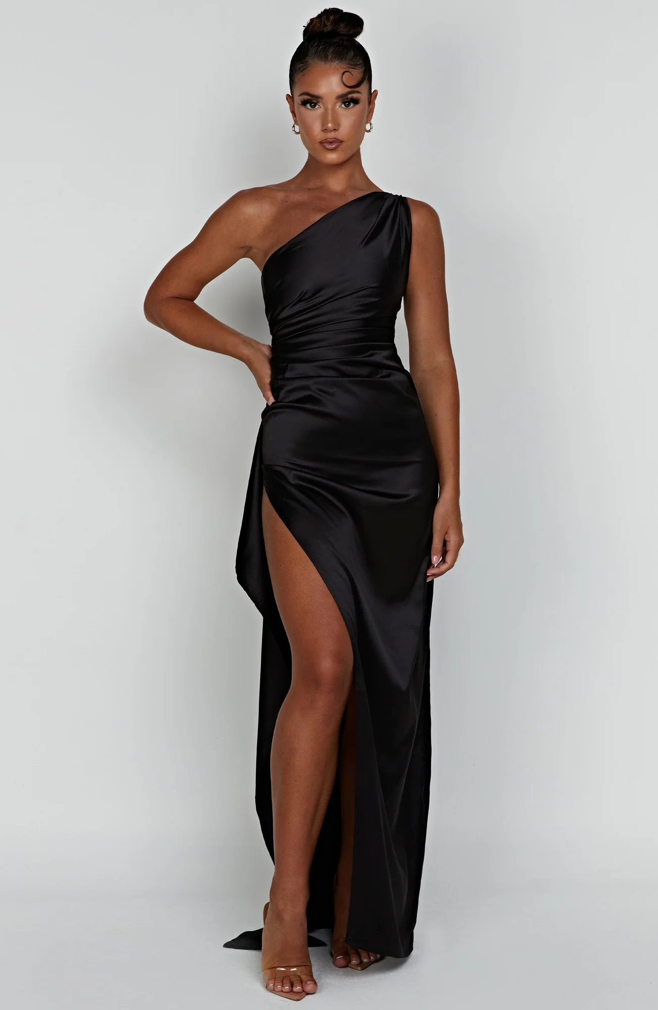 Elevate your style with our Black Satin One Shoulder Maxi Dress. Crafted from premium lightweight satin, this gown features a body-hugging fit, draped detailing, and a thigh-high split for a glamorous look. Perfect for weddings, parties, and any special occasion. Complete your outfit with heeled mules and a mini bag. Available in sizes XS to XXL.