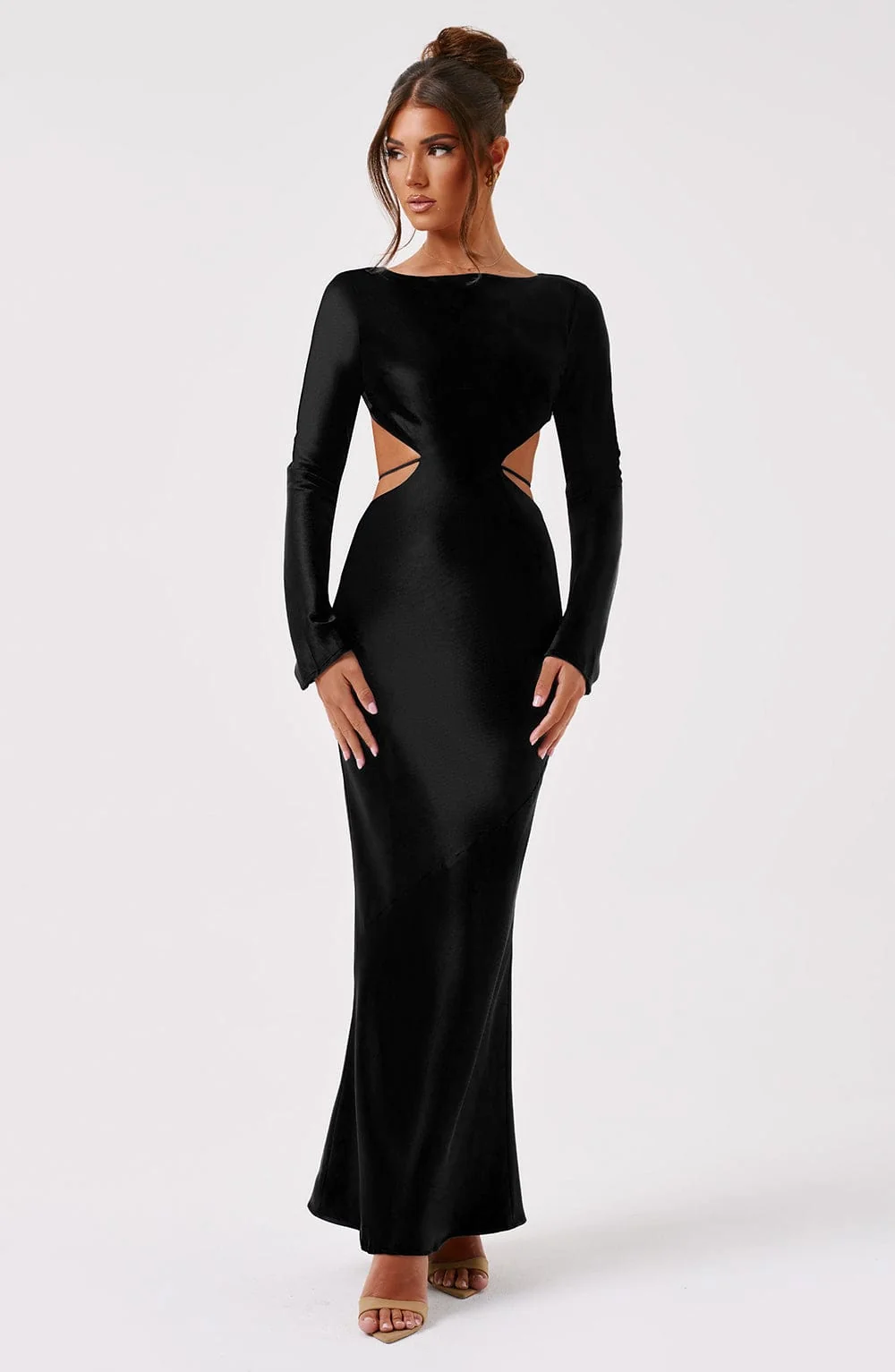 Turn heads at any event with our Rafi Maxi Dress in black. Exuding elegance, this dress features a high neck, long sleeves, and a stunning low plunged back with tie detail. Made from premium non-stretch satin, the bias cut drapes beautifully, accentuating your figure. Whether its a wedding or a formal evening, make a statement with Rafi. Suitable for all seasons. Available in sizes XS to XXL.