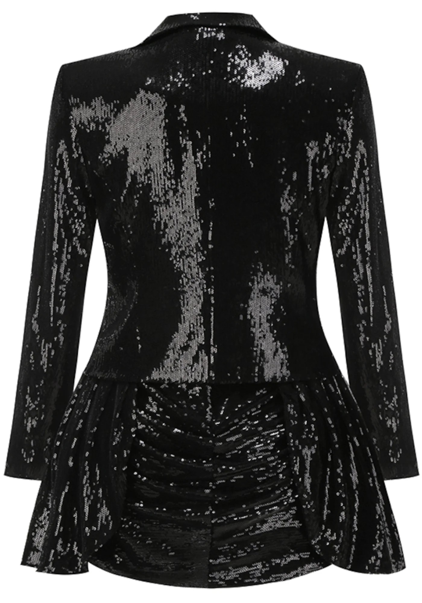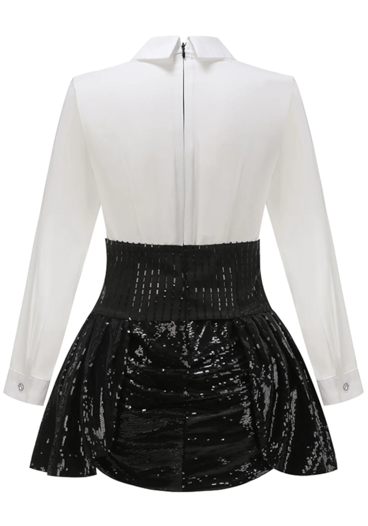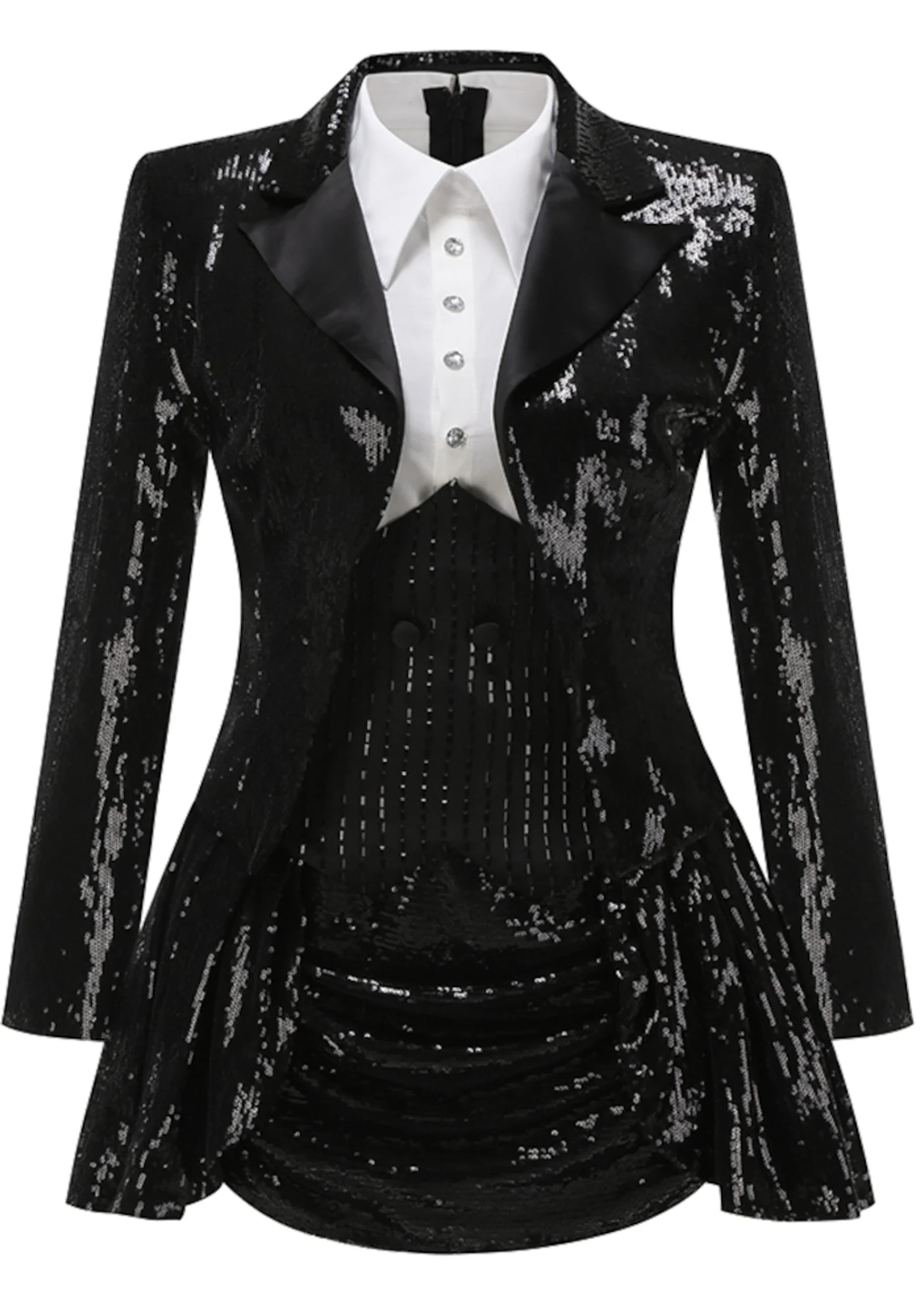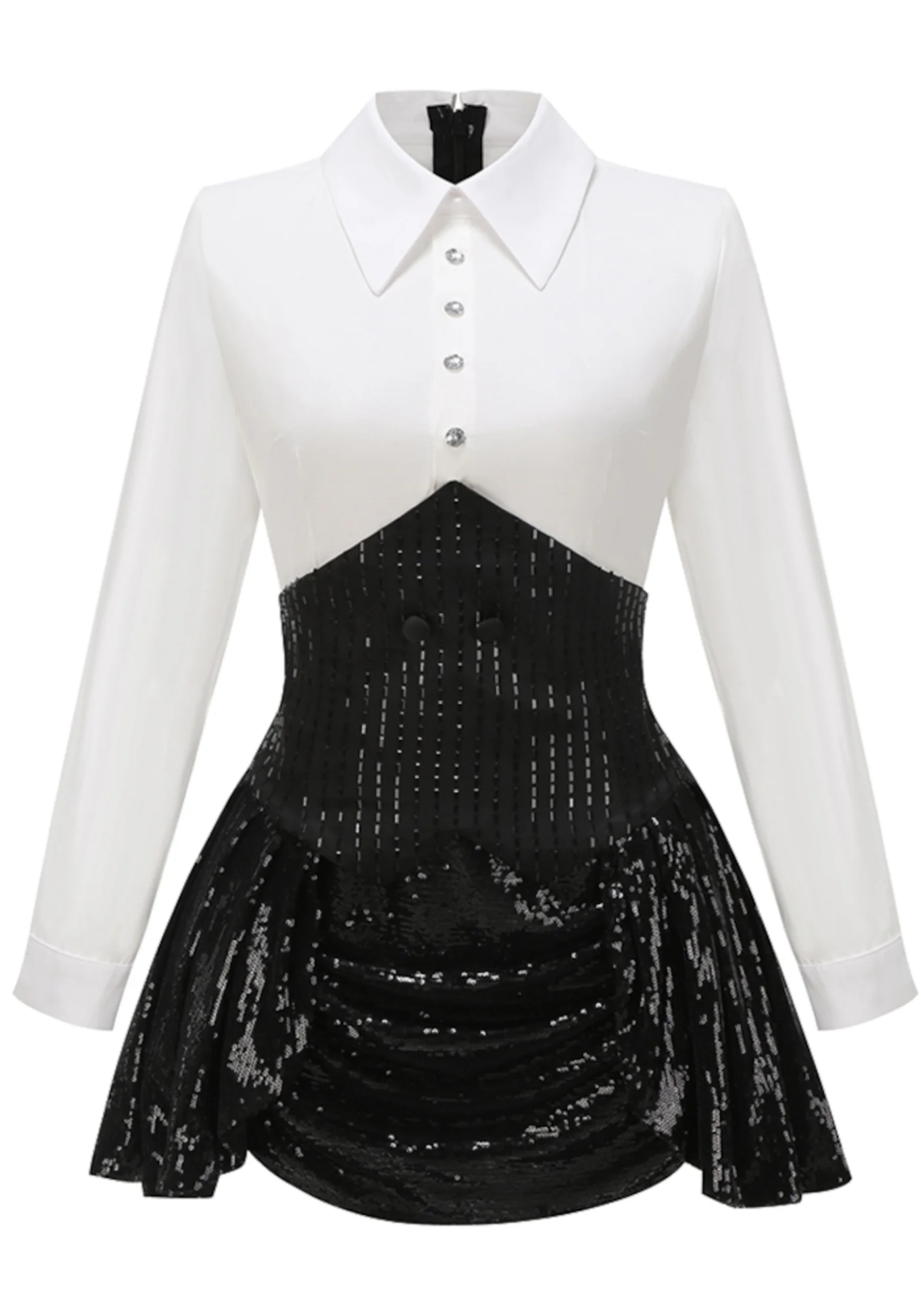 This stunning black two-piece dress features a sequined V-neck top with long sleeves and a button detail. The A-line skirt is elegantly draped and embellished with rhinestones. Made of high-quality polyester and cotton blend, this dress is durable with delicate sewing and YKK zipper. Care: Gentle dry clean only. Light may affect color perception. Discover luxury in simplicity with this fashionable ensemble.