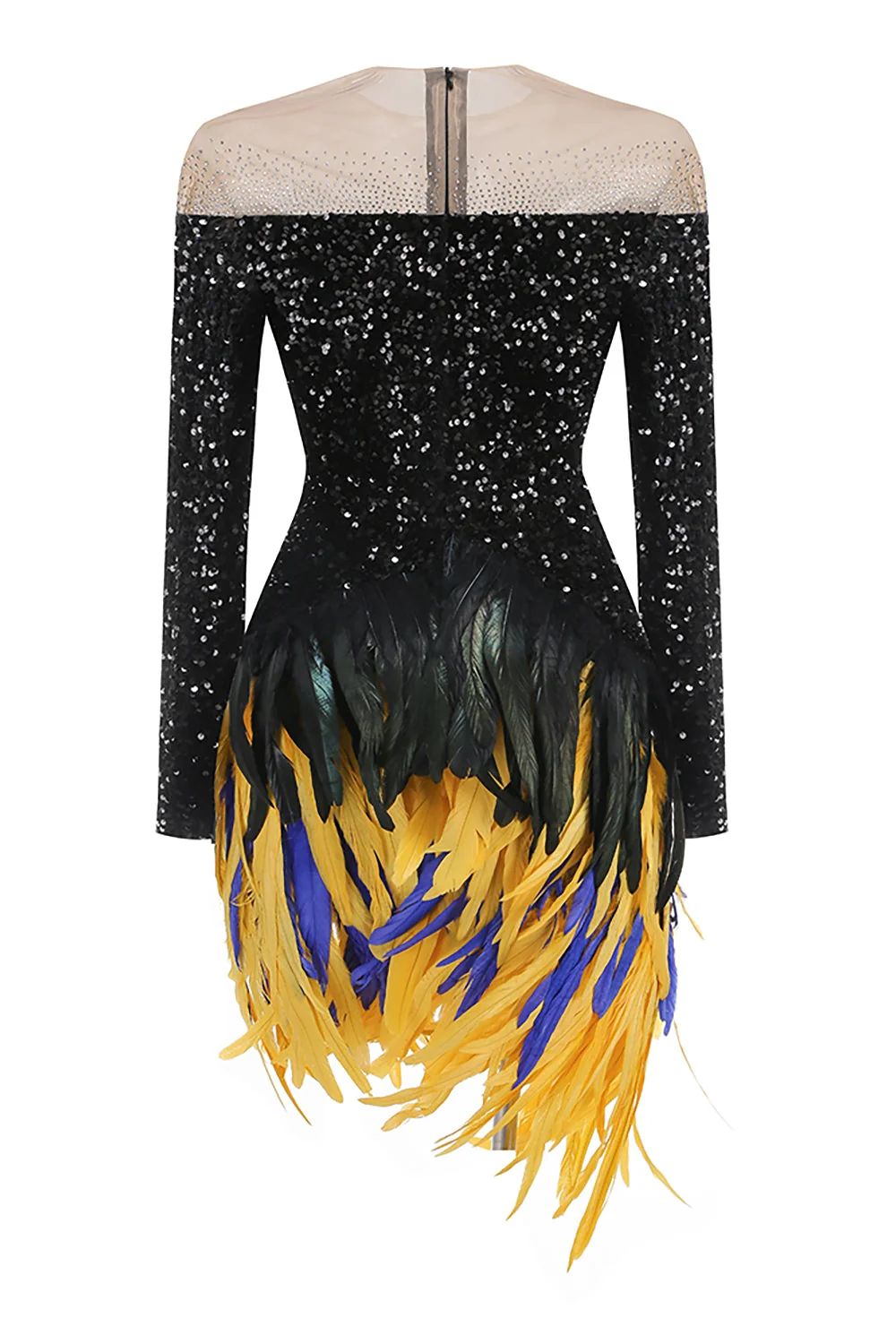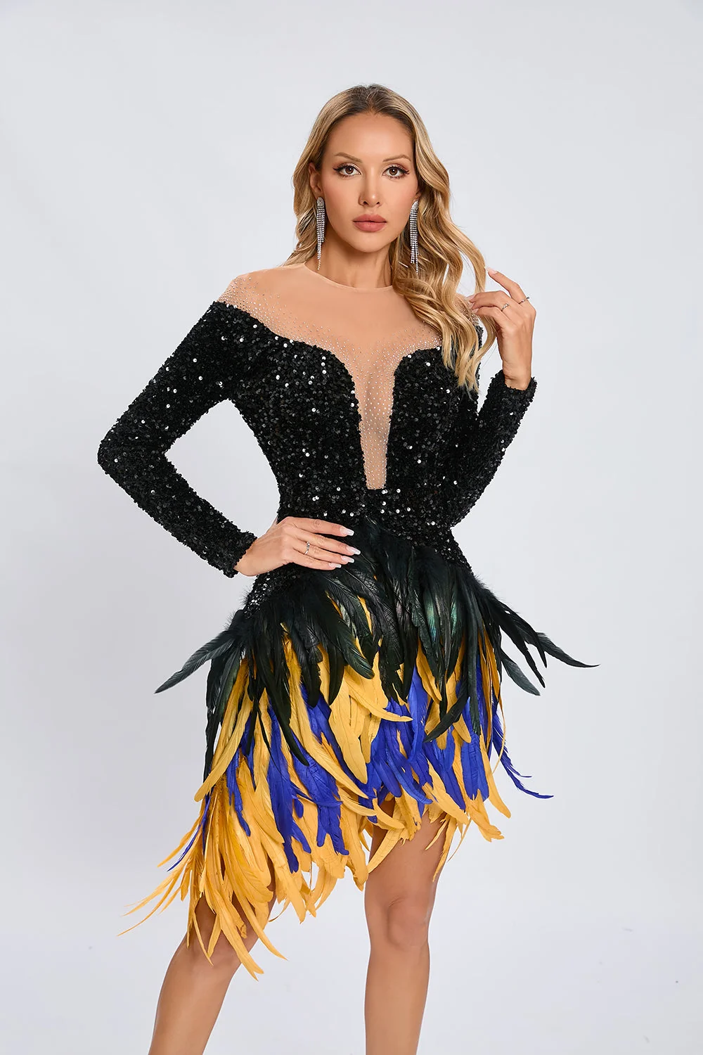 Elevate your style game with our stunning Black Sequin Feather Mini Dress! The intricate sequin and feather details add a touch of glamour to any occasion. Make a statement and turn heads with this must-have dress. This elegant dress is made of 100% Polyester, ensuring both comfort and style. The gentle dry clean only care requirement ensures lasting quality. Available in sizes S, M, and L: Bust (cm/inch) – 82/32, 86/34, 90/35; Waist (cm/inch) – 60/24, 64/25, 68/27; Hip (cm/inch) – 85/33, 89/35, 93/37; Dress Length (cm/inch) – 96/38, 97/38, 98/39. Embrace your inner diva with this chic dress! Note: Measurements may have a range of 3cm tolerance.