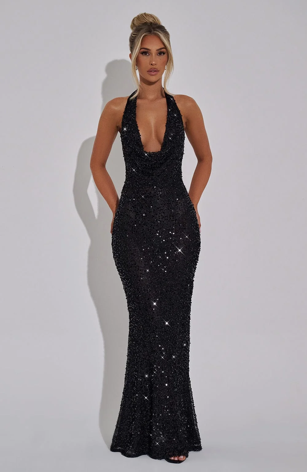 Experience the epitome of luxury in the Black Sequin Halterneck Maxi Dress from L.F. Crafted from sumptuous sequin net fabric, this stunning dress boasts a semi-sheer design complemented by a mesh lining for maximum comfort. The halterneck straps and chic low cowl neckline ooze sophistication, while the alluring low scoop back and stylish diagonal seam on the skirt elevate elegance to new heights. Perfect for formal events, evenings out, or special occasions. Color: Black. Luxury sequin net fabric. Mesh lining for comfort. Semi-sheer appearance. Halterneck straps for a stylish look. Chic low cowl neckline. Eye-catching low scoop back. Exquisite diagonal seam detail on skirt. Floor-length for a glamorous touch.