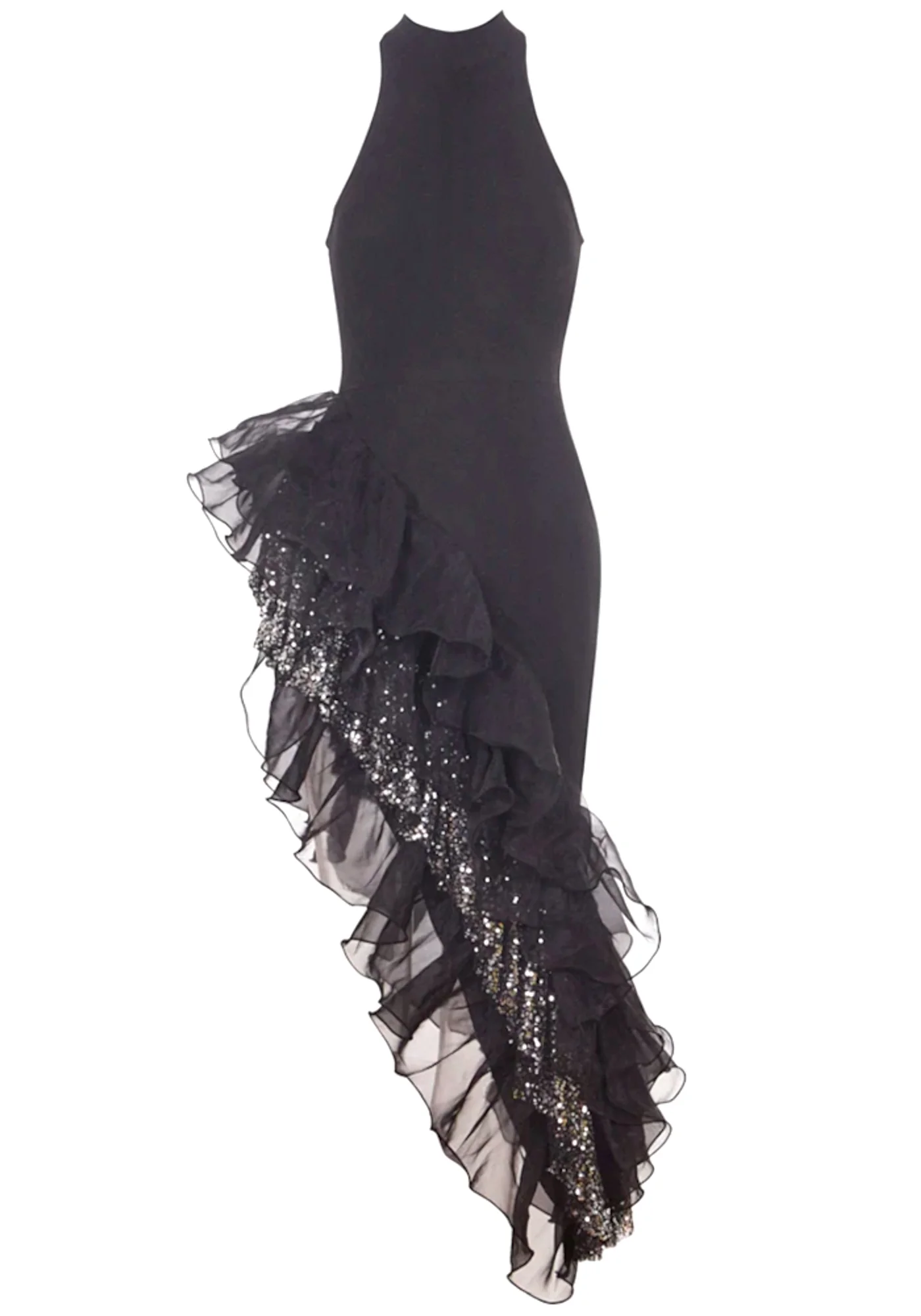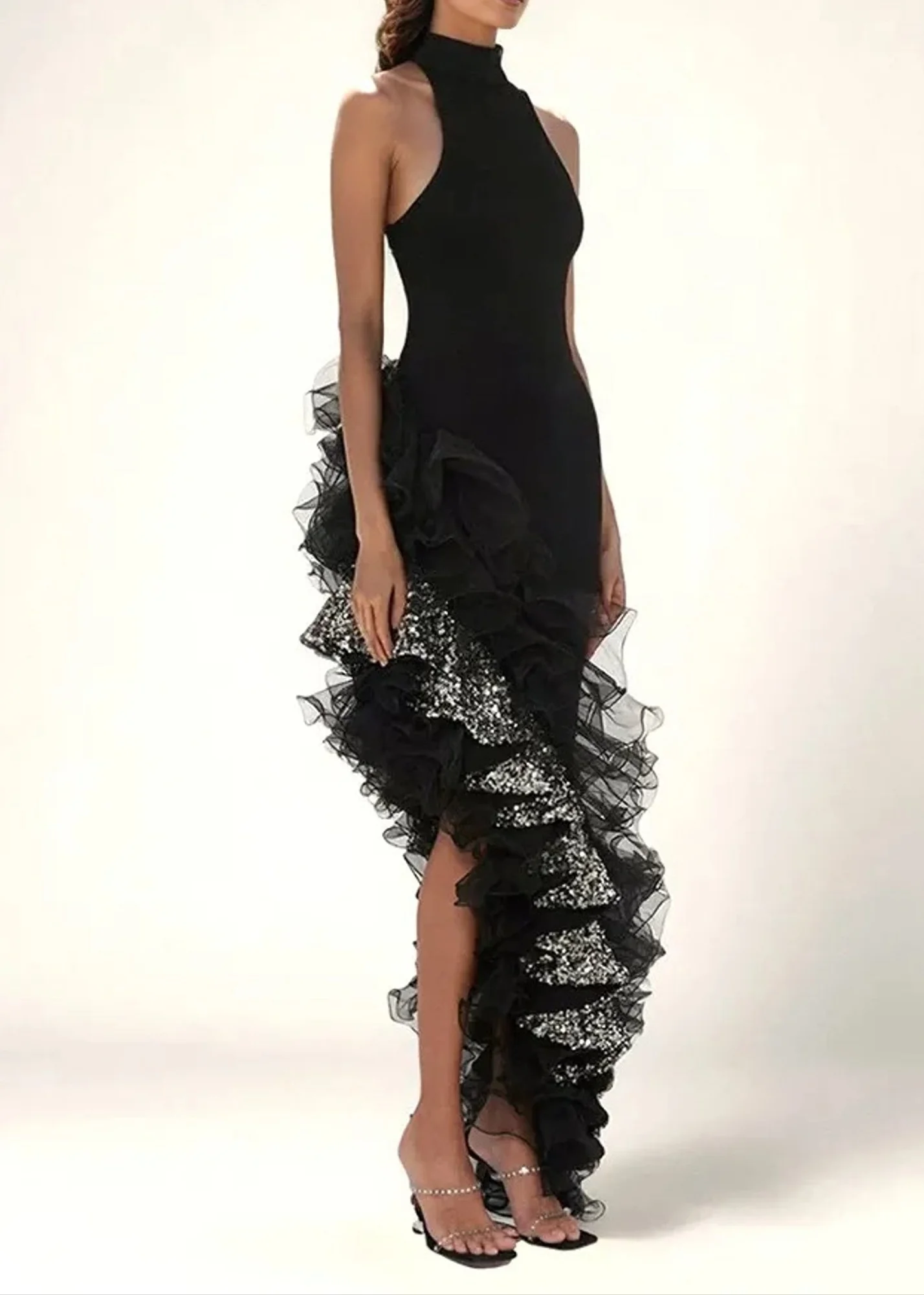 Indulge in elegance with our Black Sequin Ruffle Halterneck Maxi Dress. This stunning dress features a sequined design with a mesh insert, an asymmetric hem, and a YKK zipper for durability. Made from 90% Rayon + 9% Nylon + 1% Spandex, it offers anti-wrinkle properties, vibrant colors, high elasticity, and exceptional durability. Experience a perfect fit with delicate sewing and hemming techniques. Care instructions provided ensure long-lasting beauty. Elevate your style effortlessly.