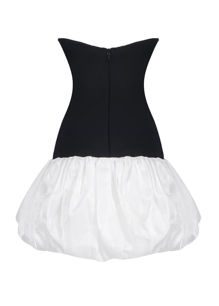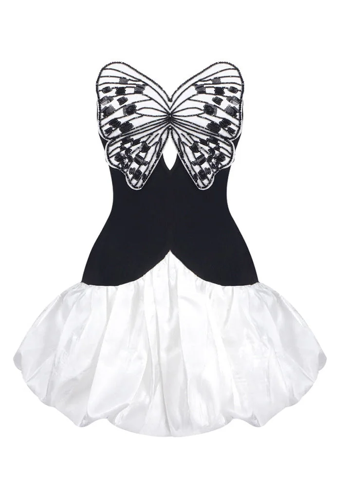 This stylish black mini dress features a strapless, sleeveless design with sequined butterfly and puff details. Made from a blend of Polyester and Cotton, it boasts a colorblock effect and a concealed zipper at the back. Delicately sewn with a durable needle lockstitch machine, it includes a YKK zipper for longevity. Remember to dry clean only. Make a statement with this chic dress, perfect for any occasion.