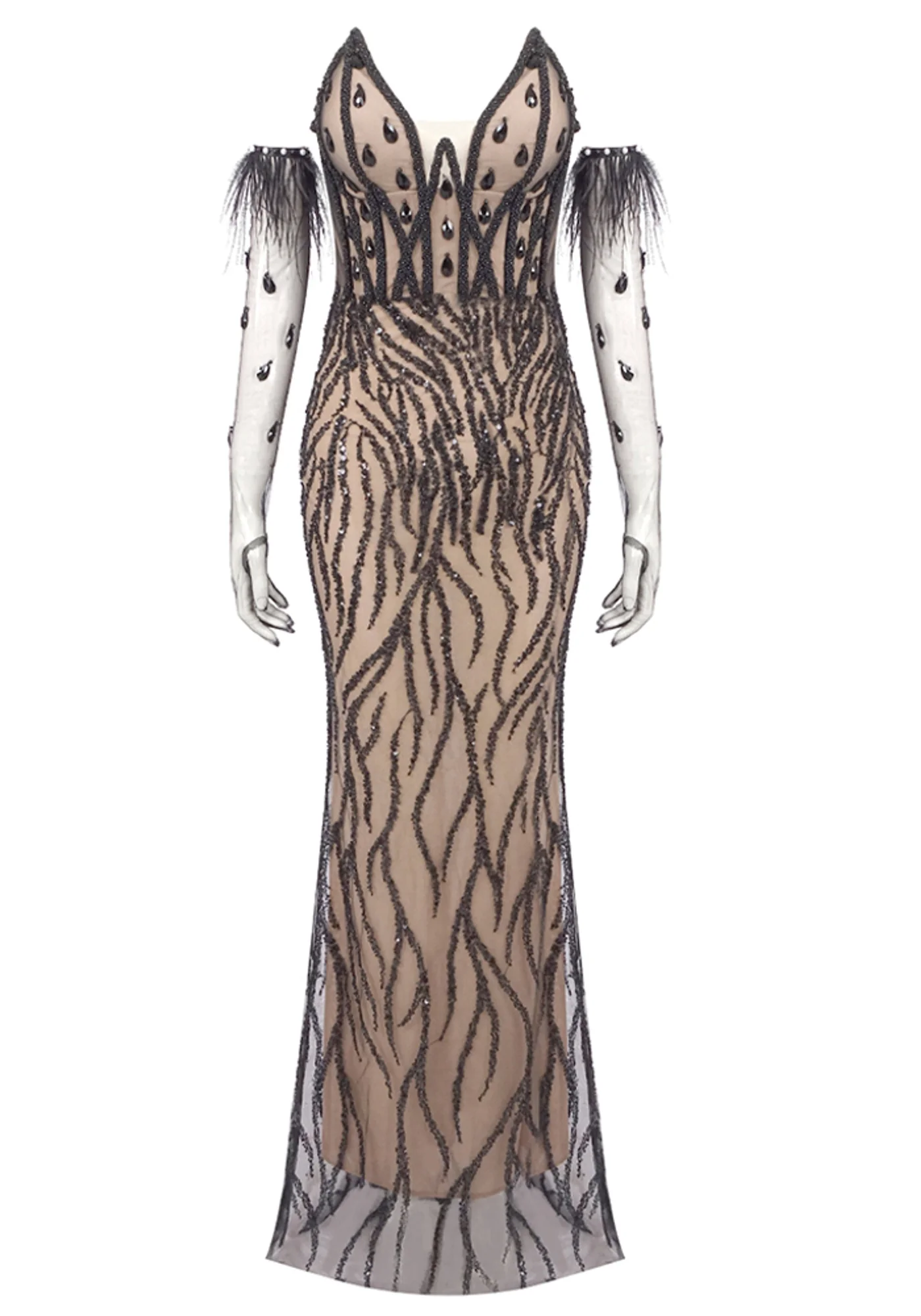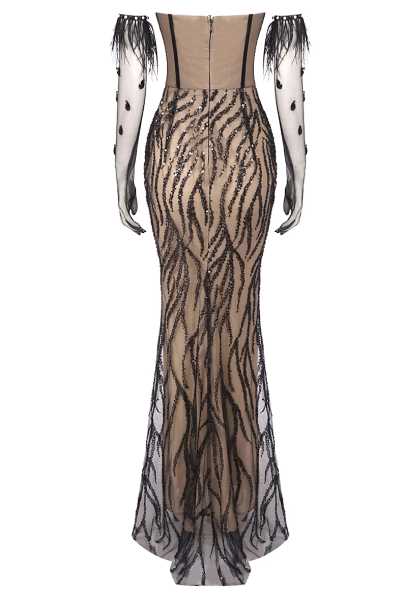 Steal the spotlight in this elegant black sequined mesh strapless maxi dress. Featuring a bustier detail, sleeveless design, feather accents, and a concealed zipper at the back. This dress is perfect for special occasions. The color may vary slightly due to lighting. Remember, the product images without the model offer the truest color representation. Rest assured, this dress fits true to size according to our chart, so no need to size up or down. Make a grand entrance and own the night in style!