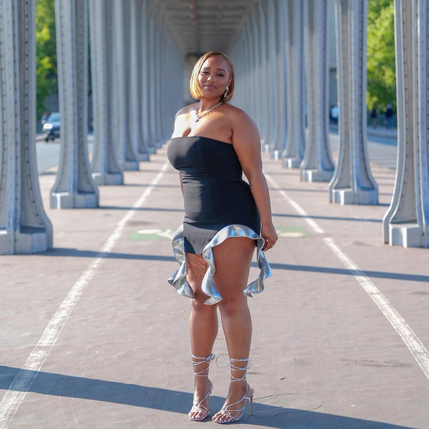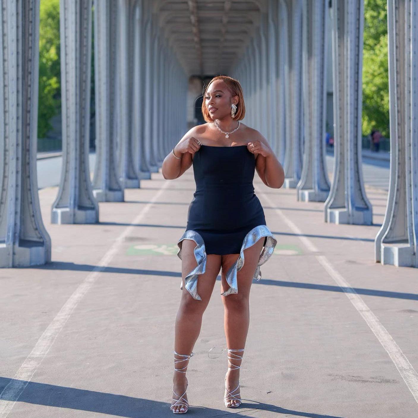 Elevate your style with the Black Sequined Ruffles Bandage Mini Dress. This dazzling mini dress features shimmering sequins and elegant ruffles that will surely make you stand out at any event. The bandage design offers a flattering fit that beautifully hugs your curves. Perfect for festive occasions, the playful ruffles add a touch of fun to your ensemble. Crafted from high-quality materials, this dress ensures both comfort and durability. Dance the night away in breathable fabric that allows you to move effortlessly. Turn heads, shine bright, and make a statement with this show-stopping mini dress. Experience the ultimate in style and comfort with our exquisite design.