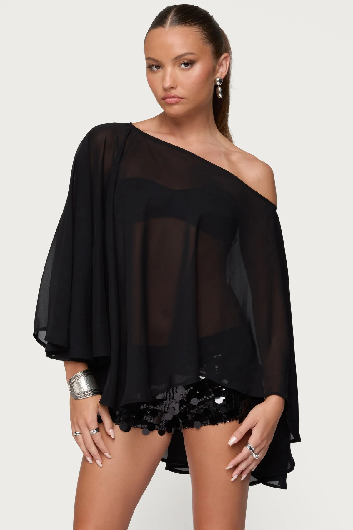 Enhance your evening wear collection with this stunning Black Sheer Chiffon Asymmetric Poncho Top. Made from sheer chiffon fabric, featuring an off-shoulder design and asymmetric hem for a fashionable look. This top is perfect for special occasions and can be styled with ease. Care instructions: Machine wash cold, do not bleach, hang dry, iron low, do not dry clean.