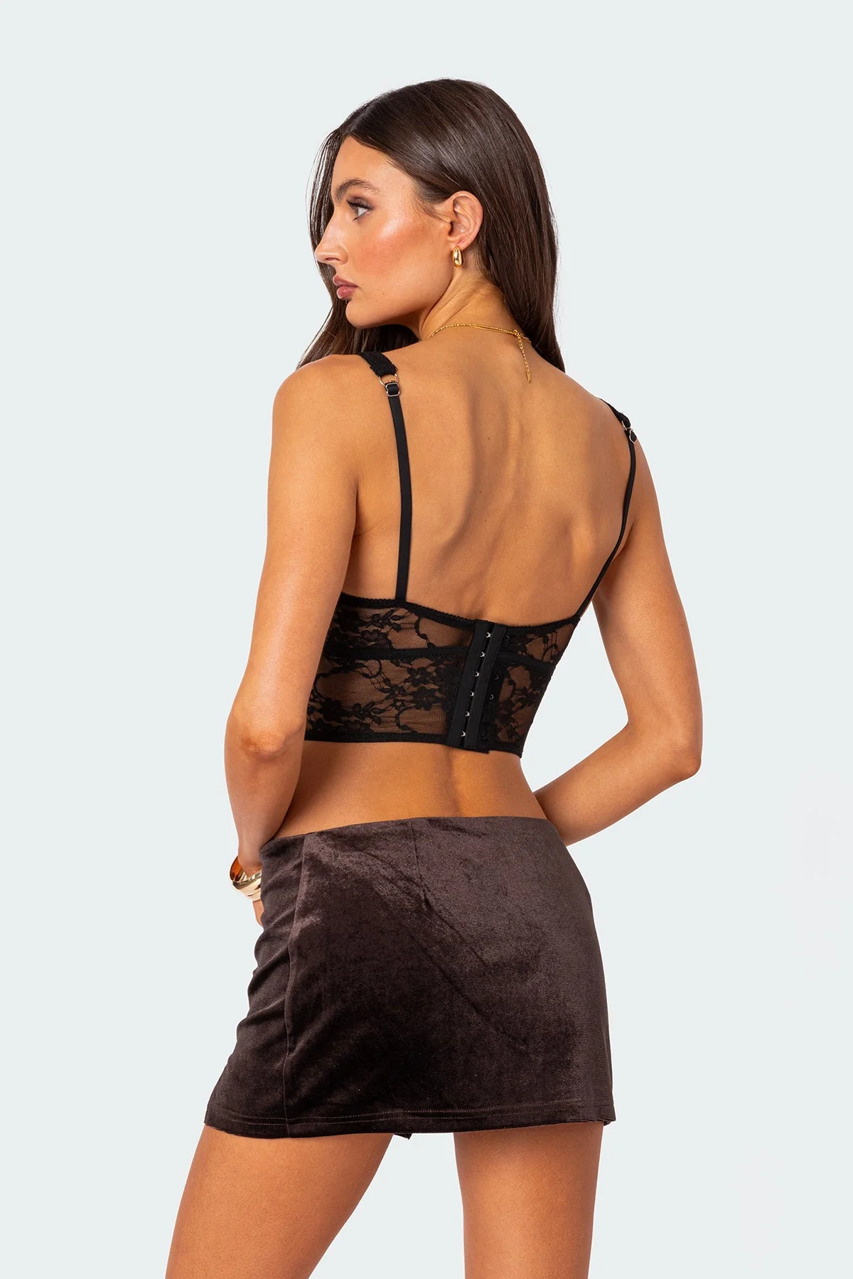 Experience elegance and allure with our Black Sheer Lace Corset Bra Top. Designed with lined cups and crafted from sheer lace fabric using premium polyester and spandex materials, this top exudes sophistication. Whether worn casually or for evening wear, this piece offers both style and comfort. Embrace your femininity effortlessly with a look that inspires confidence and beauty. Model wears size S. Model height is 59. Care instructions: Wash with similar colors.