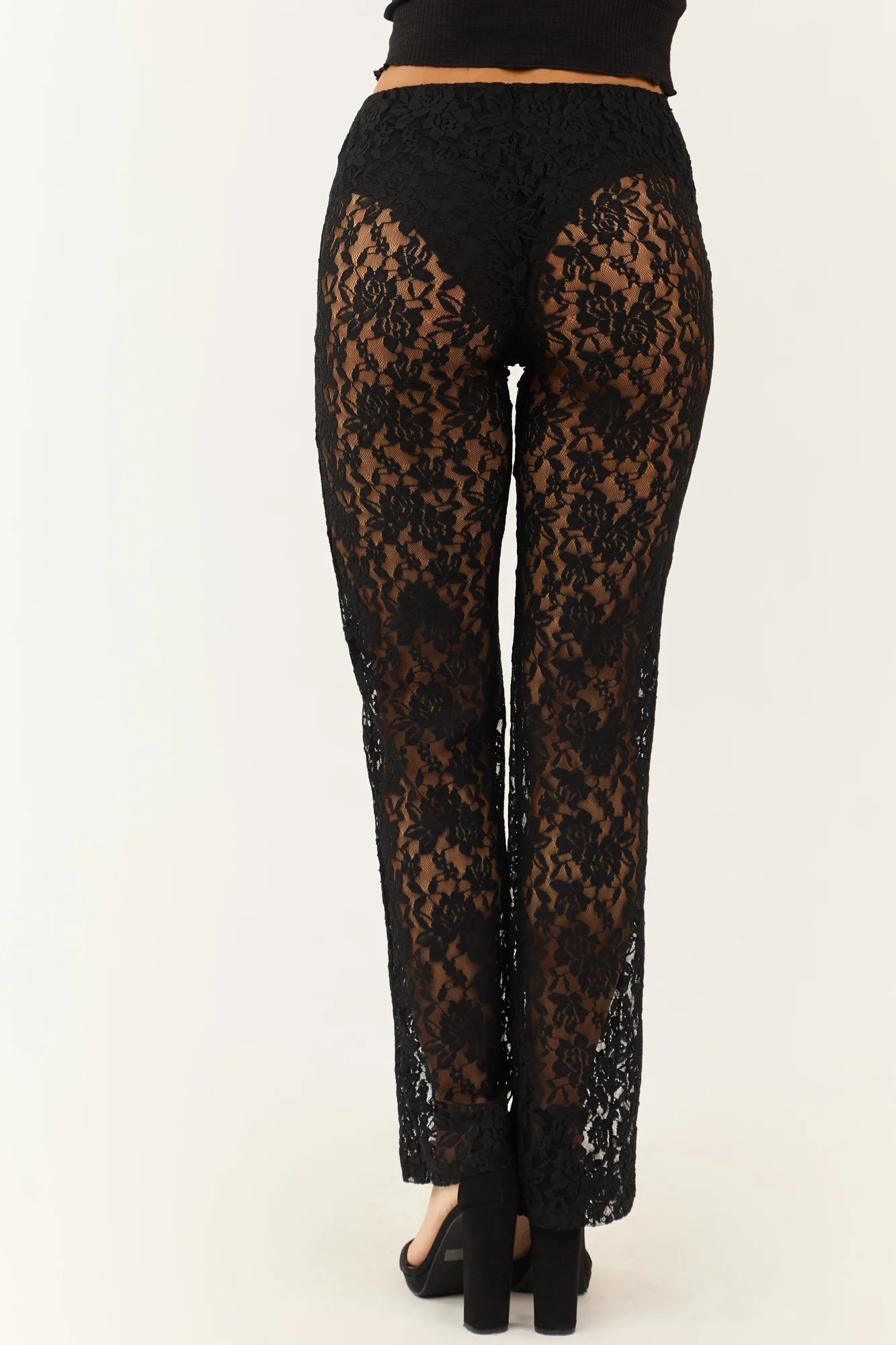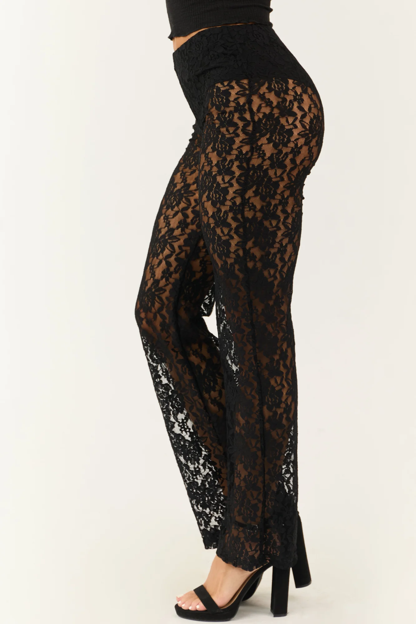 Indulge in elegance with our Black Sheer Lace Straight Leg Pants. Crafted from a blend of 95% Polyester and 5% Spandex, these pants feature semi-stretchy lace with an elastic waistband for a comfortable fit. The pants come with an underwear lining and are available in sizes S, M, and L. Perfect for both casual and formal occasions, these pants can be machine washed cold on a delicate cycle. Elevate your wardrobe with these exquisitely stylish pants.