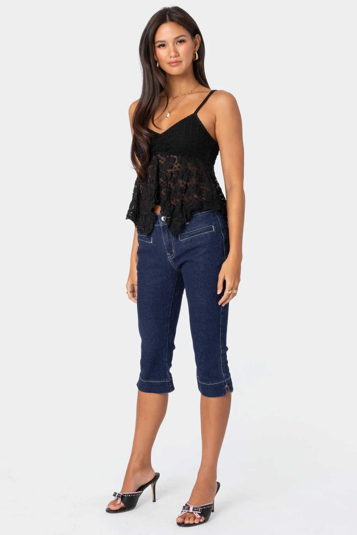 Upgrade your wardrobe with this elegant Black Sheer Lace Tank Top featuring an asymmetric hem, adjustable straps, lined bust, center ruching, and sheer lace fabric. Crafted from a blend of Polyester and Spandex for a comfortable fit. Perfect for any occasion. Machine wash at max 30ºC, non-chlorine bleach, tumble dry low, iron at max 110ºC, avoid dry cleaning. Available in sizes XL, XS, M, S, and L.