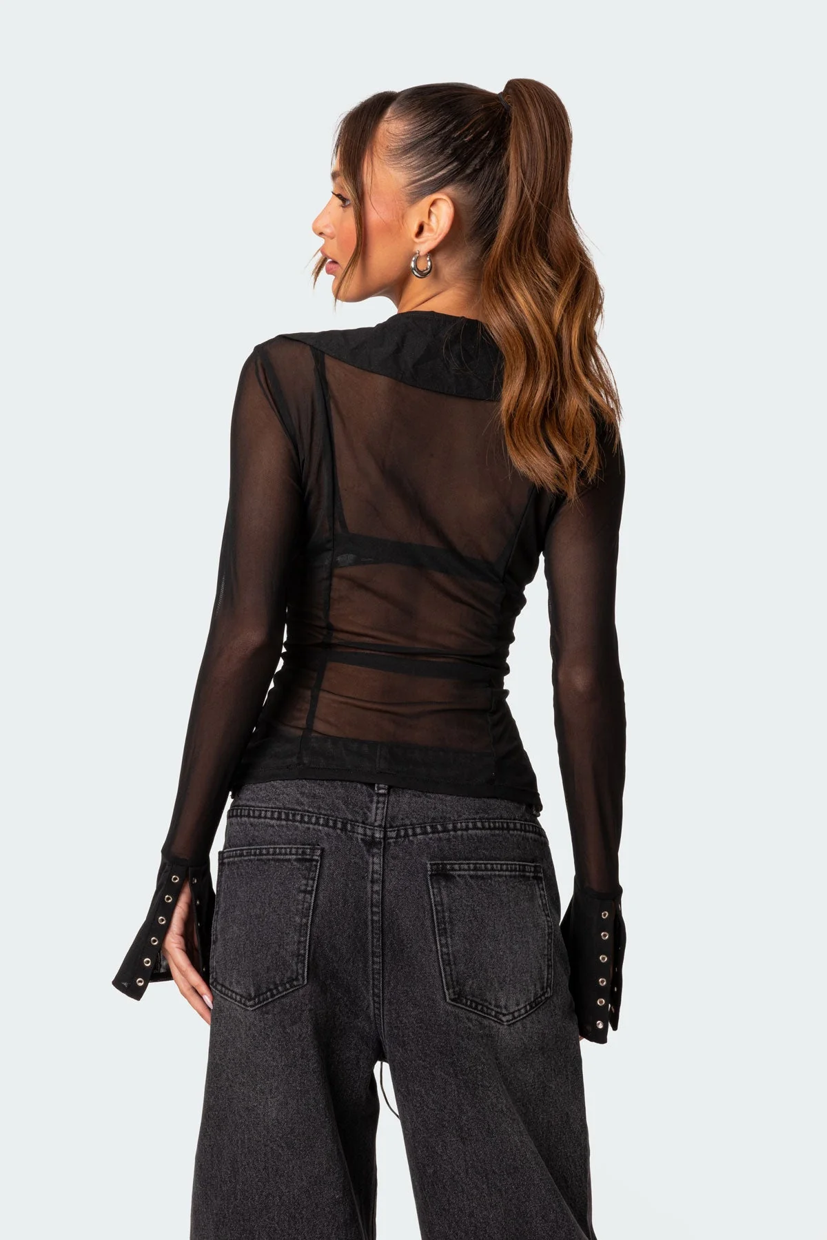 Upgrade your wardrobe with our black lace-front shirt featuring sheer mesh fabric. Made of polyester and spandex, this stylish shirt is a must-have. The model is wearing size S and is 59 tall. To care for this item, wash with similar colors for long-lasting quality.