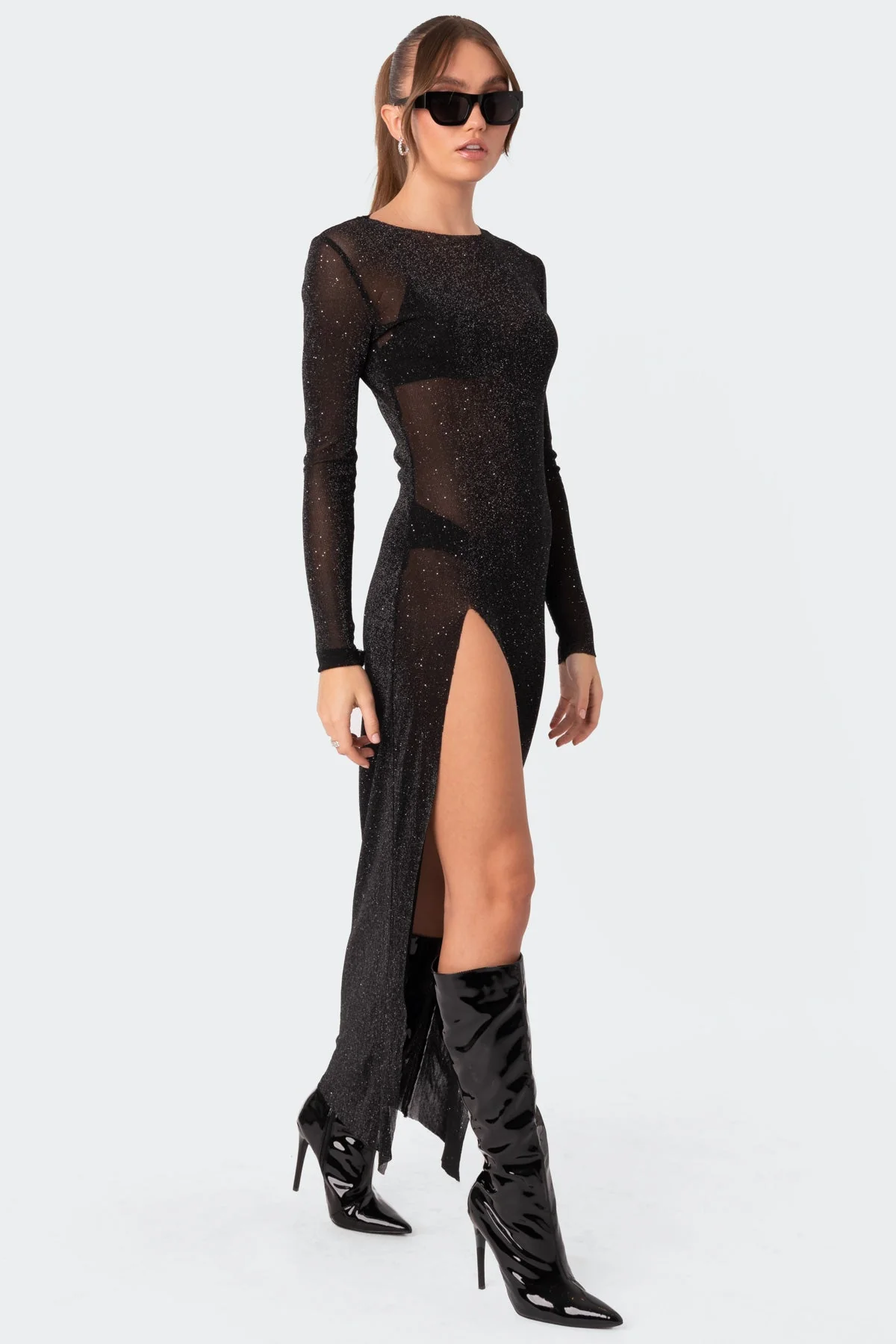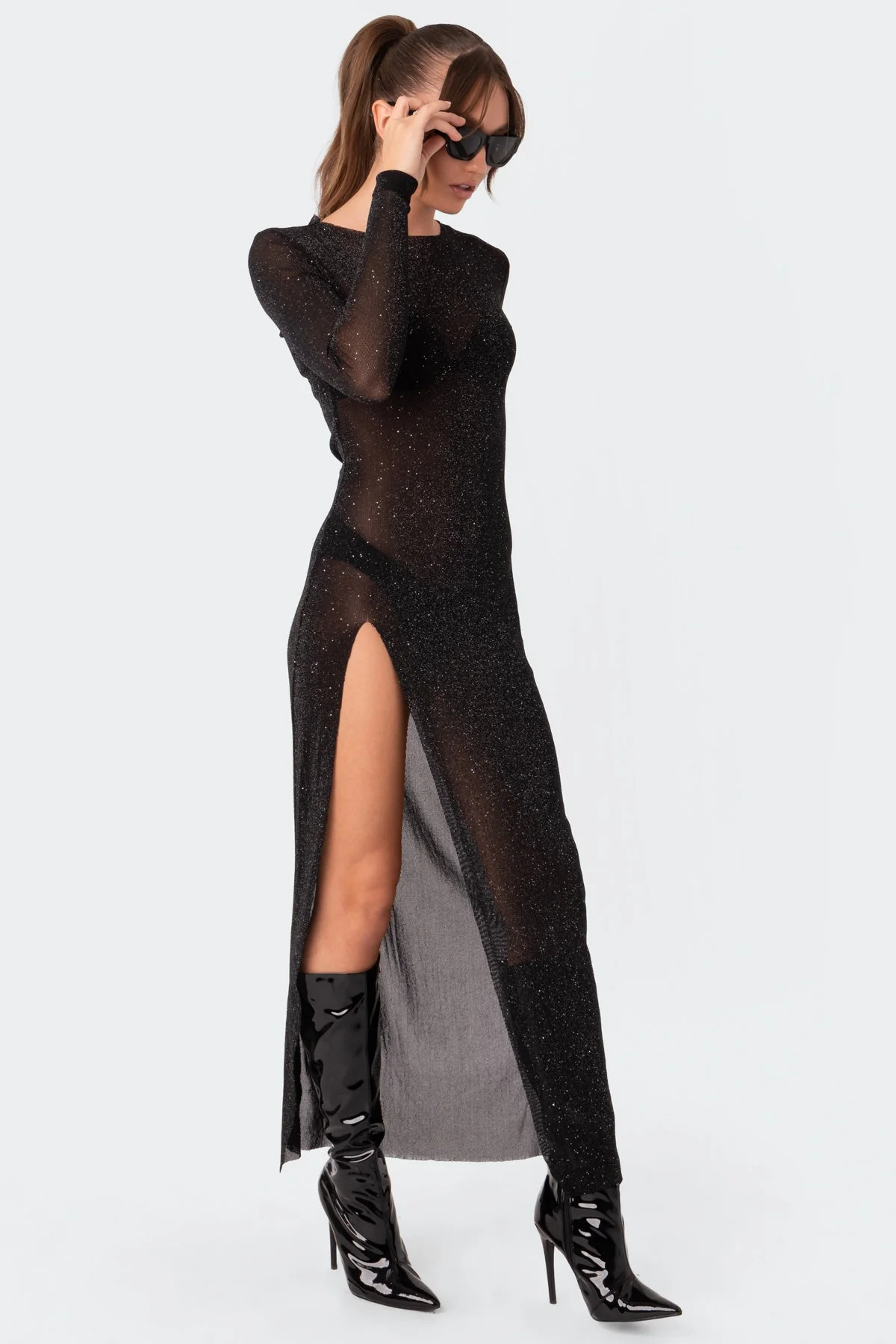 Elevate your style with our black sheer mesh maxi dress featuring a shiny finish and elegant side slit detail. Made from a blend of polyester and spandex, this dress is perfect for evening wear, with long sleeves for added sophistication. The model in the picture wears size S and is 58 tall. To keep this stunning piece looking its best, wash it with similar colors.