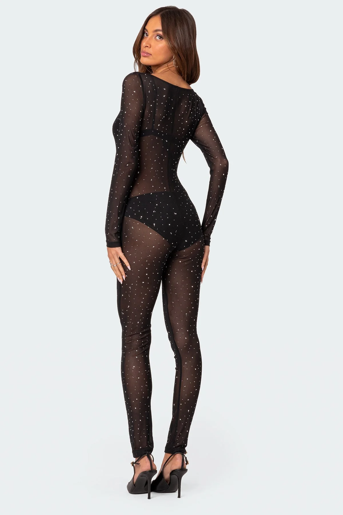 Indulge in sheer elegance with this black jumpsuit featuring intricate rhinestone detailing, long sleeves, and sheer mesh fabric for a glamorous look. Made of polyester and spandex blend, this jumpsuit is perfect for evenings out. The model wears size S, standing at 59″. Care instructions: Machine wash with like colors.