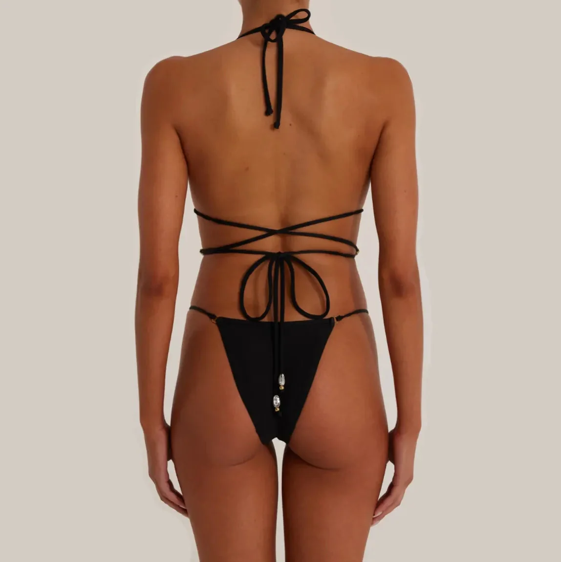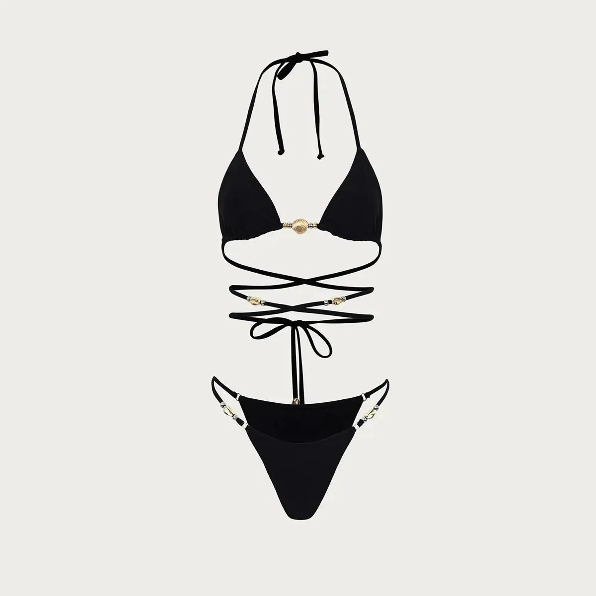 Experience beach elegance with this black halter bikini adorned with shell-shaped beads. The luxurious design, featuring adjustable straps for a perfect fit, is crafted from high-quality fabric ensuring comfort and style. Its flattering cut accentuates your curves, ideal for sunbathing or a poolside party. Explore chic styling ideas on Instagram @mermaid_way. Enjoy a complimentary exchange if sizing isnt perfect.