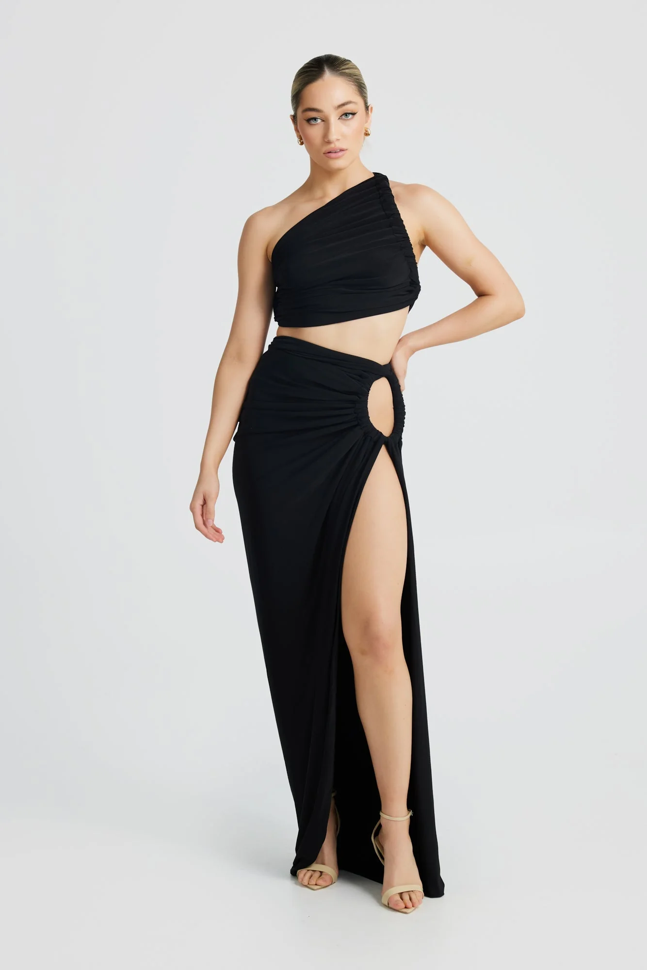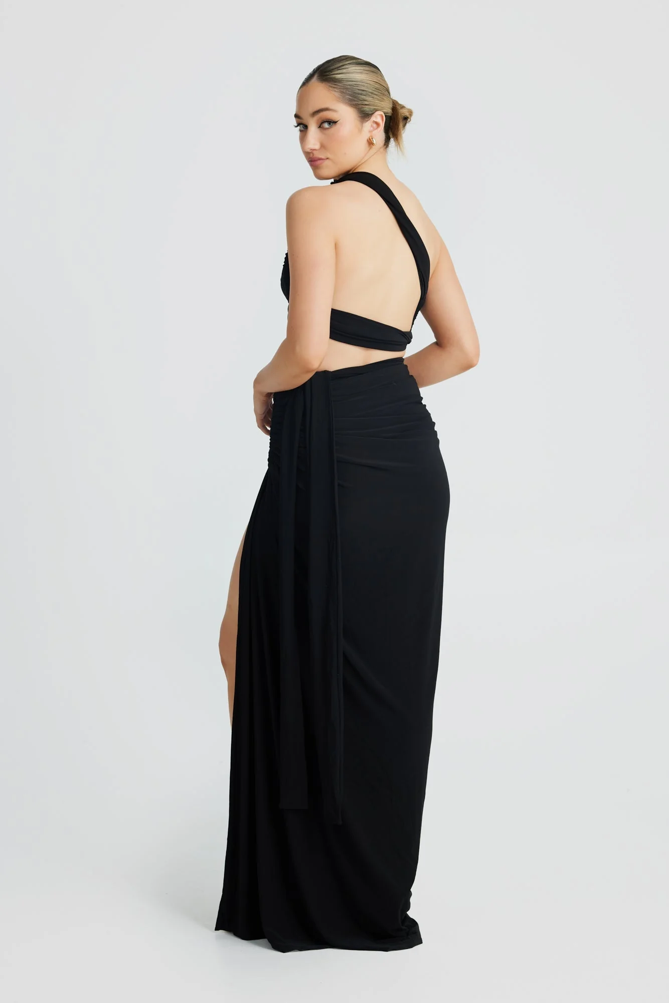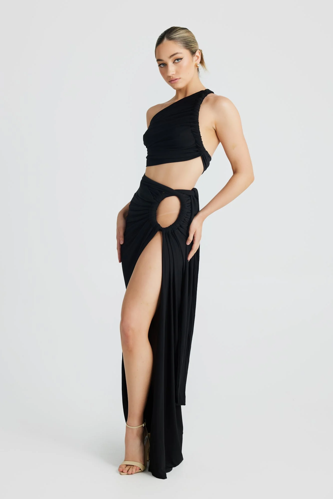 Elevate your style with the Black Slanted Shoulder Halter Set for women by Night Novas. This two-piece ensemble, made from a double layer of our premium stretch fabric, accentuates your curves and ensures a perfect fit. Youll love the fully lined, ultra-high slitted design that can be tied for an adjustable, flattering look. Crafted from 94% Polyester and 6% Spandex, this set is both comfortable and stylish. Available in sizes S, M, and L. Model is wearing size S.