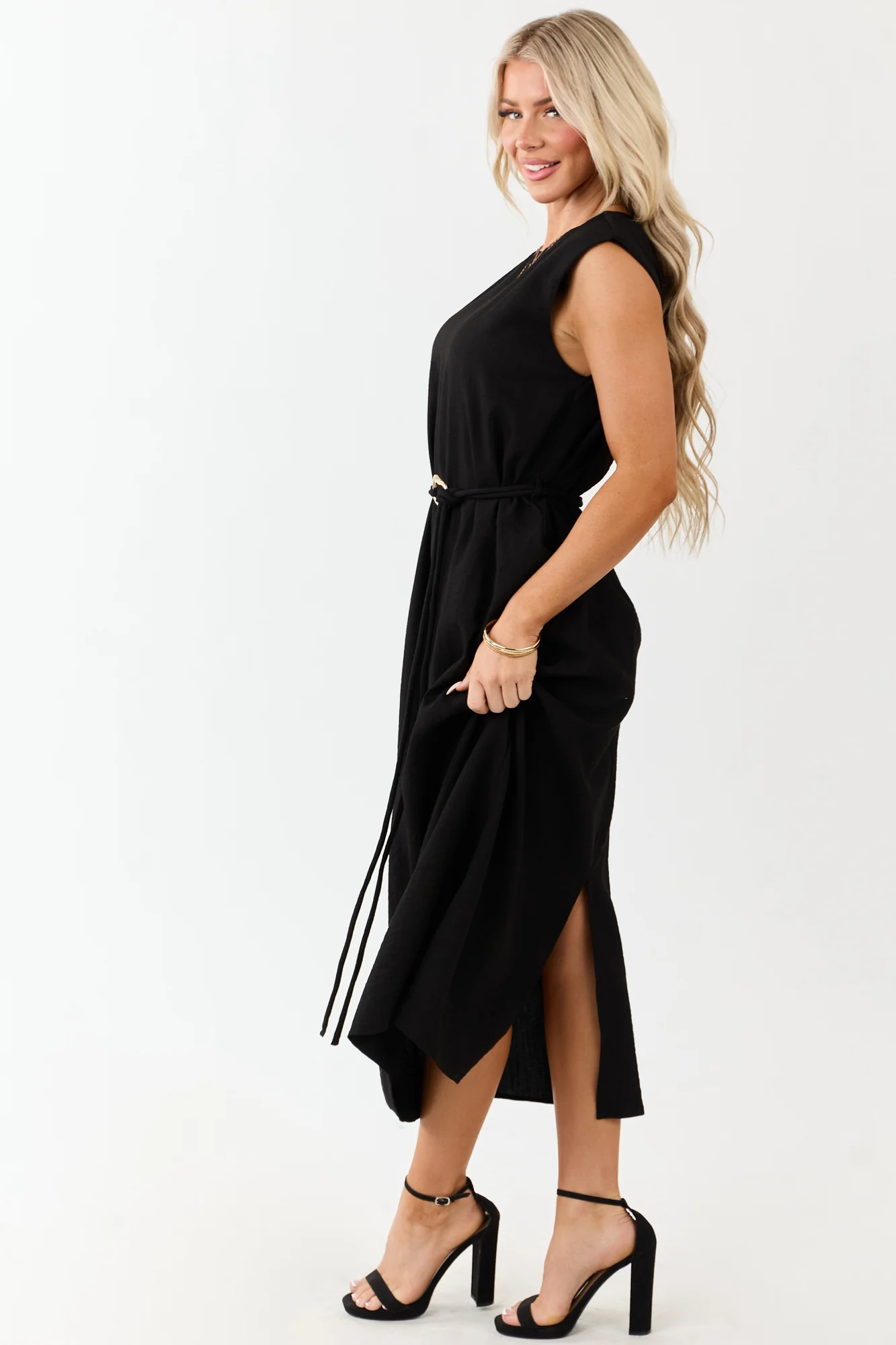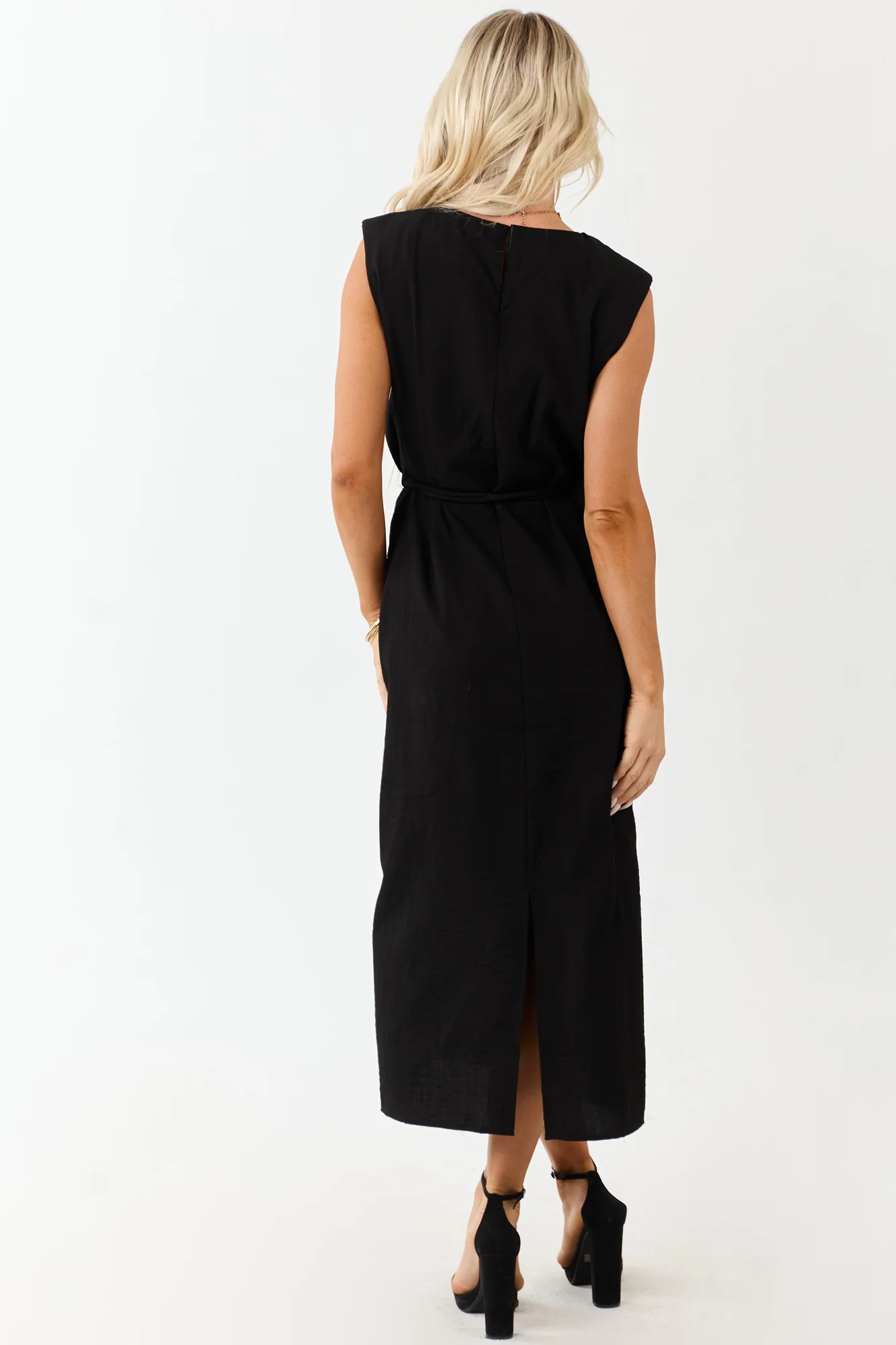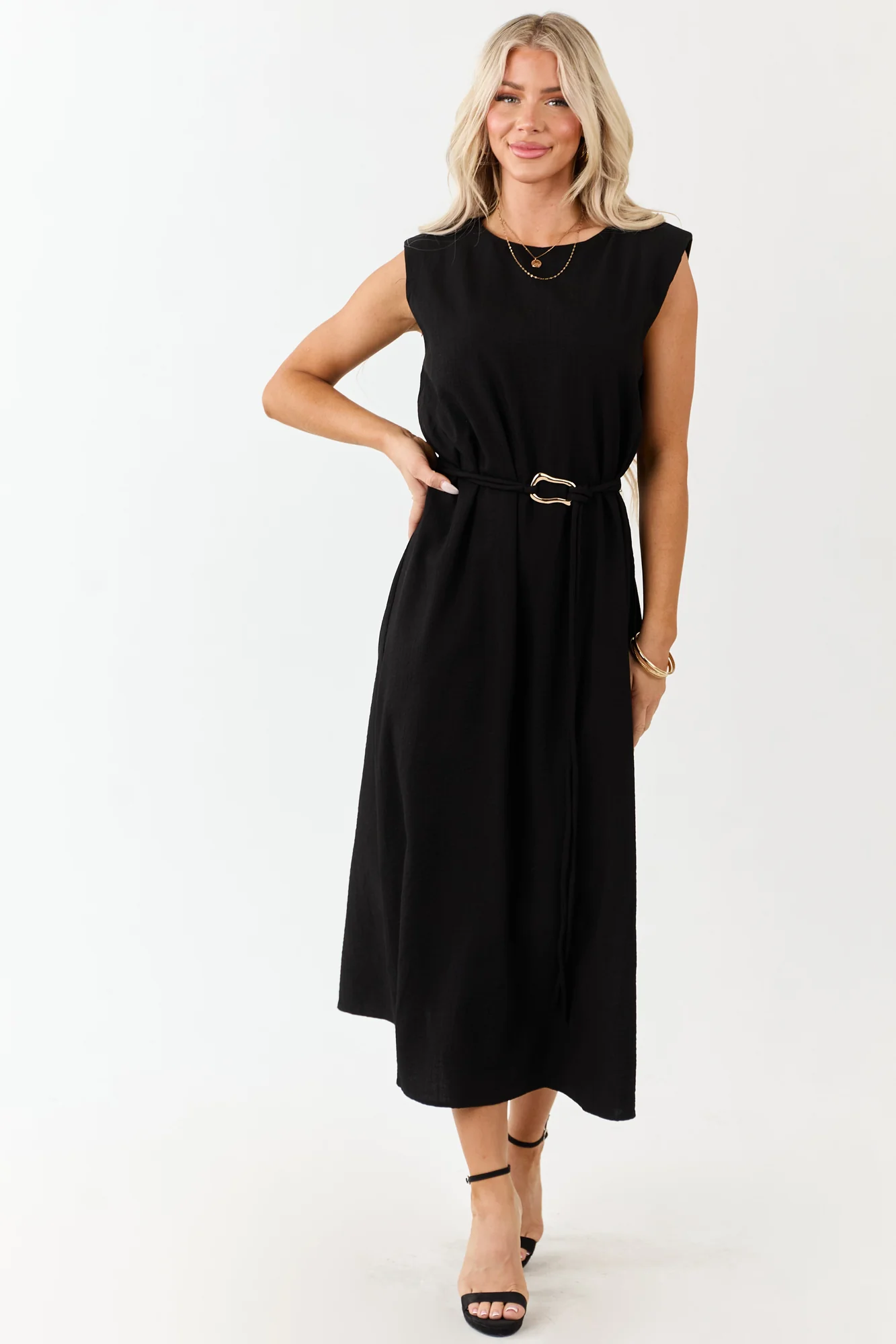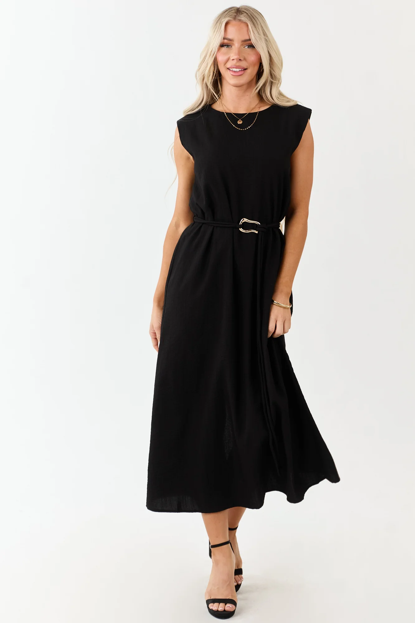 This classic black midi dress features a flowy fit, subtle shoulder padding, and a waist-cinching tie belt for a polished daytime or sophisticated evening look. Made from a blend of rayon, polyester, and nylon, the dress comes with optional belt tie, gold buckle, keyhole back, shoulder pads, and a back slit. Pair it with your favorite heels for a stunning outfit. Available in sizes XS to XL.