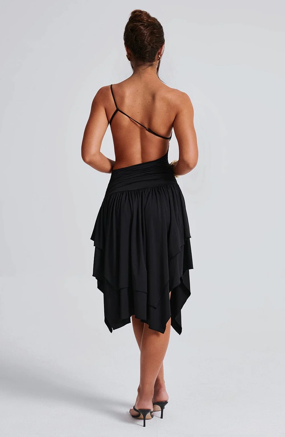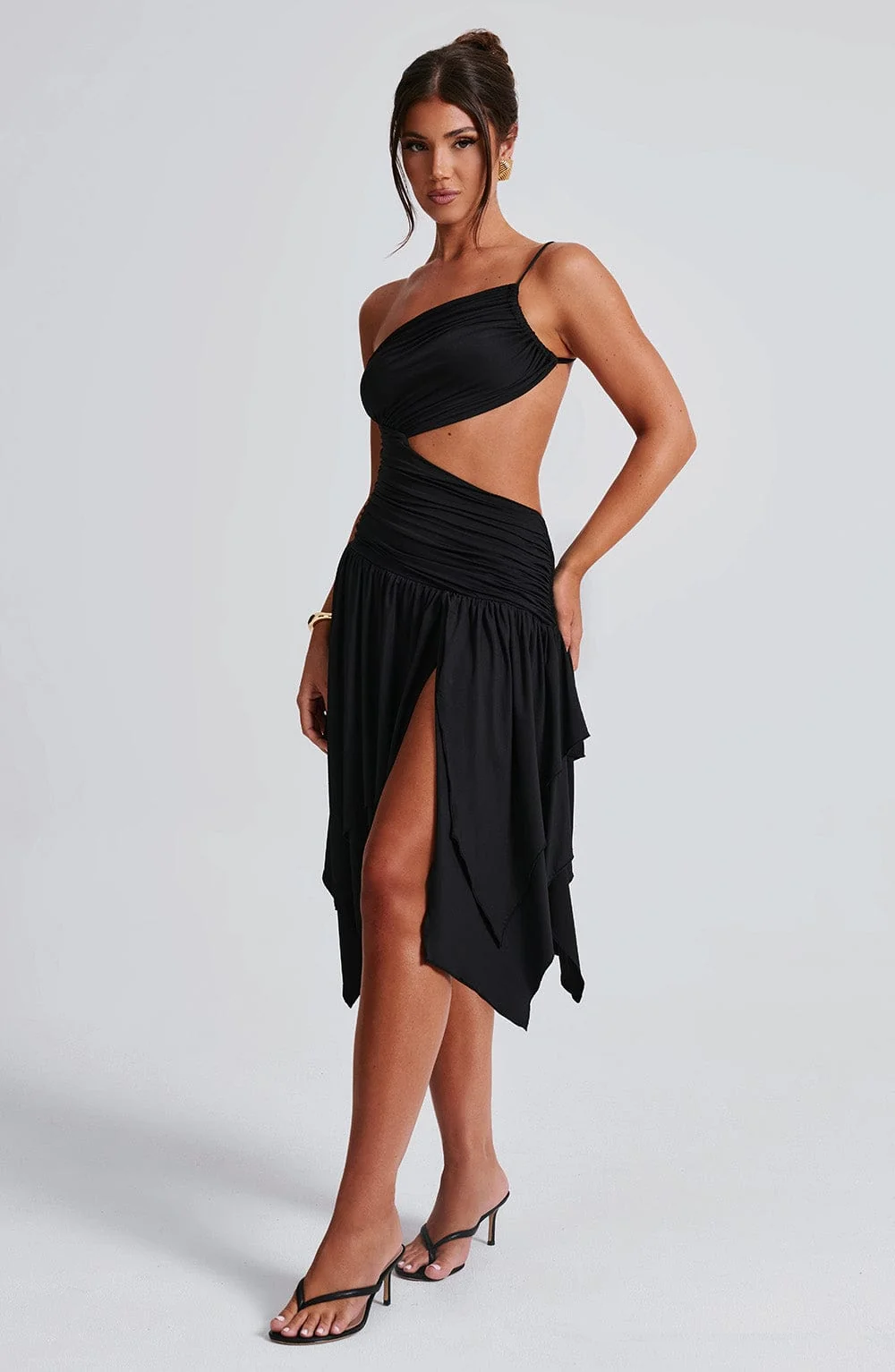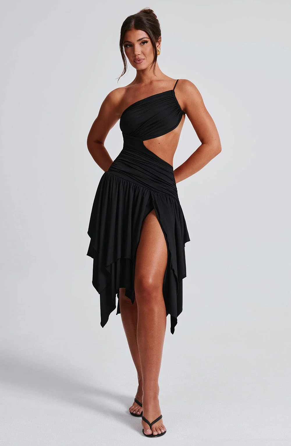 Upgrade your wardrobe with the Emeline Midi Dress in Black by DIA. Crafted from premium slinky jersey, this figure-hugging bodycon dress features an asymmetric one-shoulder neckline and a handkerchief-style hem for a chic silhouette. The adjustable strap and ruched details add a touch of elegance, making it perfect for any occasion. Embrace your curves with confidence and style. This dress is fully lined, double-layered, and designed for a comfortable yet alluring fit. Get ready to turn heads and make a statement wherever you go!