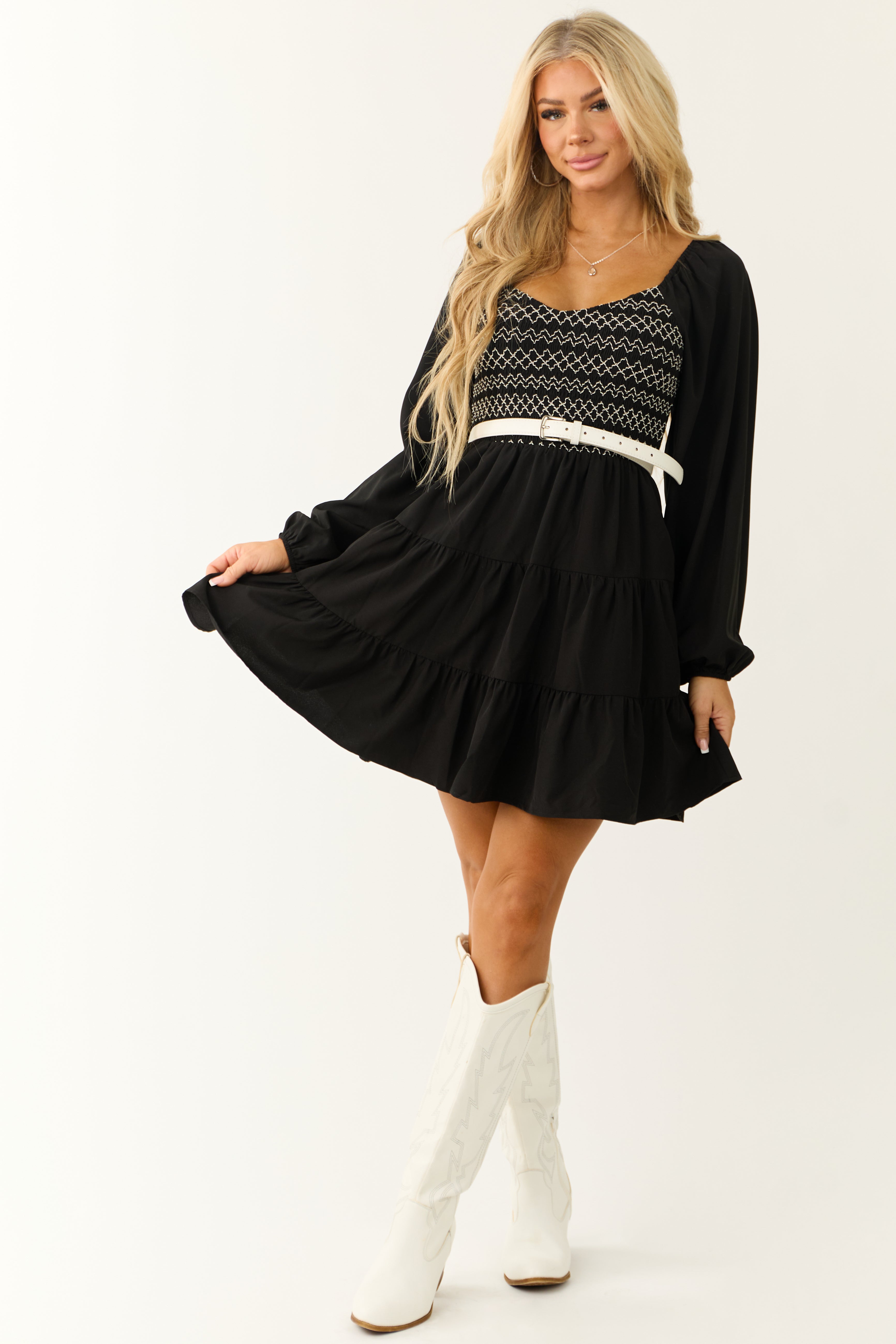 This chic black mini dress features a smocked design with a sweetheart neckline, long puff sleeves, and a tiered skirt. Crafted from non-stretchy woven fabric with ivory contrast stitching, this dress is perfect for daytime occasions. The drop waist and side pockets add both style and functionality. Available in sizes S, M, and L. Length varies from 32.5″ to 33.5″. Belt not included. Hand wash cold. Model is wearing a size Small. Suitable for women looking for a stylish, elegant dress.