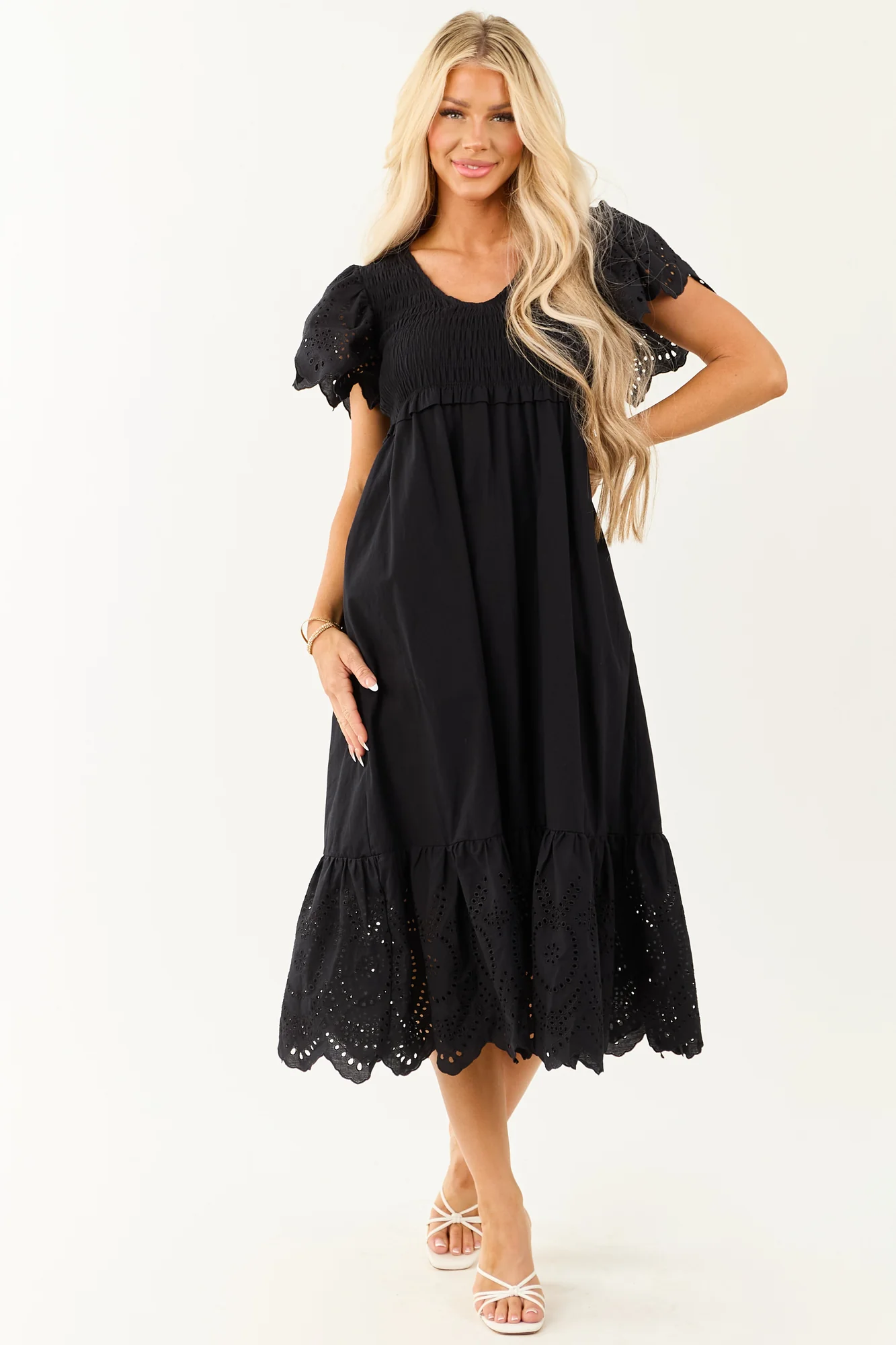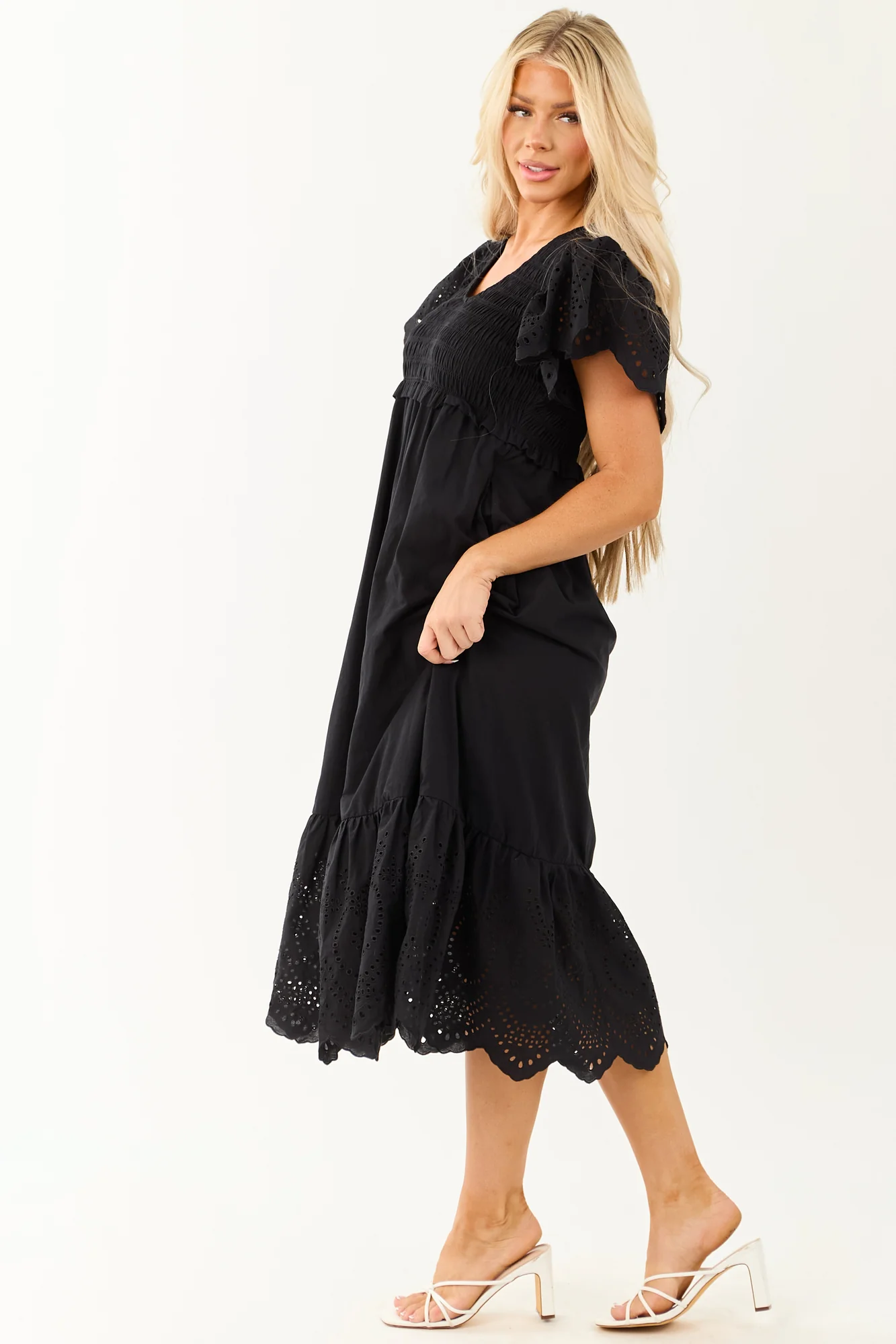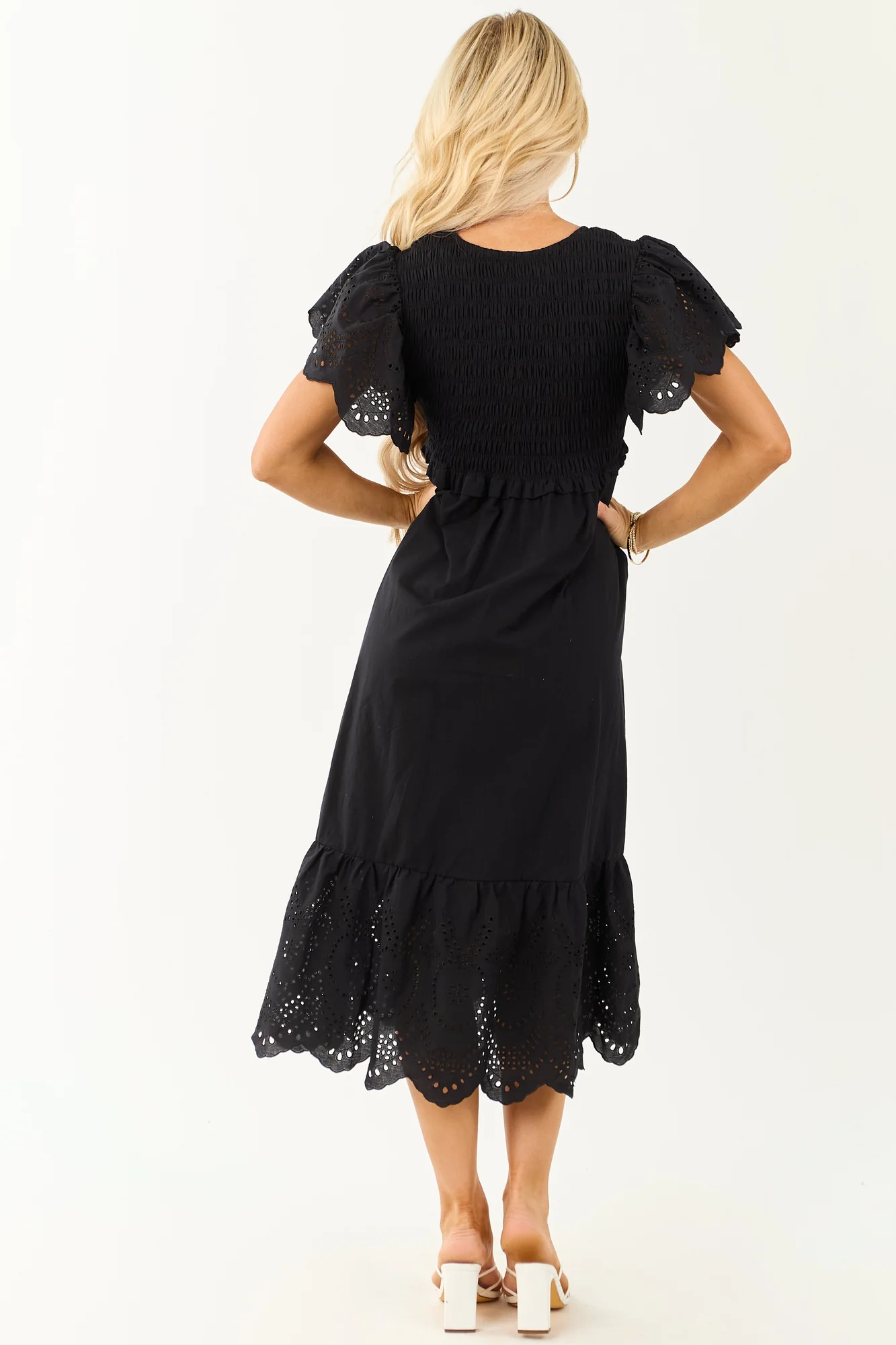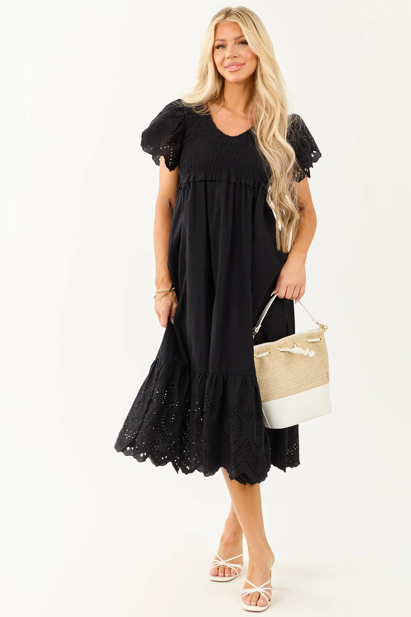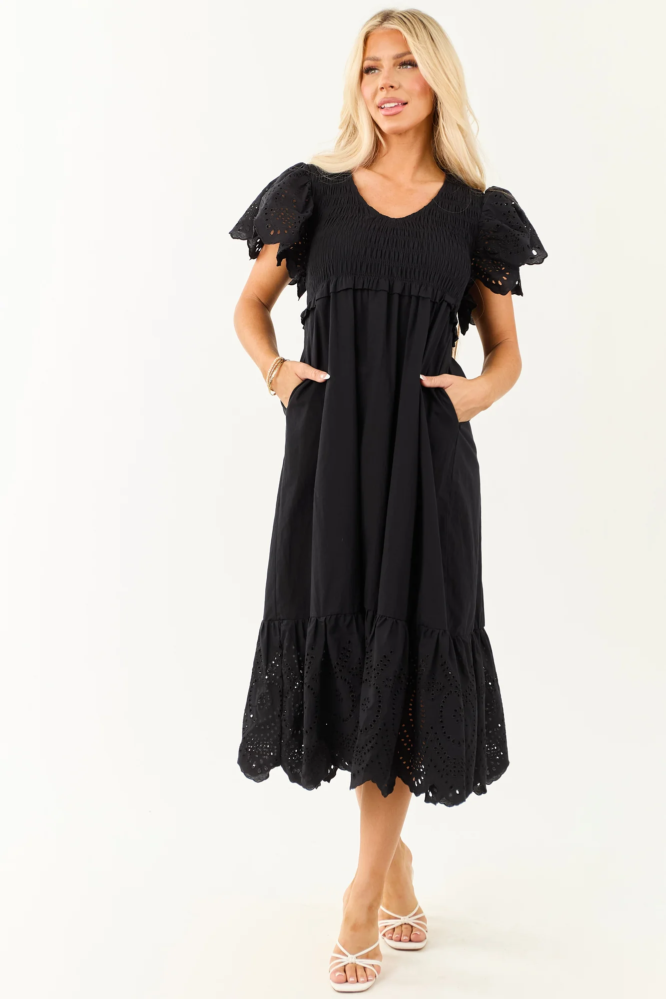 Find comfort and style in this black cotton midi dress x GeeGee. Ideal for outdoor picnics or leisure strolls, it features a stretchy smocked bodice, charming eyelet lace hem and sleeves, and flattering ruffle cap sleeves. The V-neck design and lined finish add elegant touches to this non-stretchy lightweight dress. Elevate your wardrobe with this versatile piece that fits true to size.