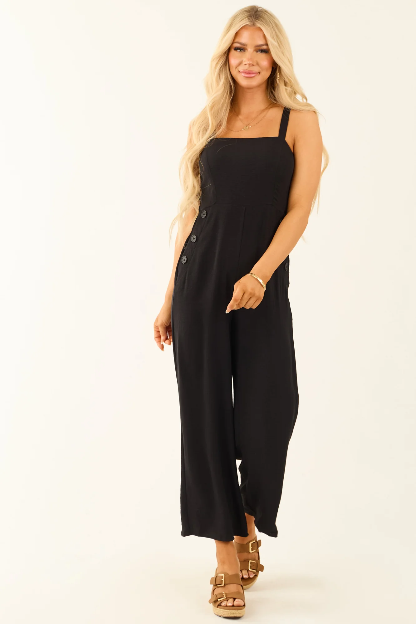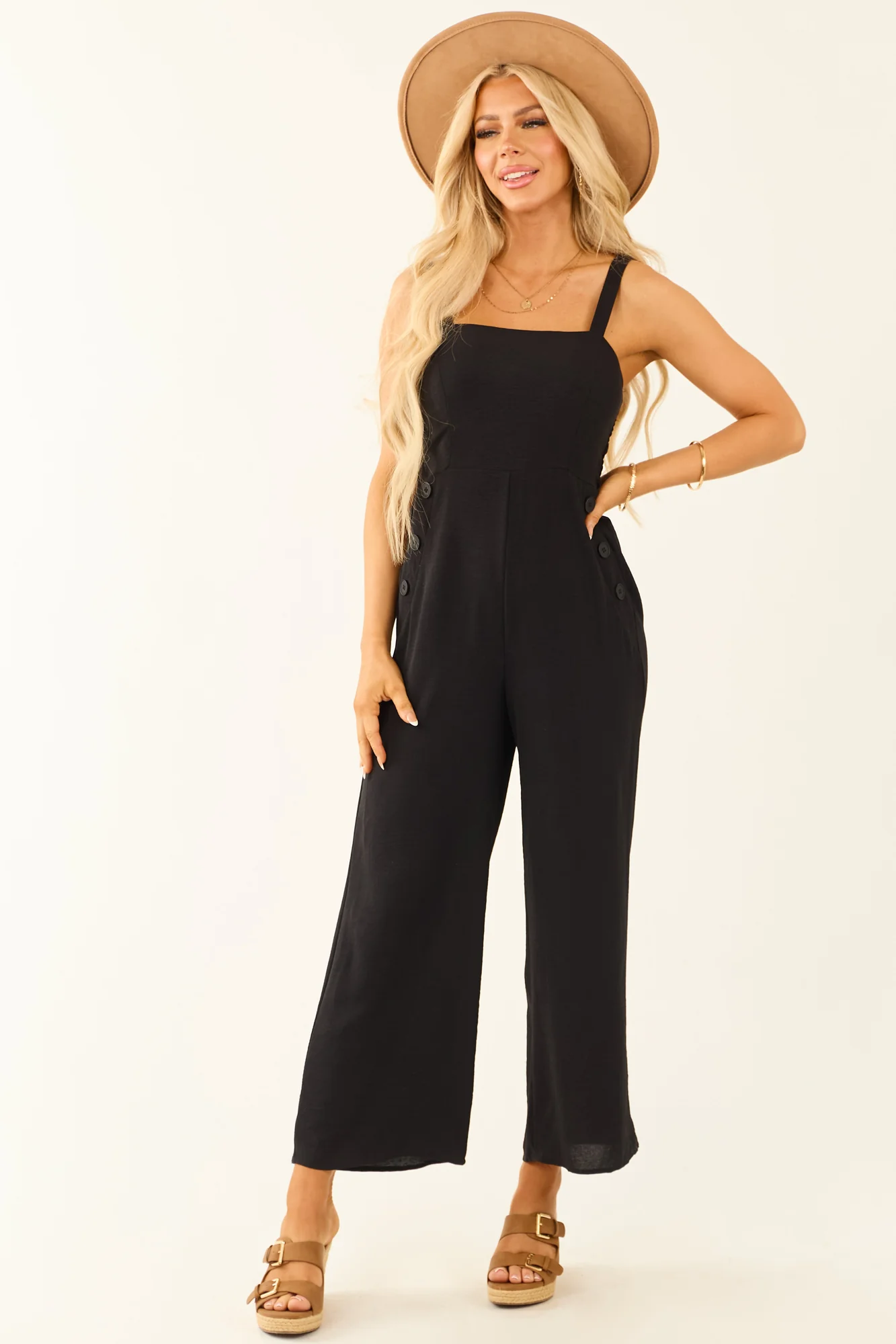 This trendy jumpsuit features a square neckline, smocked back, adjustable straps, and faux pockets with button details. Made of 100% polyester, it offers a sleek and stylish look. Stay comfortable and chic all day long in this non-stretchy woven jumpsuit. Ideal for both spring and summer seasons. Available in sizes S, M, and L, with torso lengths ranging from 29.5″ to 31.5″. Hand wash and dry flat for maintenance. Elevate your wardrobe with this versatile piece.