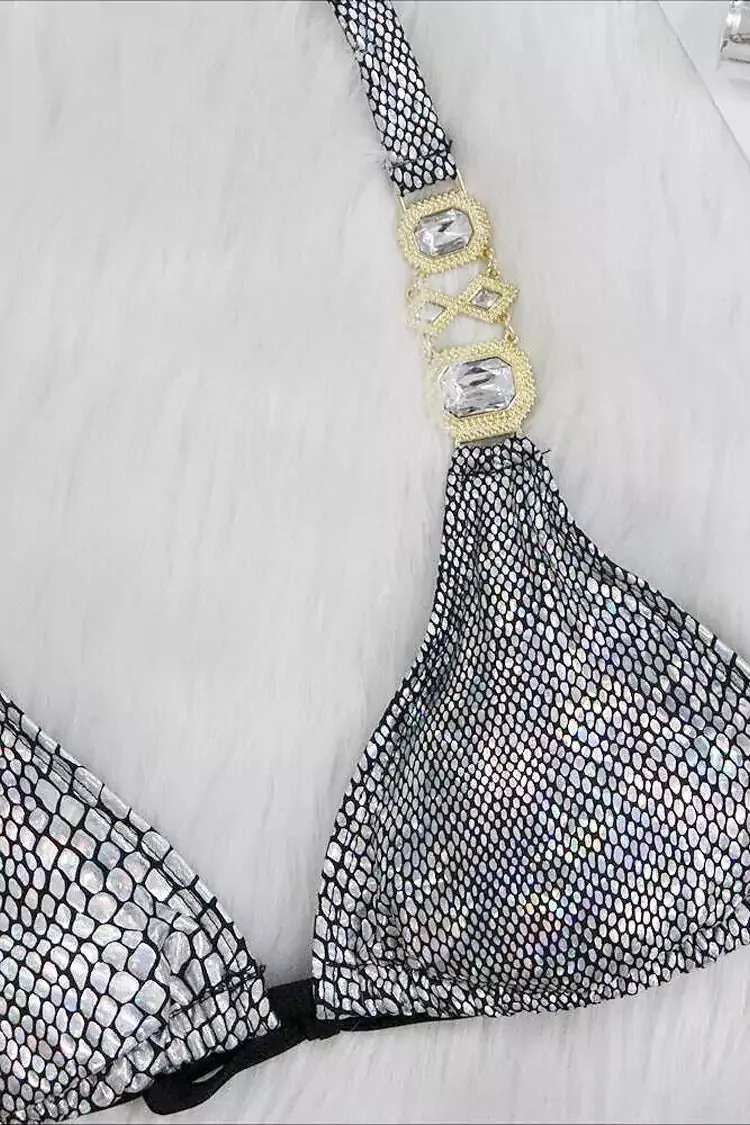 Make a statement with our Oliay Black Snake Pattern Bikini featuring crystal chain link accents for a sexy and glamorous look. Crafted from a comfortable blend of 80% nylon and 20% polyester fiber, this bikini offers adjustable straps and tie-back closure for a perfect fit. The briefs also boast crystal chain embellishments. The snake print design adds a touch of wild style, making it the perfect choice for beach and pool parties. This bikini comes in three elegant sizes (S, M, L) to fit your body just right. Whether youre lounging by the pool or catching some waves, this bikini will keep you stylish and confident. Please refer to our size chart for the best fit. Experience the ultimate in chic swimwear with our Oliay collection.