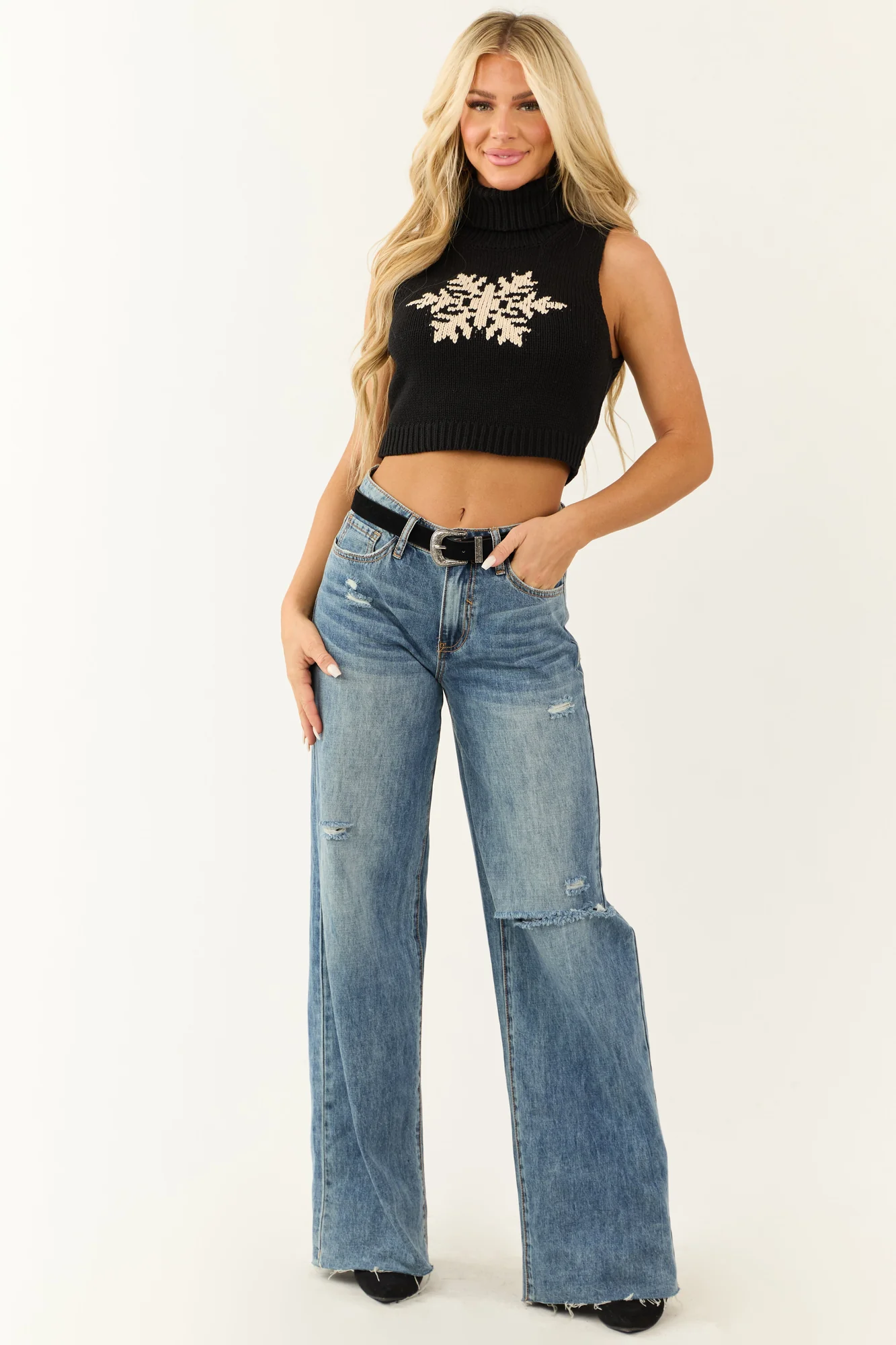 Stay cozy and stylish with our Black Snowflake Knit Sleeveless Turtleneck Sweater Tank. Crafted from a stretchy ribbed knit blend of 60% Cotton and 40% Acrylic, featuring an Intarsia Snowflake design in Cream. This crop sweater tank comes with a banded hem for a trendy look. Perfect for winter, this top is unlined and available in sizes XS, S, M, and L. Complete the care routine with a gentle hand wash in cold water, lay flat to dry, avoid bleach, and iron as needed. Whether youre out for a daytime occasion or just chilling, this top is a versatile piece for your wardrobe.
