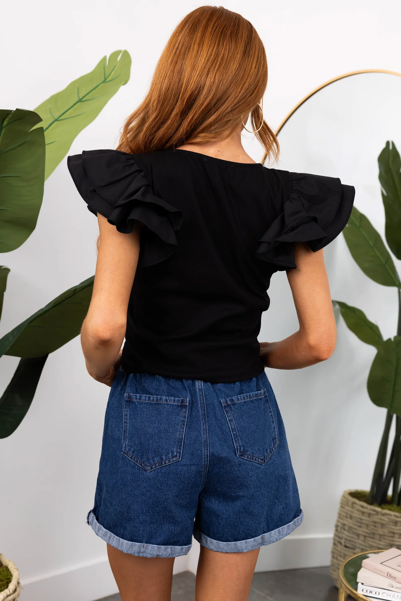 Stay stylish and comfortable in this Black Square Neck Ruffle Sleeve Ribbed Knit Top + Sky. Made from a stretchy ribbed knit with non-stretchy woven sleeves, this fitted top features layered ruffles and a slight crop for a trendy look. Perfect for daytime or party wear, this top is unlined, made from 79% Cotton, 18% Polyester, and 3% Spandex. Make a fashion statement effortlessly!
