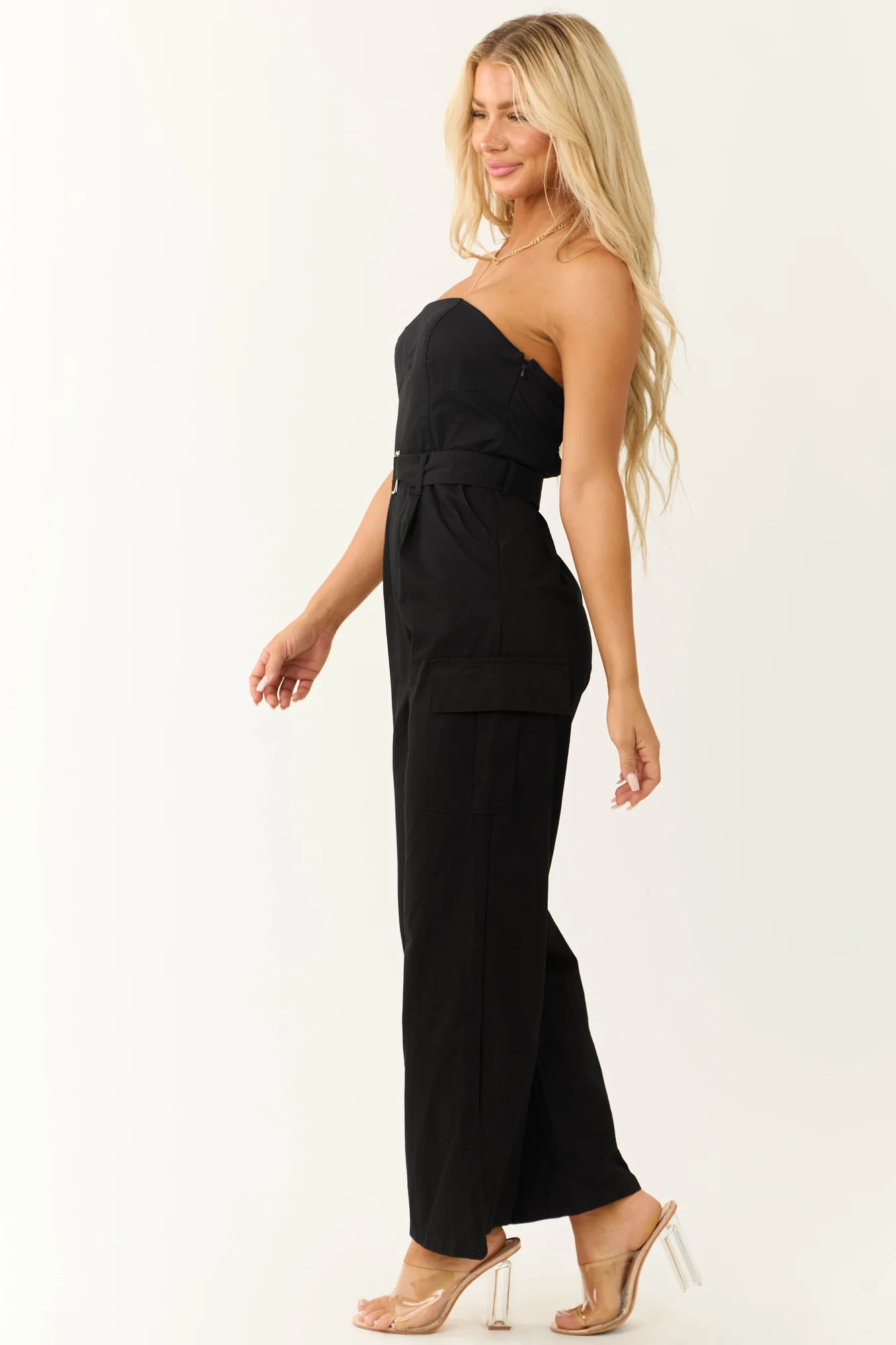 This black strapless cargo jumpsuit features a belt detail for a stylish look. Available in sizes S, M, and L with non-stretchy woven fabric, seam details, adjustable belt, belt loops, 4 pockets, wide legs, smocked back, side zipper, and torso lining. Made of 100% cotton with 100% rayon lining. Perfect for fall season. Hand wash cold, hang dry. Model is 57″ wearing a size Small.