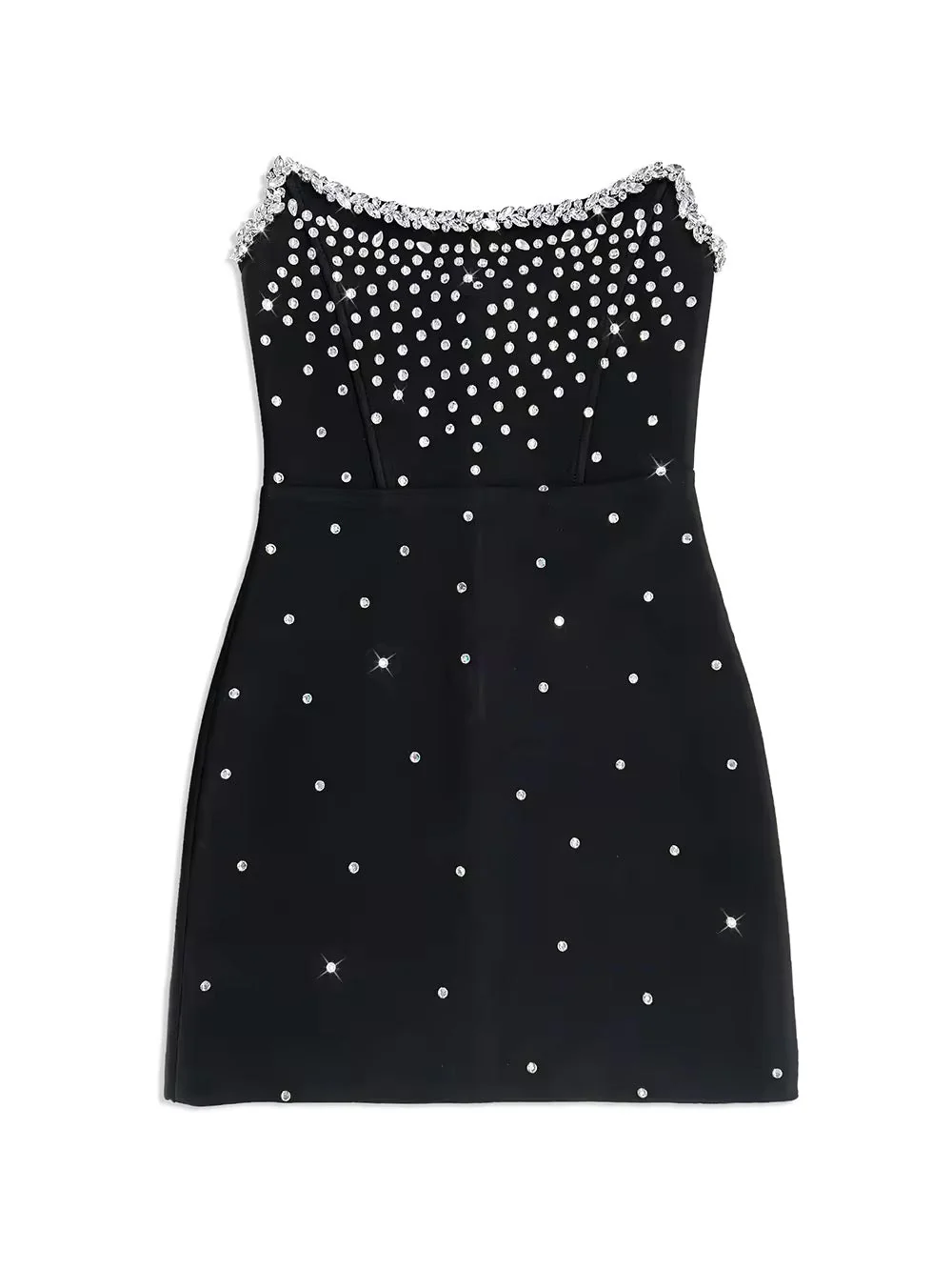 This high-quality black bandage mini dress is designed to contour your curves beautifully. The strapless style exudes elegance, while the diamond embellishments add a touch of glamour. Made of 90% Rayon, 9% Nylon, and 1% Spandex, it offers exceptional elasticity, durability, and wrinkle resistance. Carefully crafted with top-quality materials and detailed stitchwork, this dress is a perfect choice for parties and nights out, ensuring you feel confident and stylish all night long. Color may vary due to image lighting.