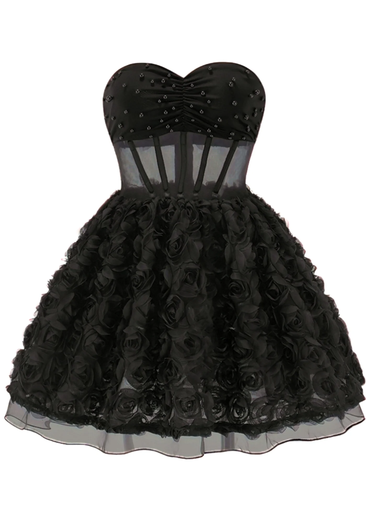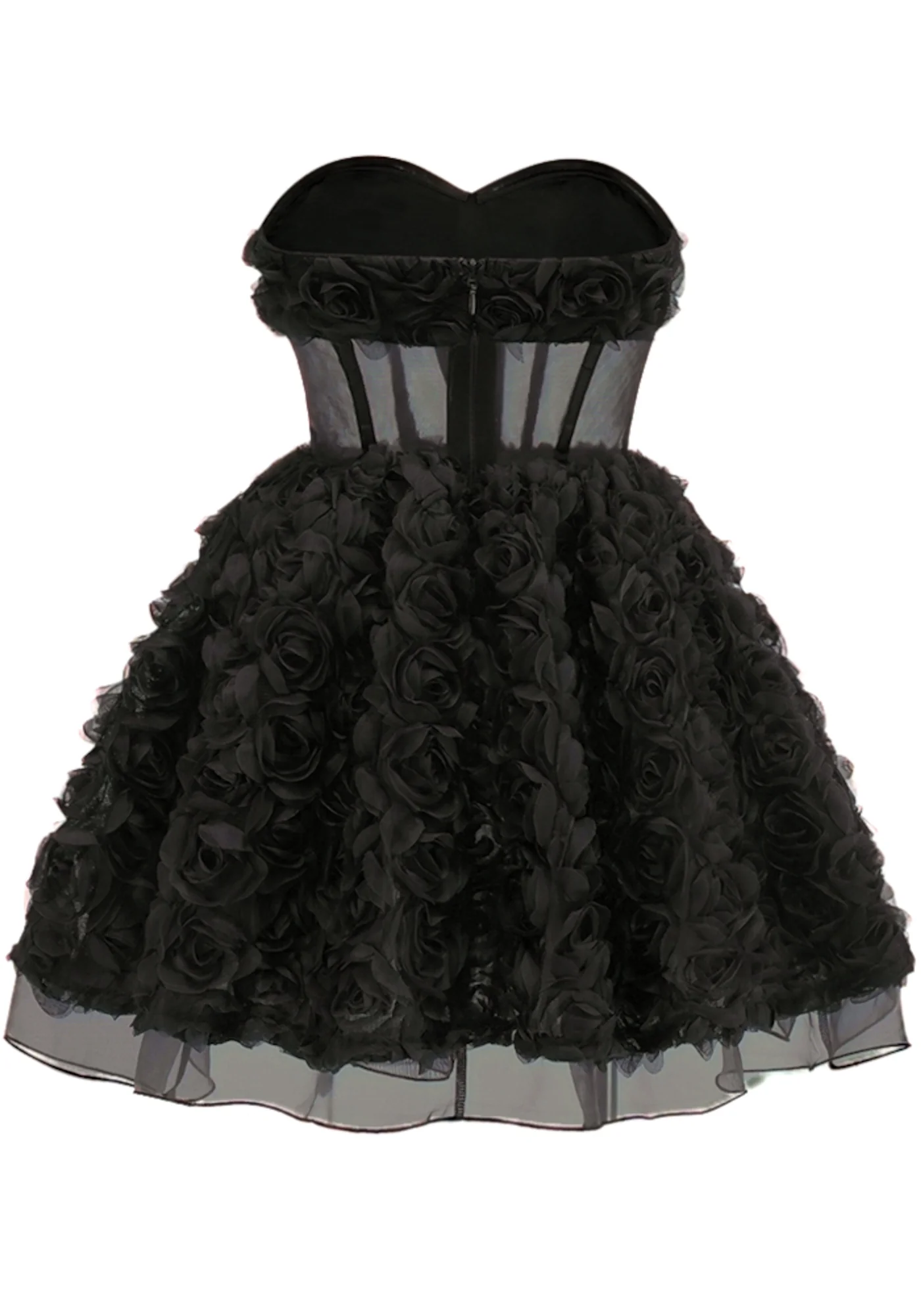 This black strapless mini dress features intricate floral details and an elegant A-line design. Made from a premium blend of Polyester and Cotton, this dress ensures high quality and durability. The sleeveless dress includes a concealed YKK zipper for a reliable closure. Care instructions: Gentle Dry Clean Only. Length: Above knee. Enhance your wardrobe with this chic and timeless piece. Please note that color may vary due to lighting. Package includes product images without a model, offering the truest representation of the item.