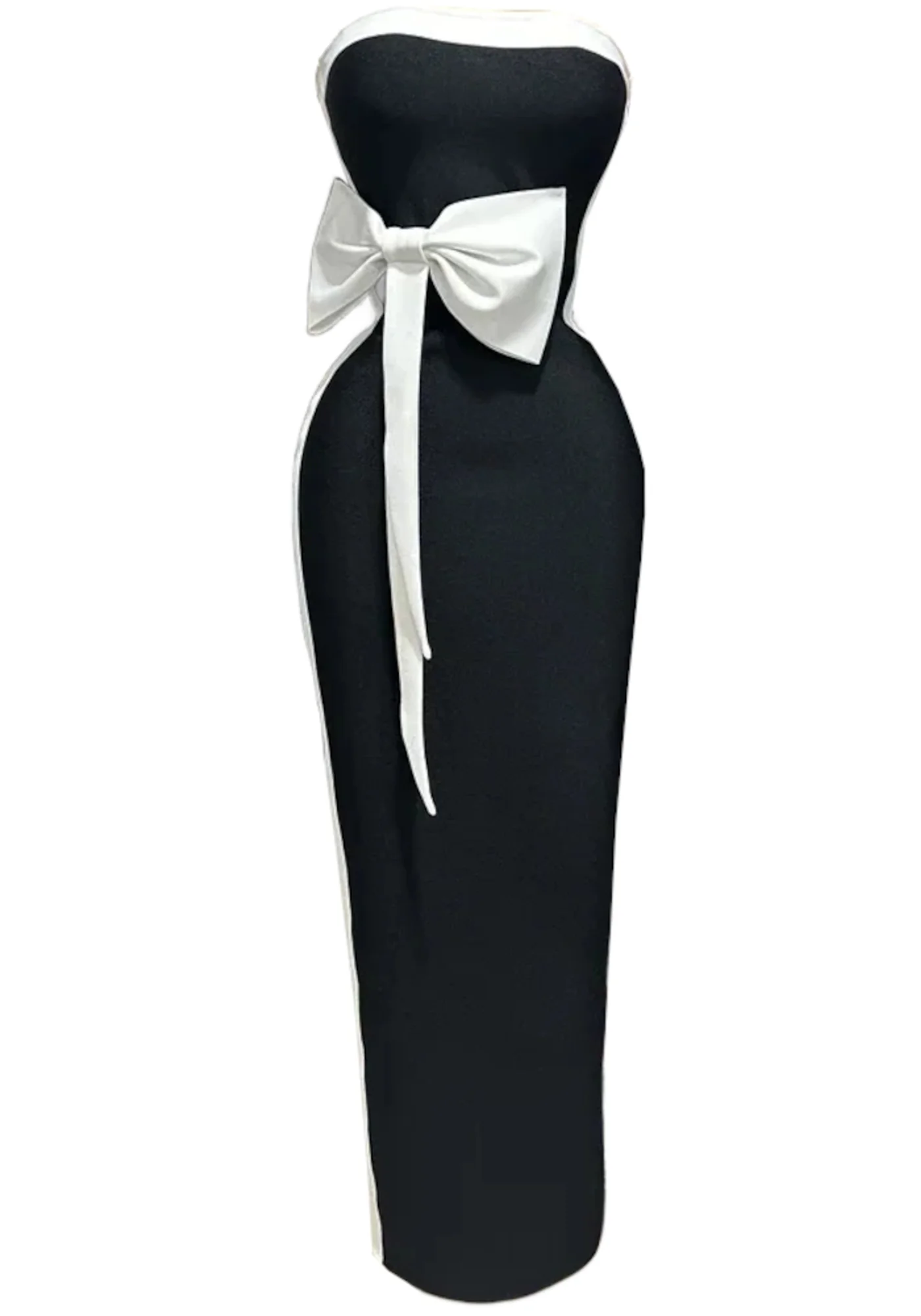 This stunning black strapless maxi dress features a chic bow detail and colorblock design for a classy look. Made from 90% Rayon, 9% Nylon, and 1% Spandex, this dress is not only elegant but also durable and wrinkle-resistant. The high elasticity ensures a perfect fit, while the YKK zipper guarantees long-lasting quality. Carefully crafted with delicate sewing and hemming, this dress is a must-have for your wardrobe. Follow the care instructions for lasting beauty. Say goodbye to color variations with our true-to-life product images.