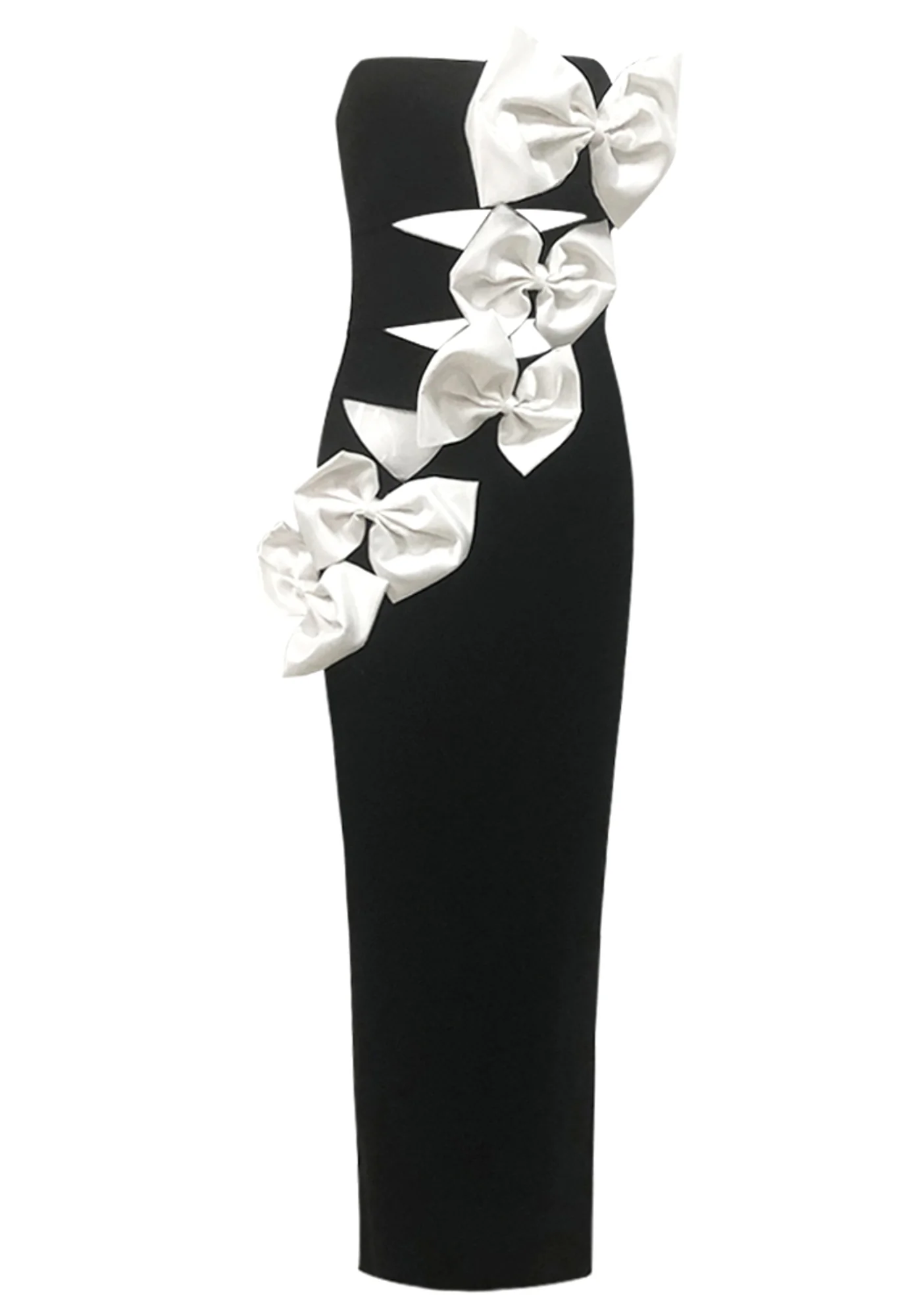 This stunning black maxi dress features a strapless, sleeveless design with a chic bow detail and cut-out accents. The dress is crafted with a concealed zipper at the back for easy wear. Gentle dry clean only. Please note that the color may vary slightly due to lighting. Our size chart ensures the perfect fit, so follow it closely for the best results. Embrace elegance and sophistication with this maxi dress.